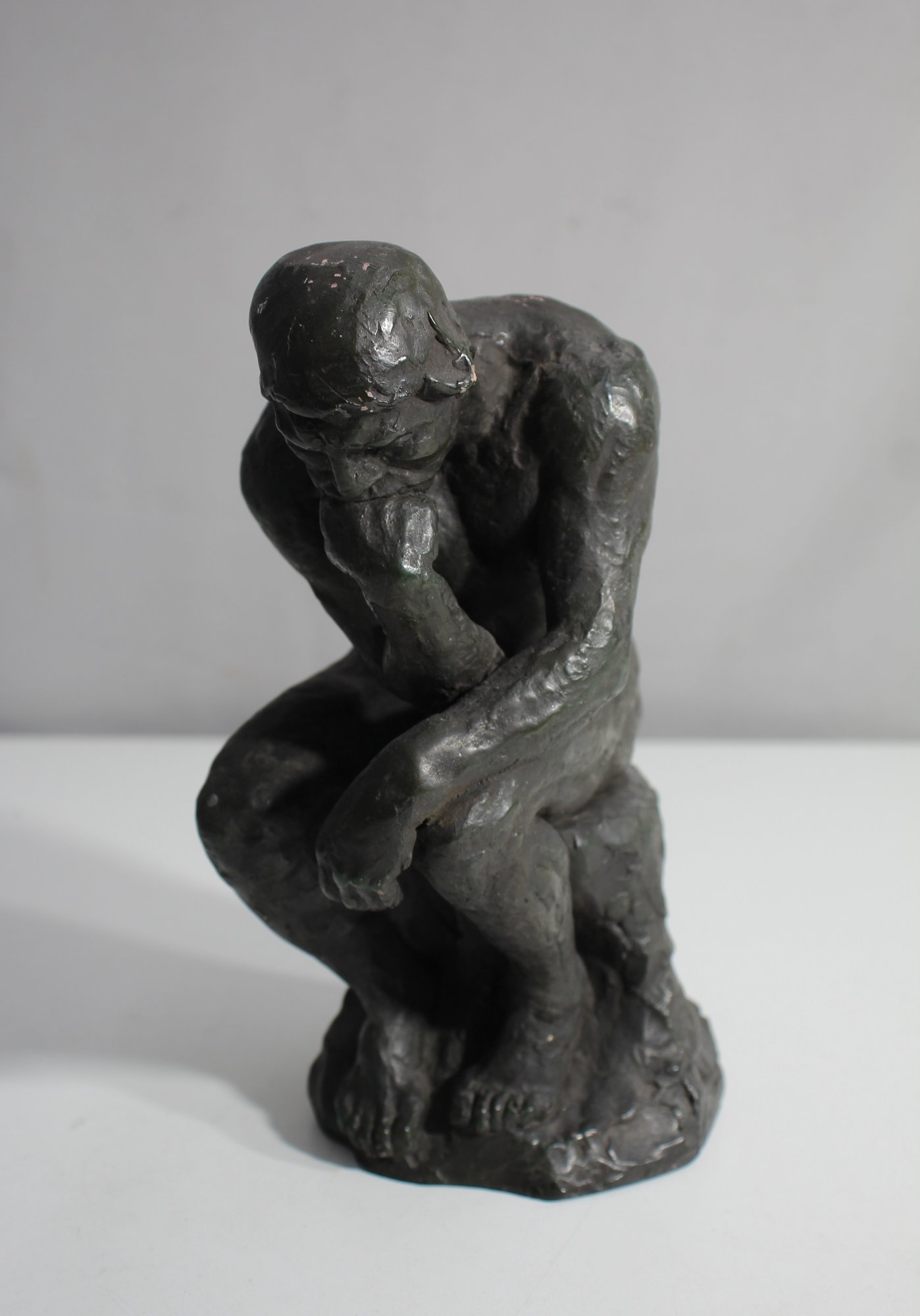 vintage reproduction of Auguste Rodin's famous sculpture, The Thinker. The statue depicts a seated male figure deep in thought, with his chin resting on his hand. The piece is rendered in a bronze-like finish that beautifully captures the intricate details of the original, including the musculature, facial expression, and textured surface.The sculpture has a dark, patinated finish resembling bronze, though it is likely made from a more lightweight material (resin or composite).
