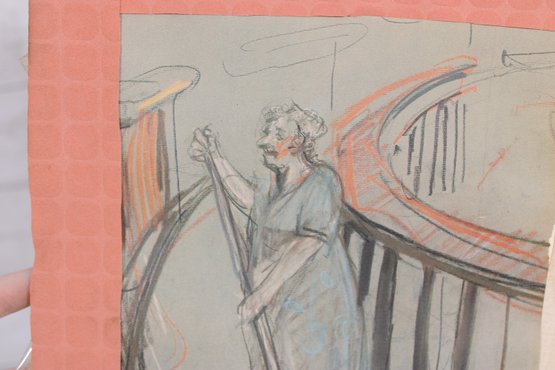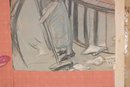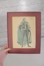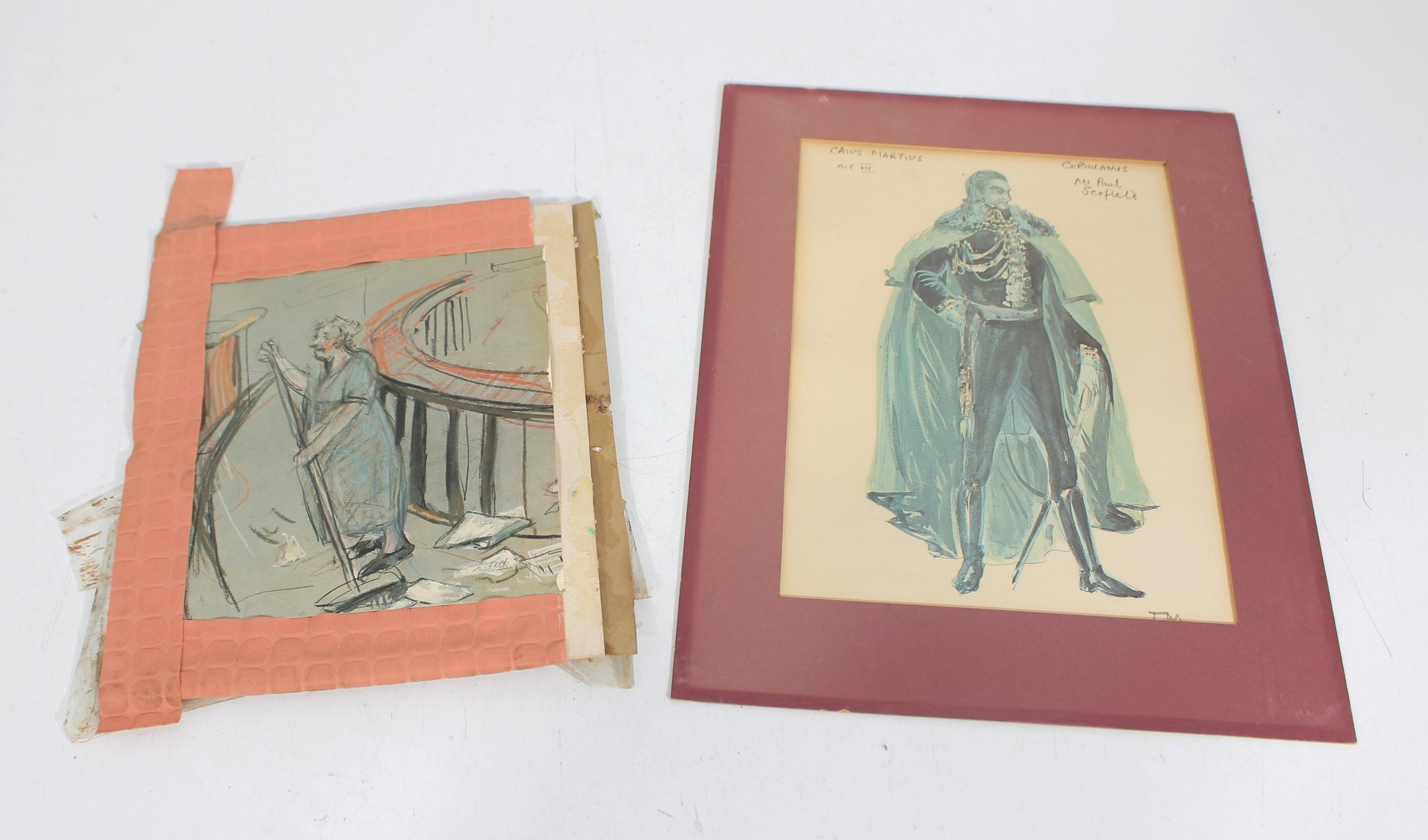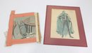 a unique lot of two vintage theatrical costume design artworks, including one framed finished illustration and one original sketch study. These pieces appear to be related to stage or opera costume design, featuring detailed figural renderings with expressive linework and soft color application.
