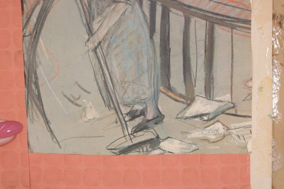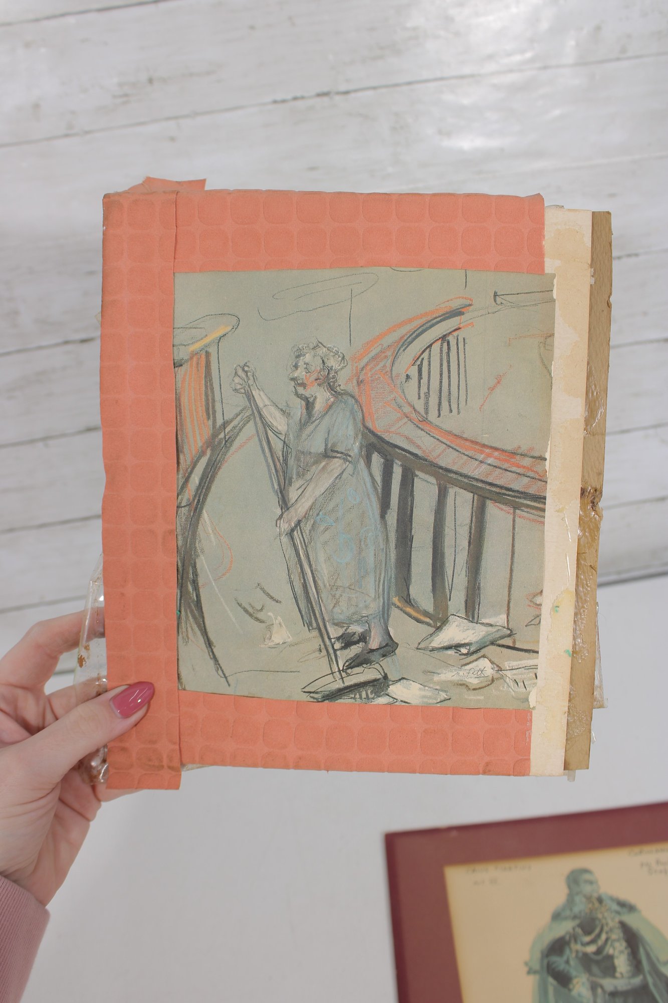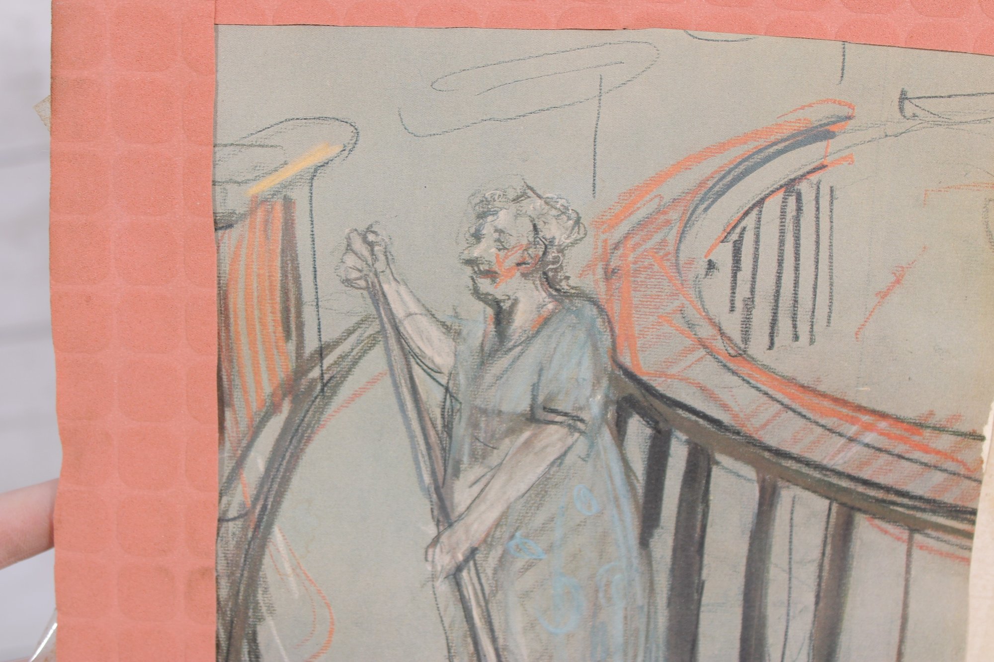 The accompanying unframed piece is an original sketch showing a robed figure holding a staff, rendered in pencil and watercolor with visible construction lines and artistic notes—offering a glimpse into the creative process.