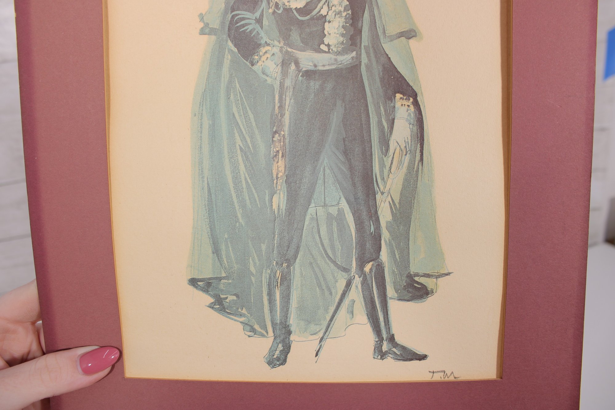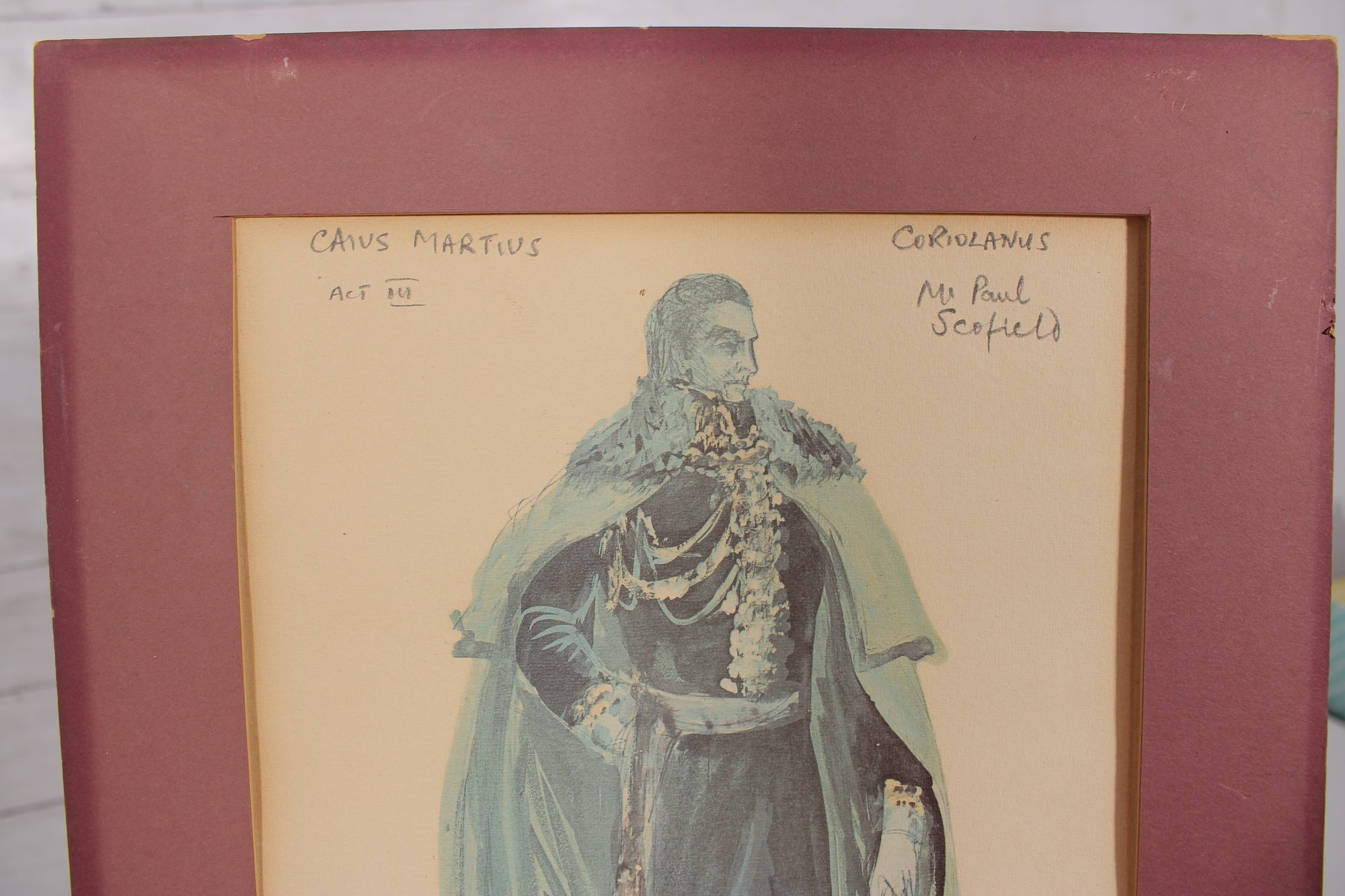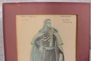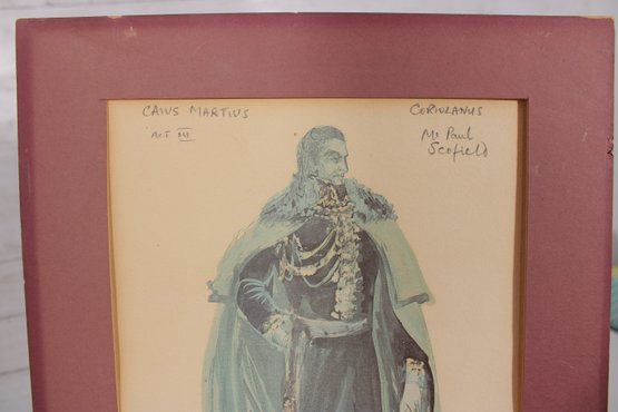 The framed piece depicts a full-length male figure in elaborate costume, complete with draped cape and decorative elements. Handwritten notations are visible near the top (including “Charles Mathews” and what appears to reference a role or production), adding historical and artistic interest.