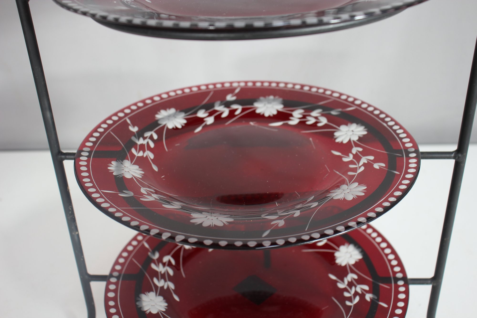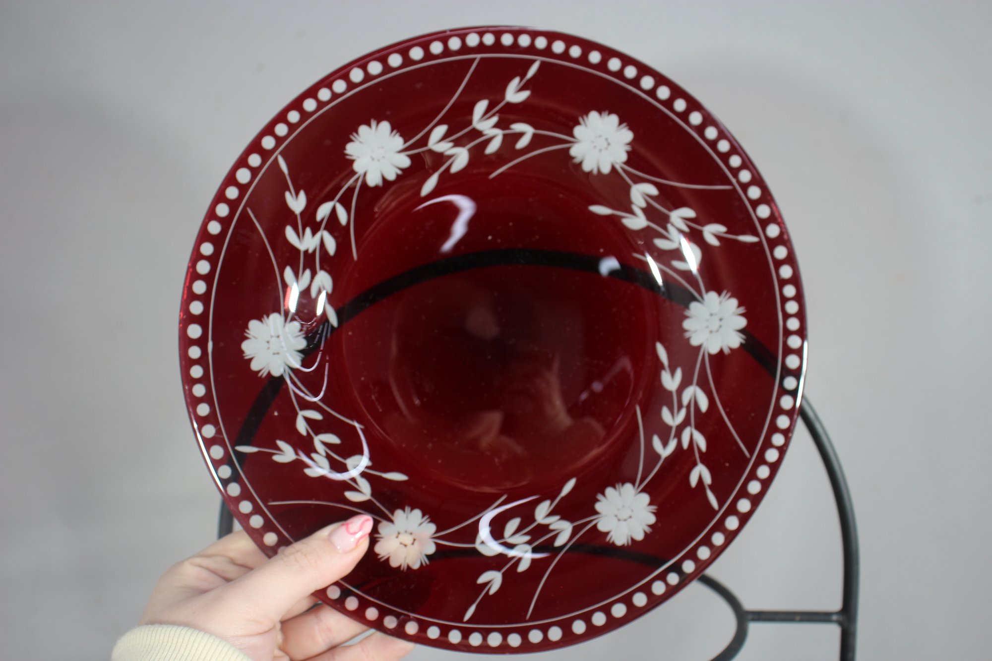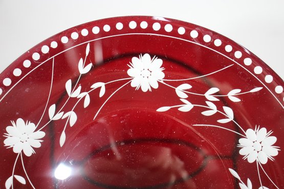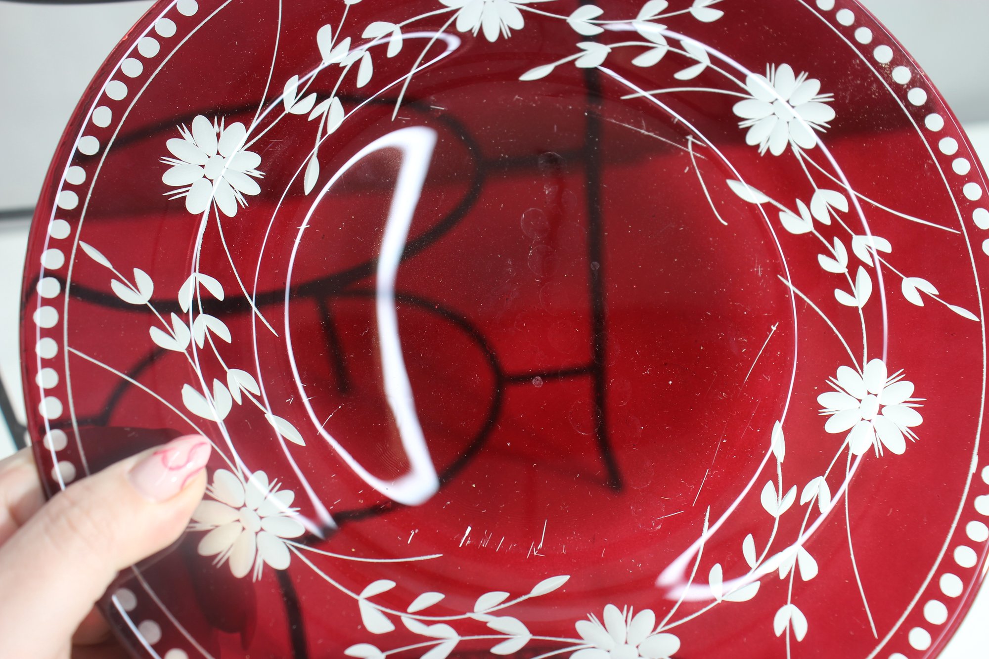 Plates: Set includes three 10-inch round glass plates, featuring an eye-catching ruby red hue with delicate white floral and vine designs, bordered with an intricate dotted pattern.