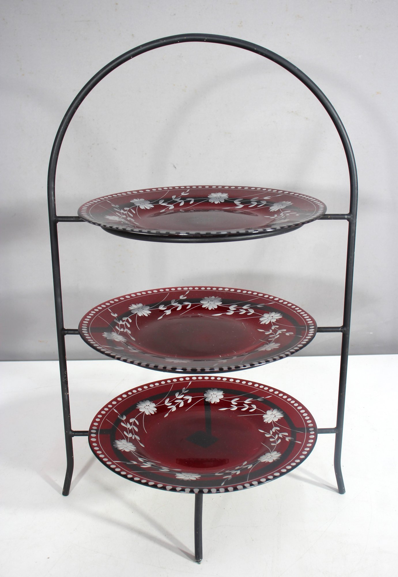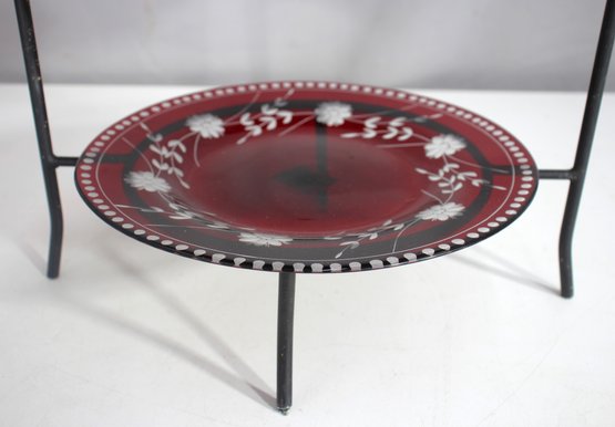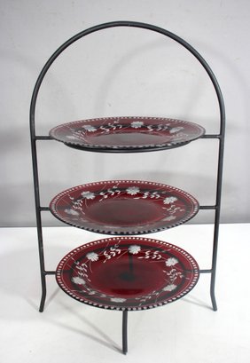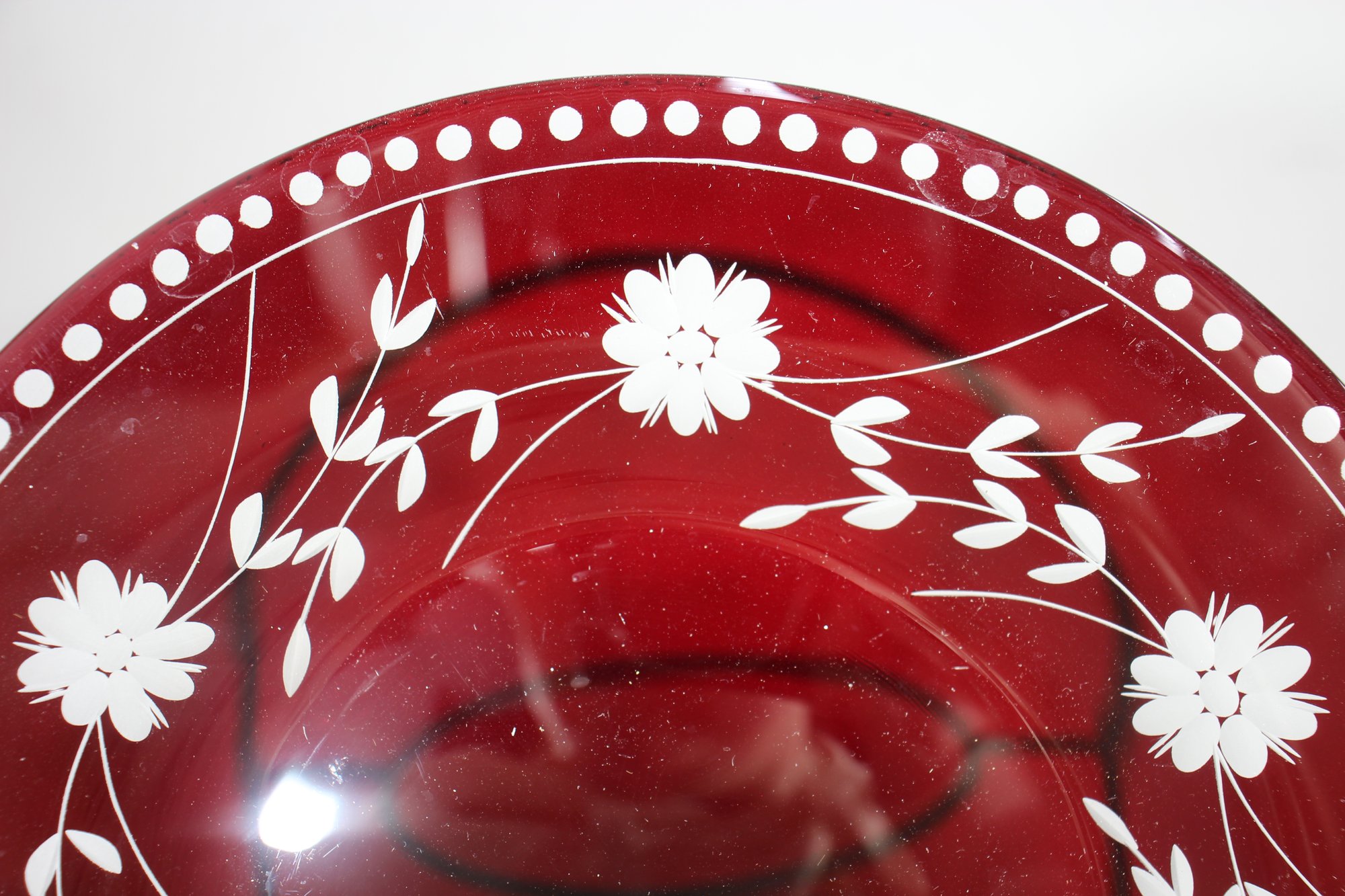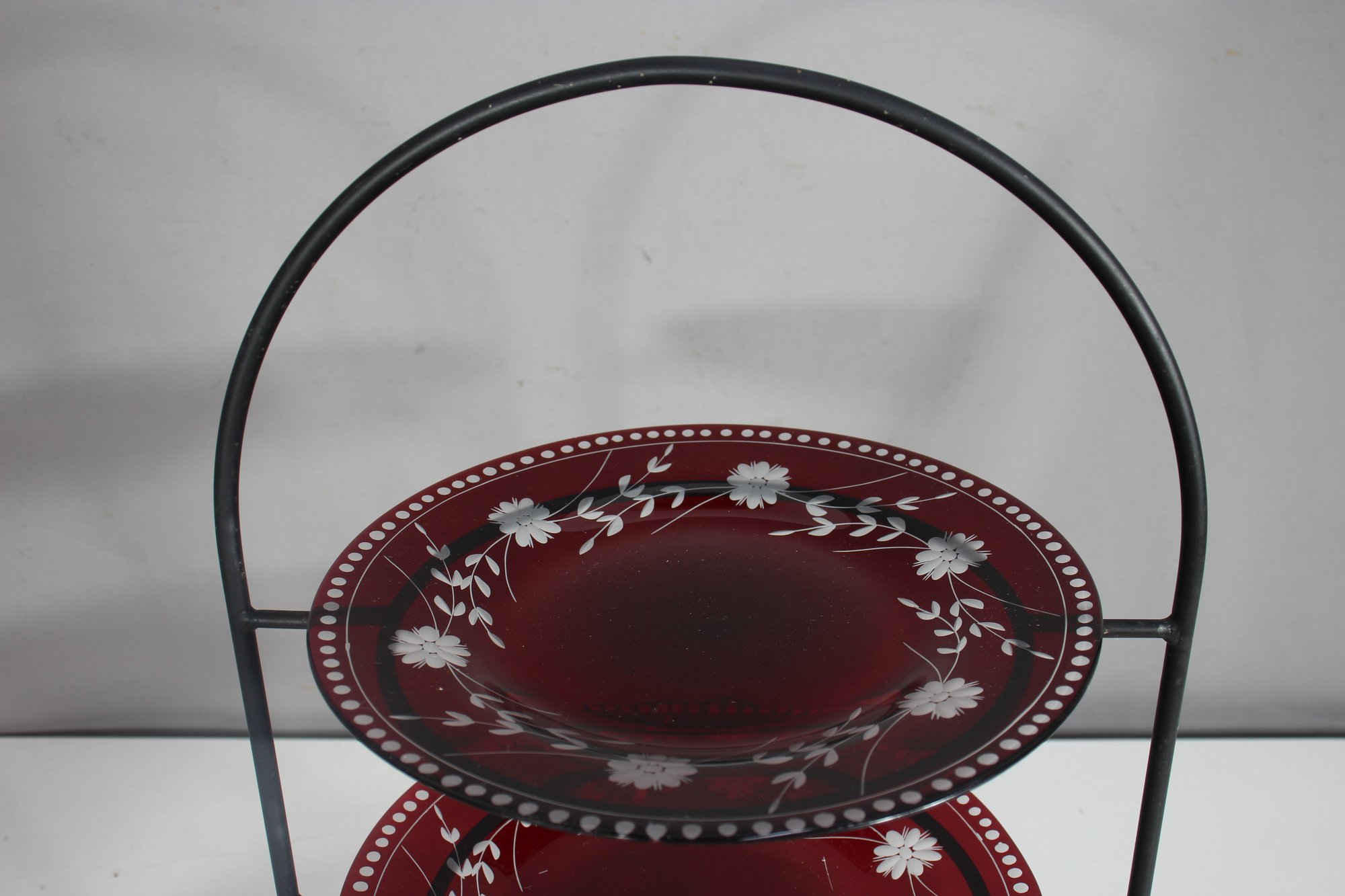 Plates: Set includes three 10-inch round glass plates, featuring an eye-catching ruby red hue with delicate white floral and vine designs, bordered with an intricate dotted pattern.