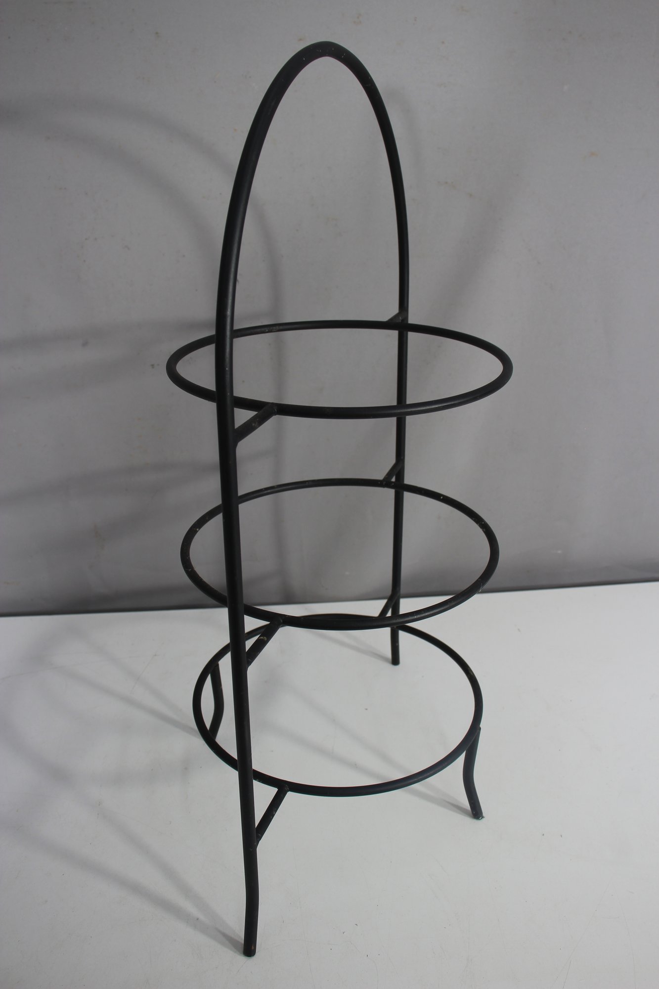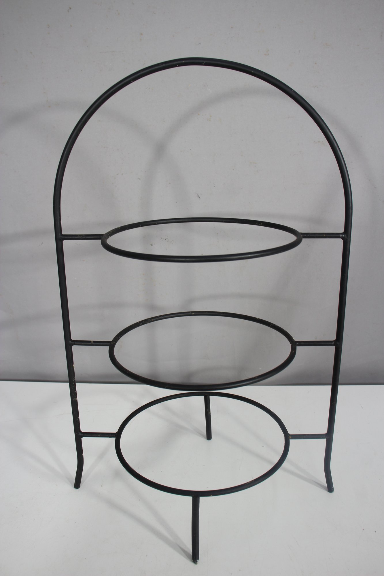 Stand: Sturdy black metal frame with a sleek arched handle for easy mobility and an open-frame design to highlight the beauty of the plates.