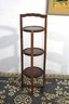 This elegant vintage three-tier wooden plant stand features beautifully crafted round shelves with intricate geometric inlay patterns, adding an artistic touch to each level. The stand has a rich, warm finish and a classic design, with gently curved sides and a scalloped top edge. Ideal for displaying plants, decorative items, or collectibles, this versatile stand brings both functionality and charm to any space. A perfect addition for those who appreciate vintage decor or wish to add a refined, timeless piece to their home.