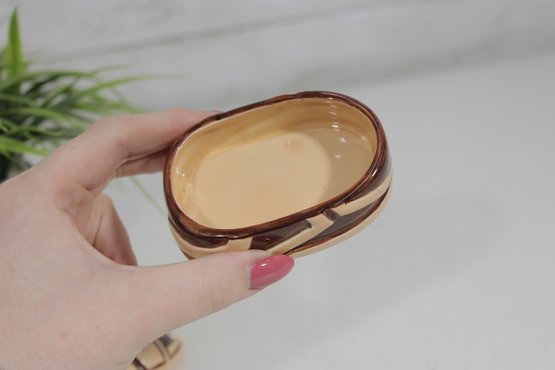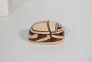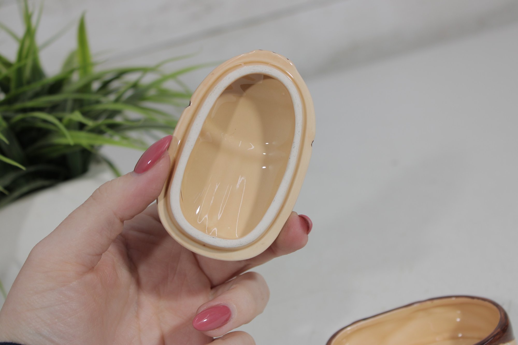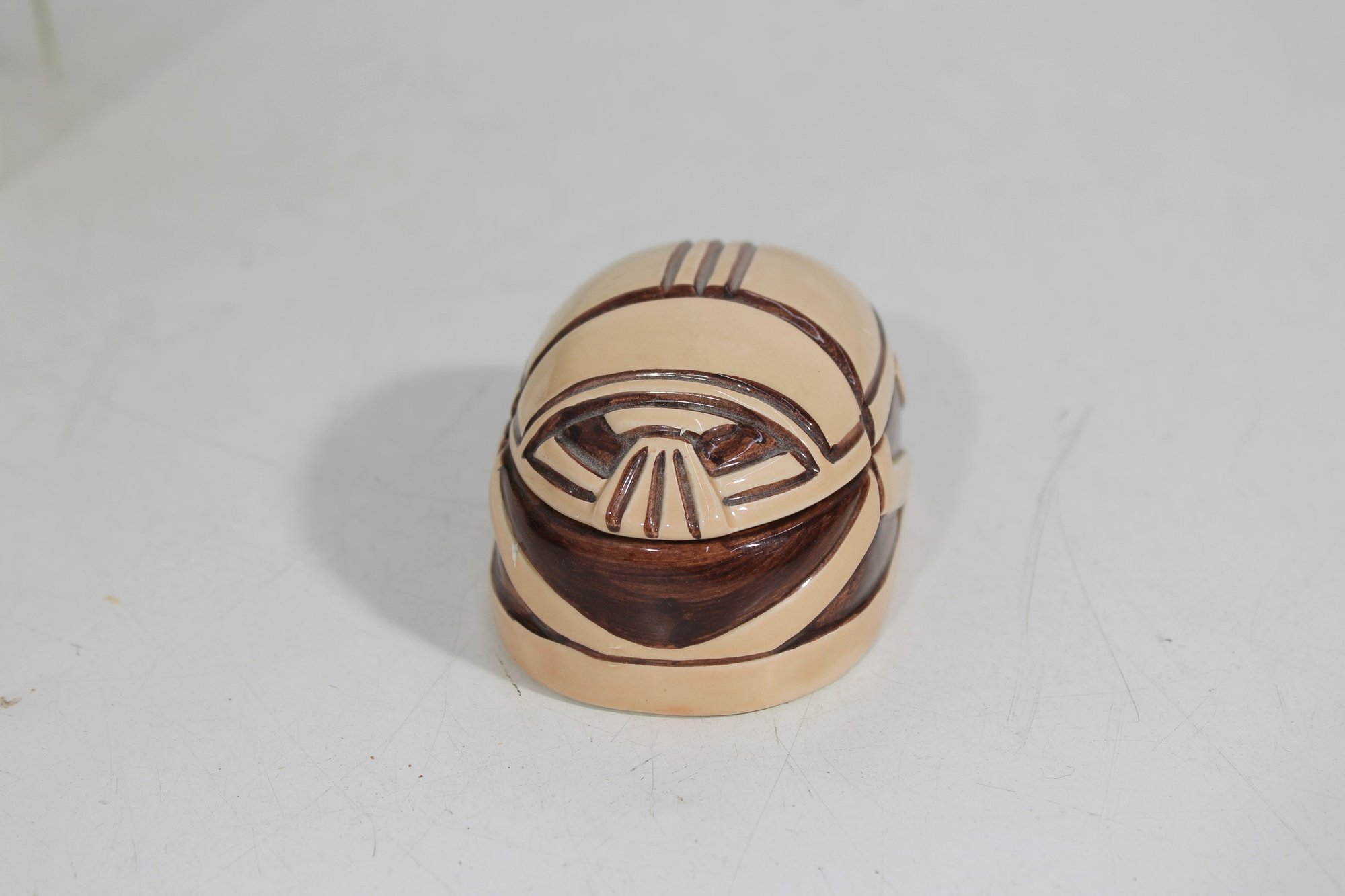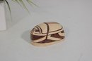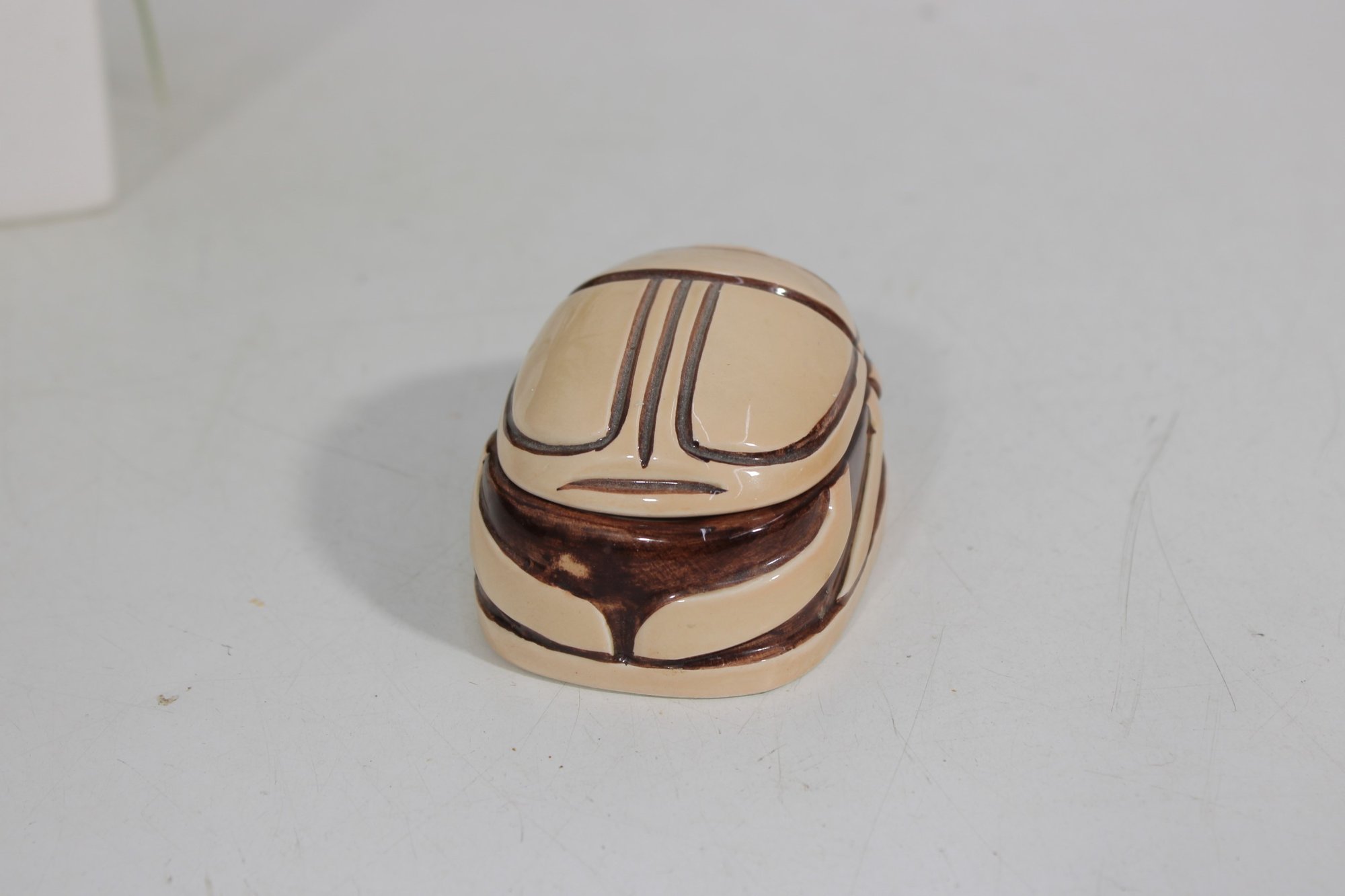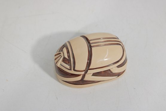 vintage Tiffany & Co porcelain trinket box from 1977, designed in the form of a stylized scarab beetle. This charming piece features a cream-colored base with rich brown geometric detailing, giving it a refined yet distinctive look.