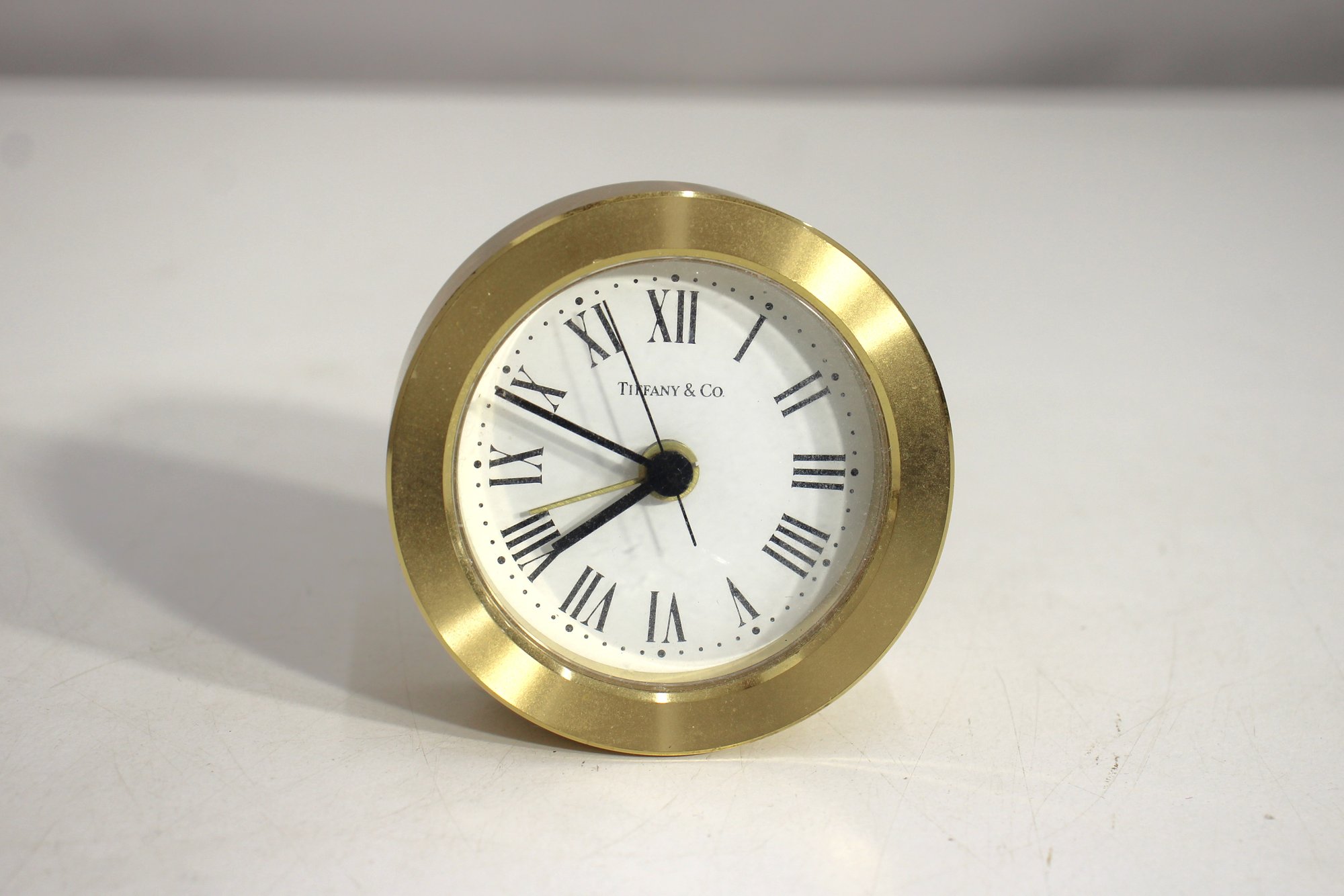 vintage Tiffany & Co. brass desk clock, measuring 3 inches high. This elegant timepiece features a classic white face with black Roman numerals, set within a solid brass case with a smooth polished finish. The back is marked and fitted with adjustment knobs.