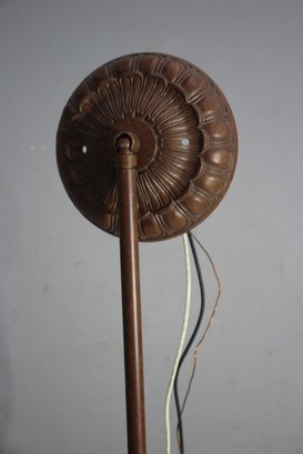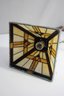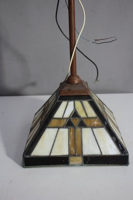this exquisite Tiffany-style stained glass pendant lamp. Featuring a geometric design in warm amber and cream tones with black accents, this lamp exudes classic Art Deco charm. The intricate stained glass shade is complemented by a metal base and pole with a rustic patina finish. Ideal for hanging over dining tables or as a statement piece in any room, this vintage lamp is a true collector's item. The lamp is wired and ready for installation (may require rewiring for modern safety standards). A stunning addition to any decor