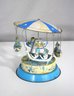this delightful vintage 7” tin wind-up carousel toy, featuring a whimsical space-age theme! Made in Japan, this nostalgic piece showcases brightly lithographed tin construction with astronauts, flying saucers, and space creatures adorning the base and seats.