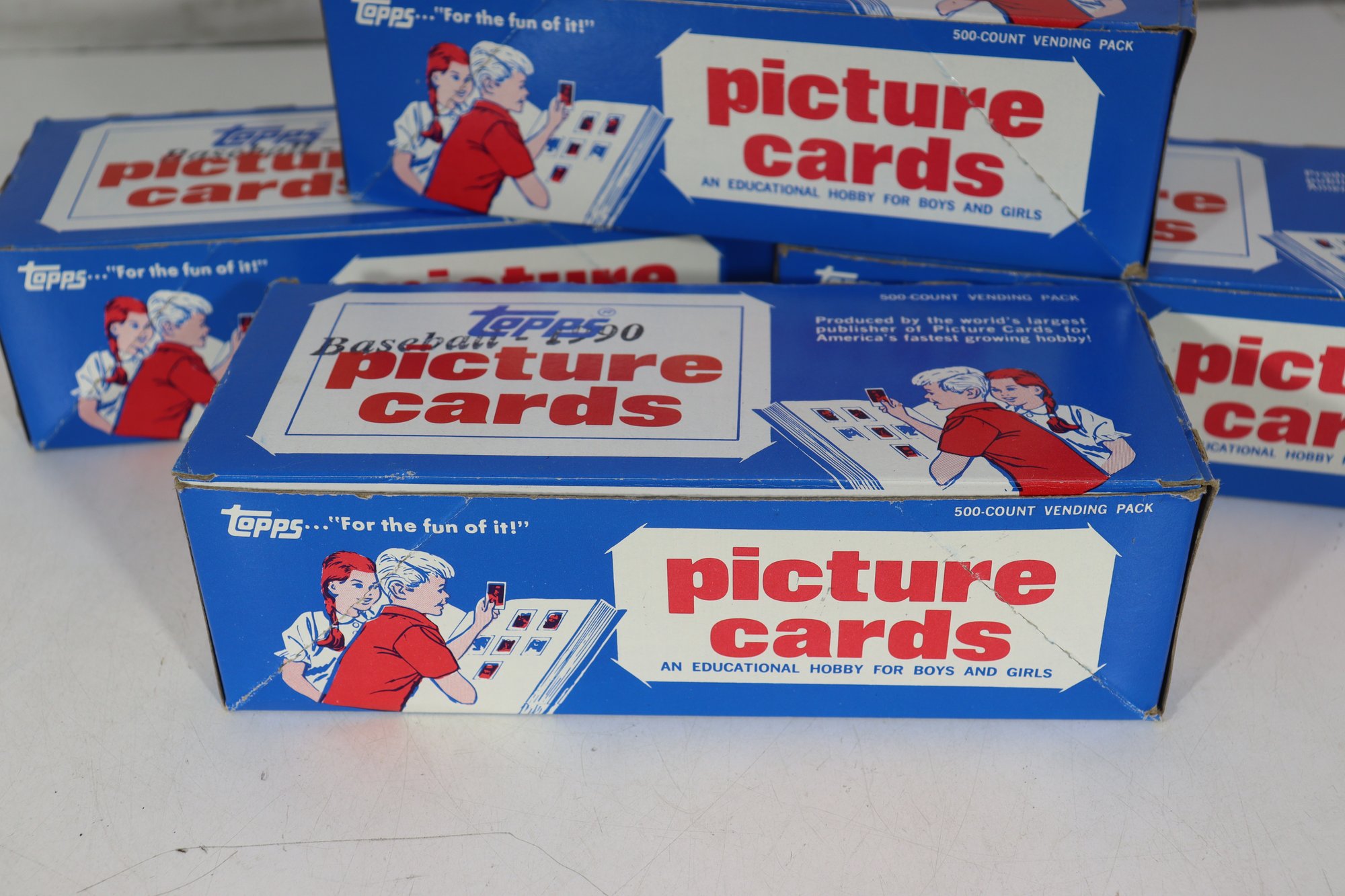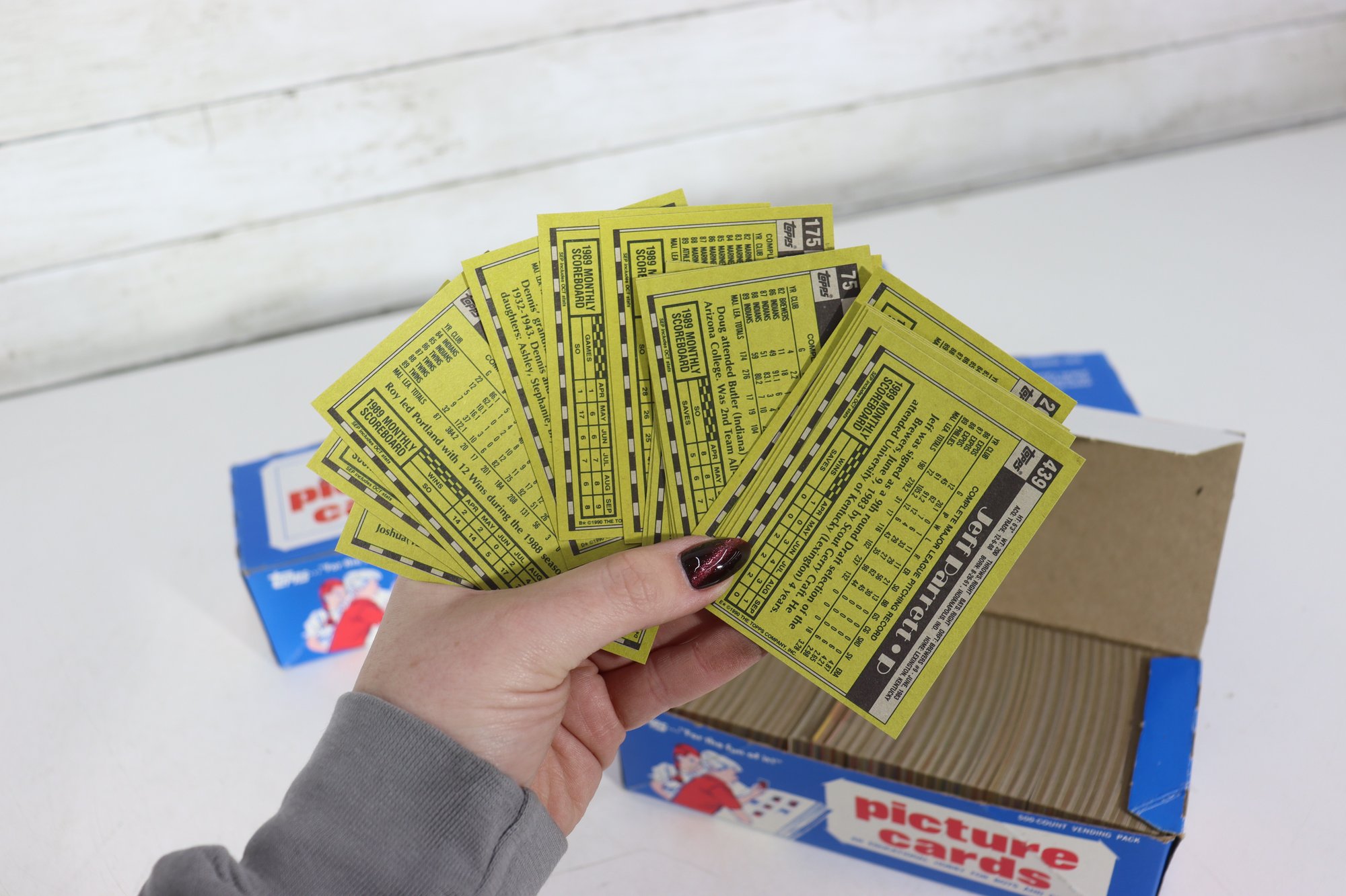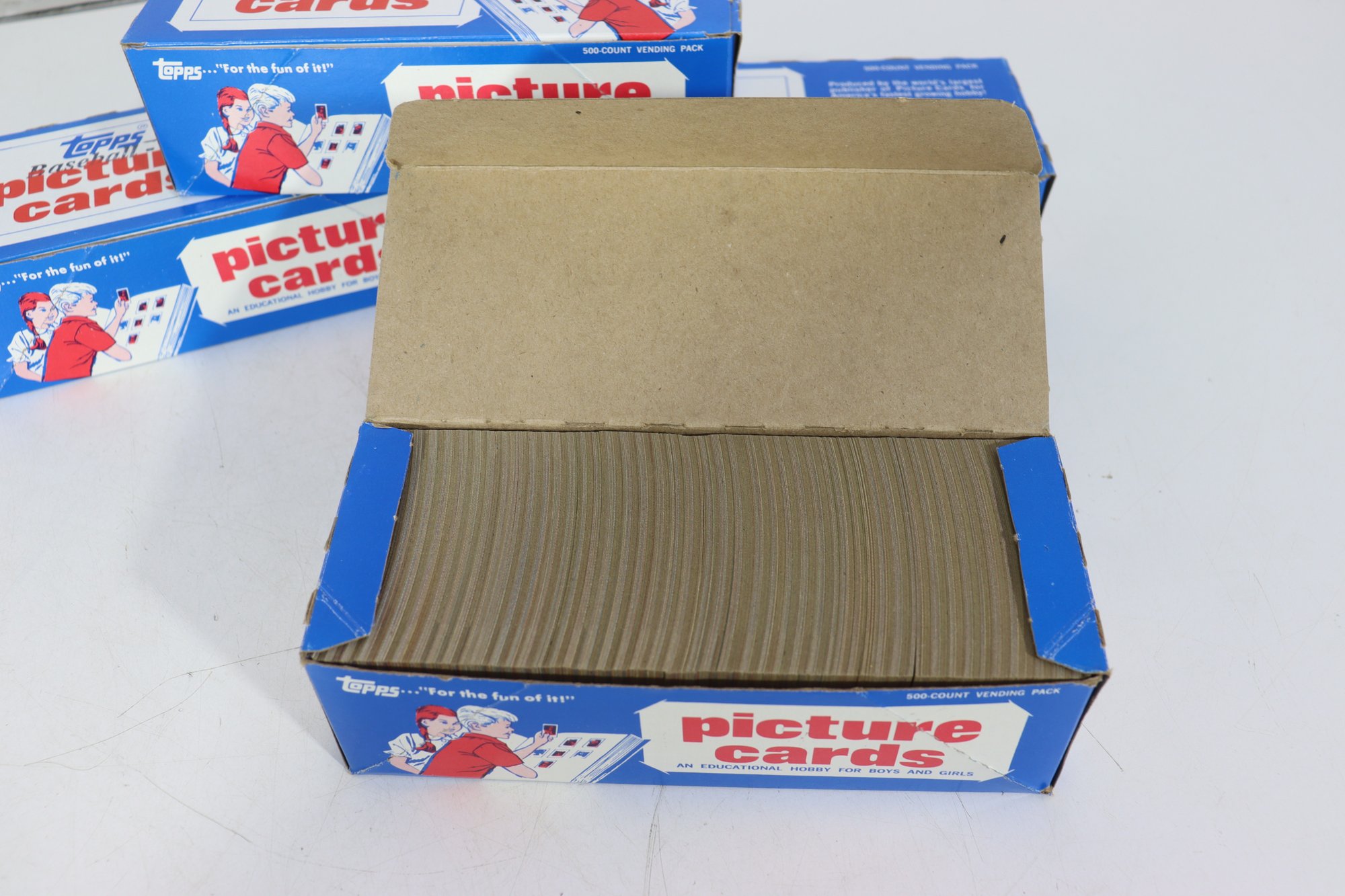 The lot includes multiple Topps “Picture Cards” boxes along with assorted loose cards showing players from teams such as the Twins, Brewers, Pirates, and more. A fun vintage baseball collectible with strong visual appeal.