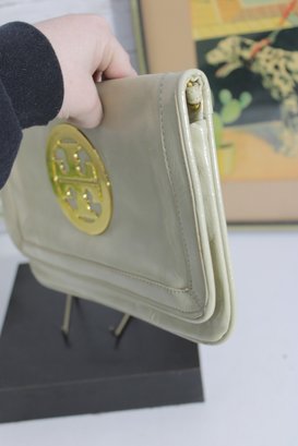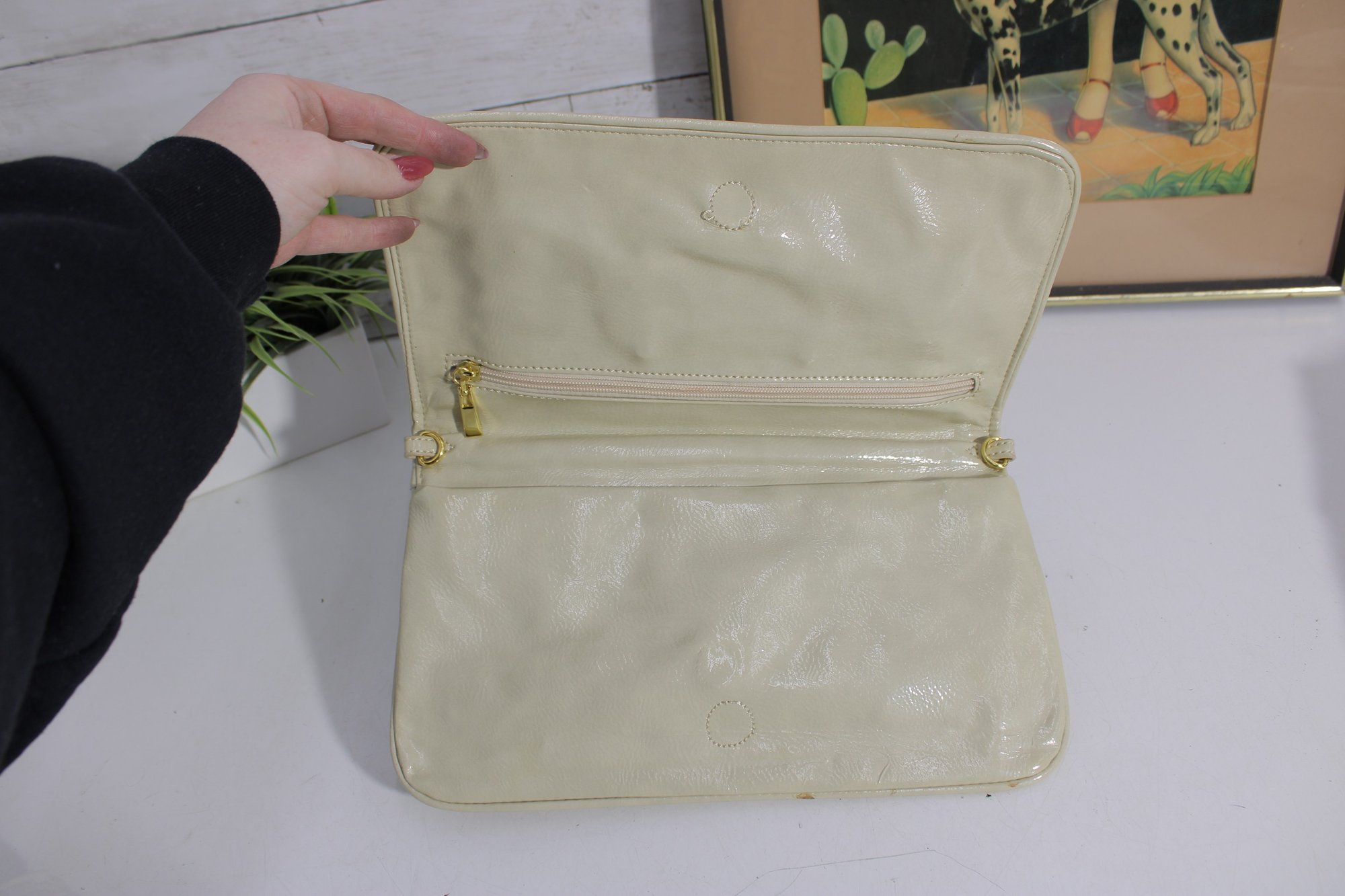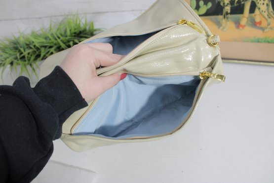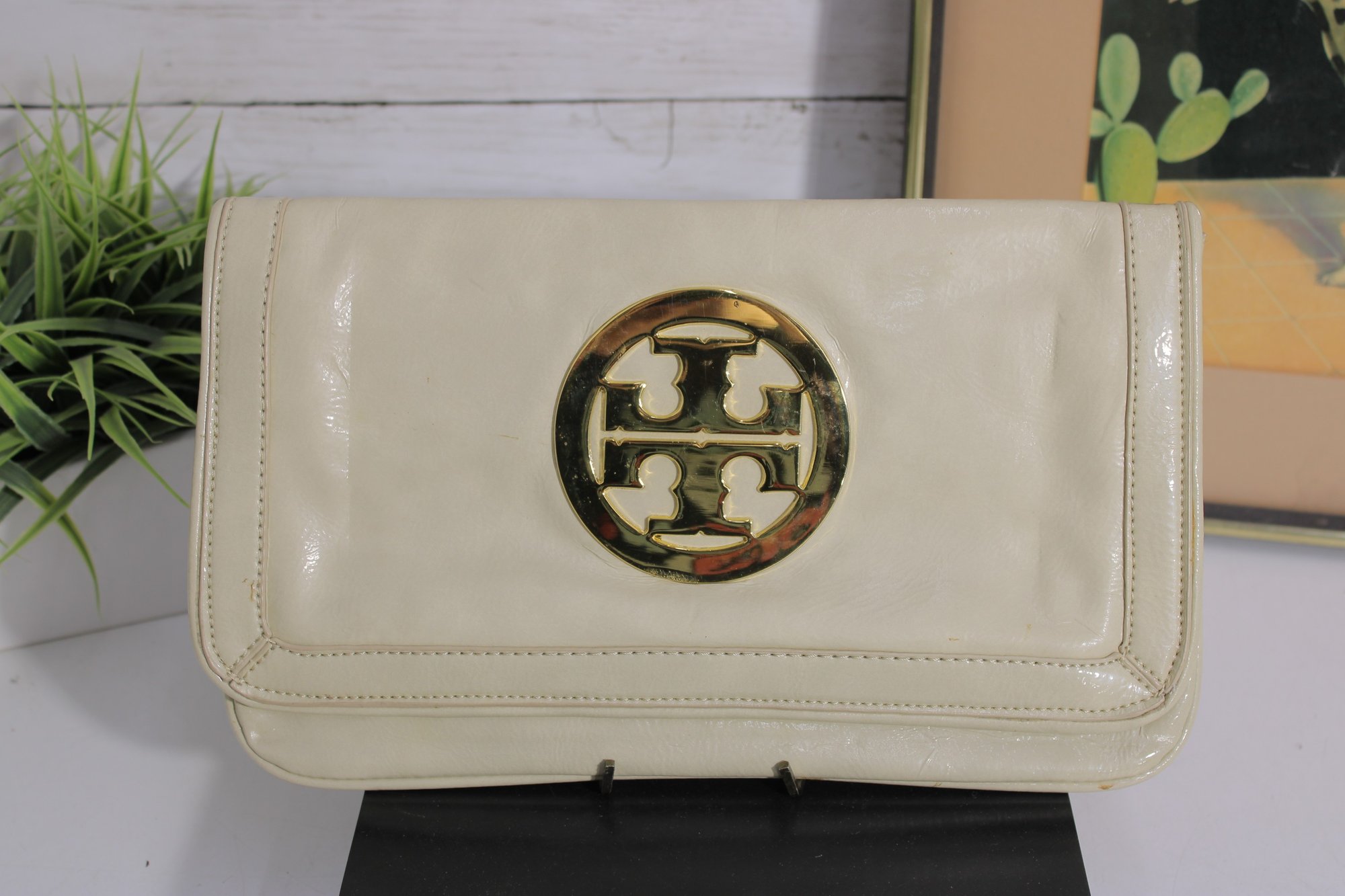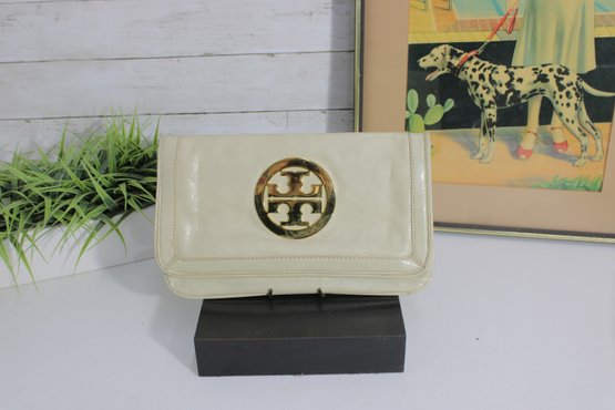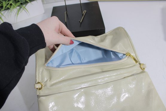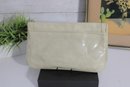 Chic ivory patent leather clutch featuring a bold gold-tone medallion accent on the front. This sleek, structured bag offers a timeless designer-inspired look that transitions effortlessly from day to evening.