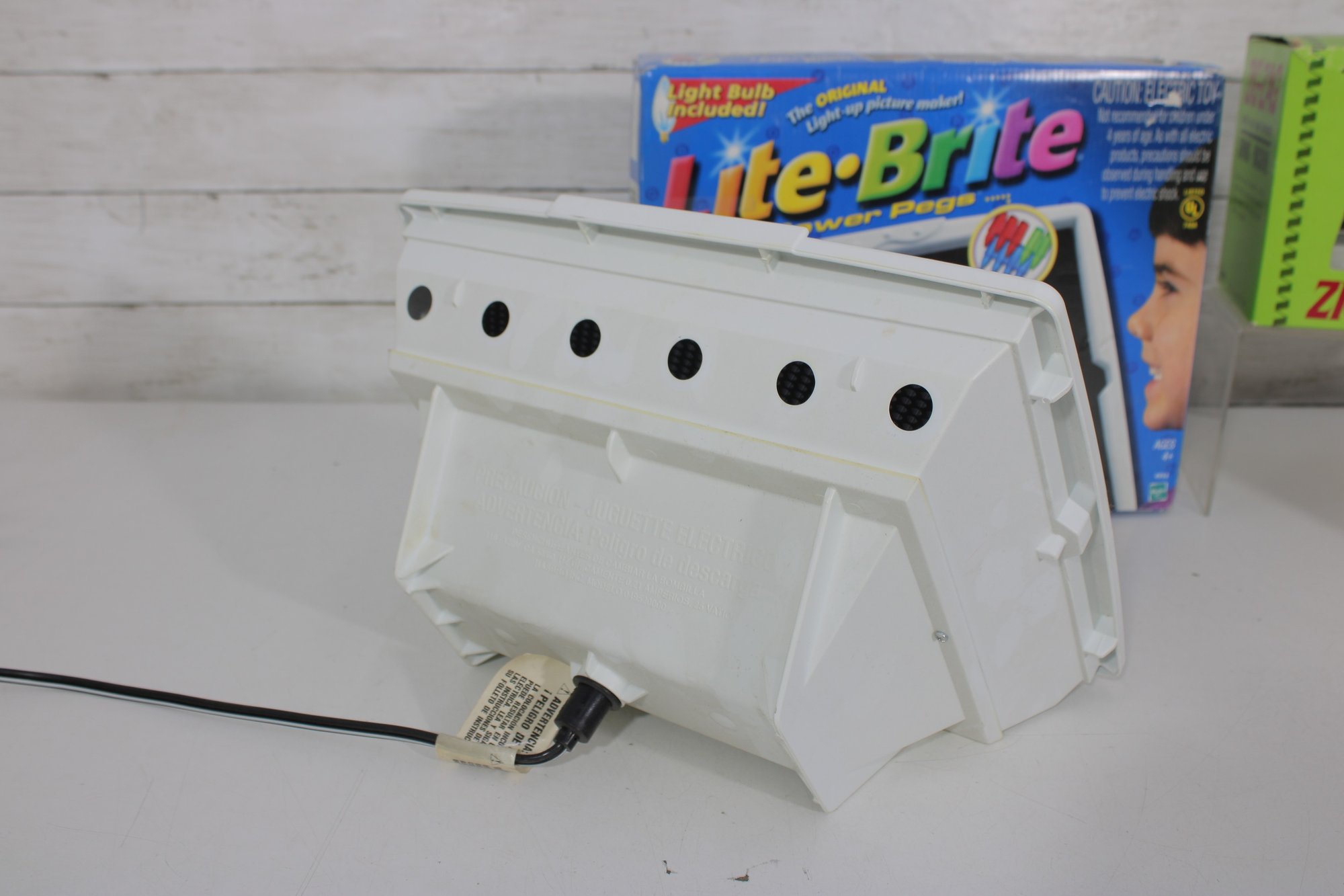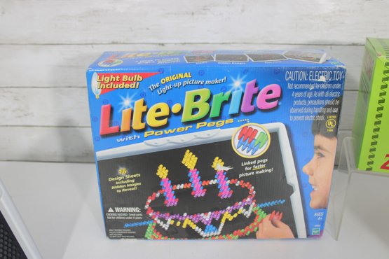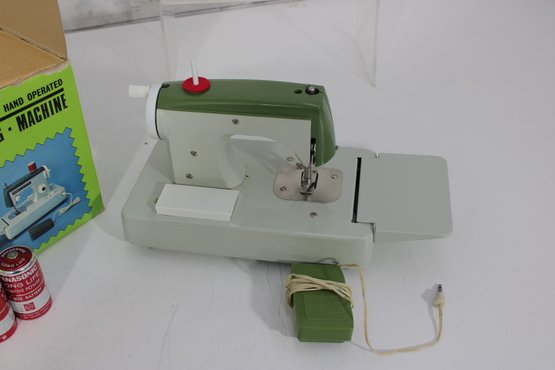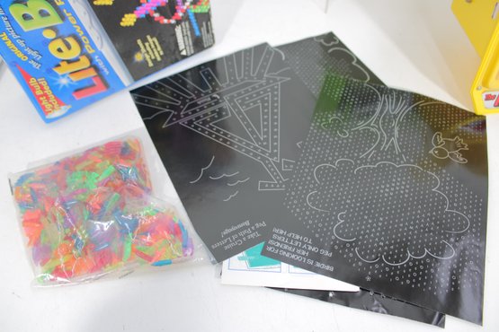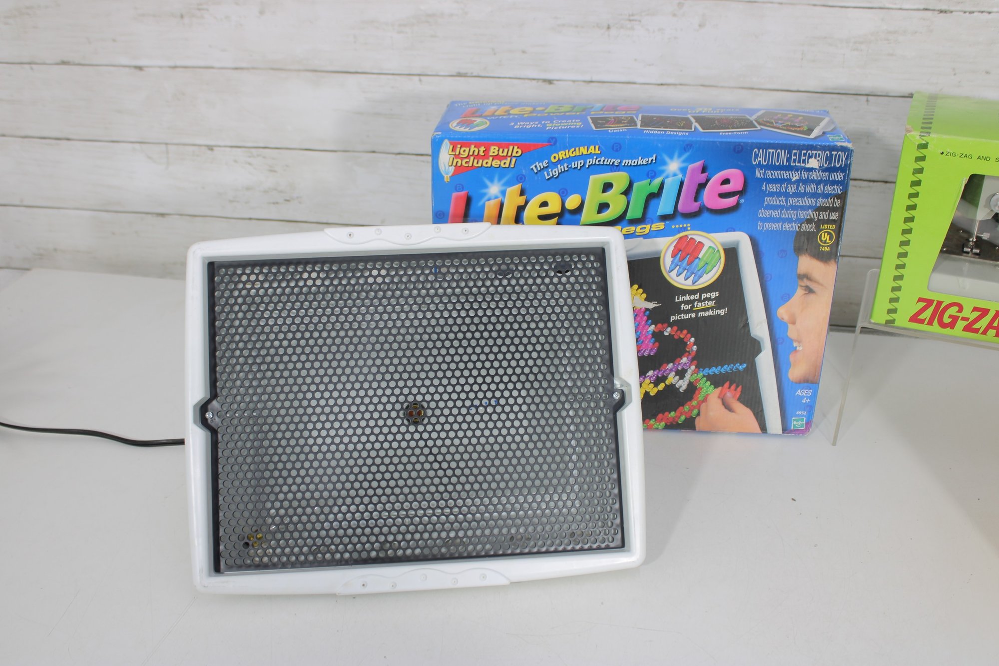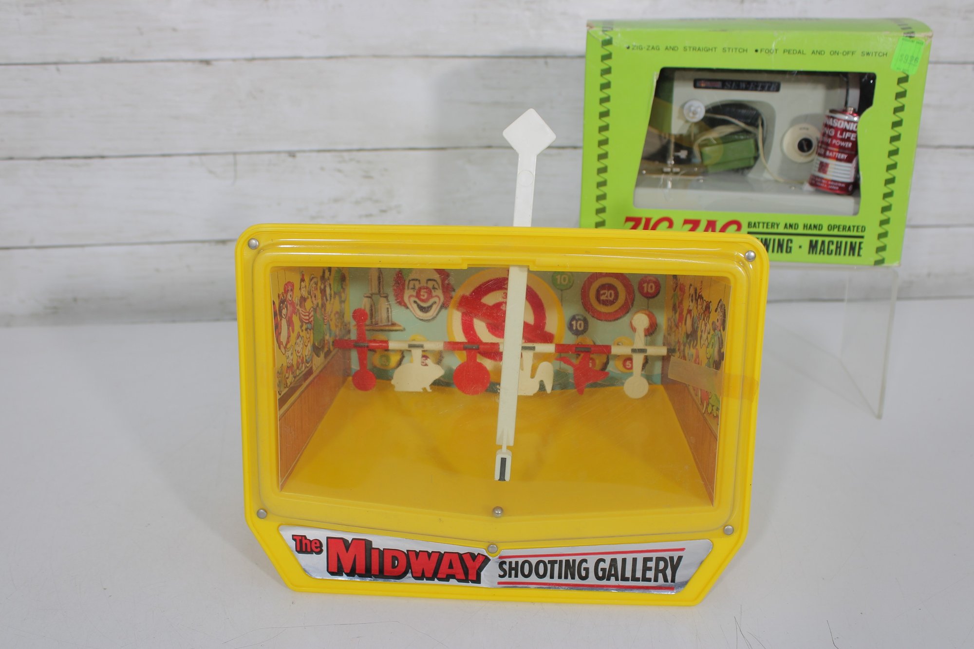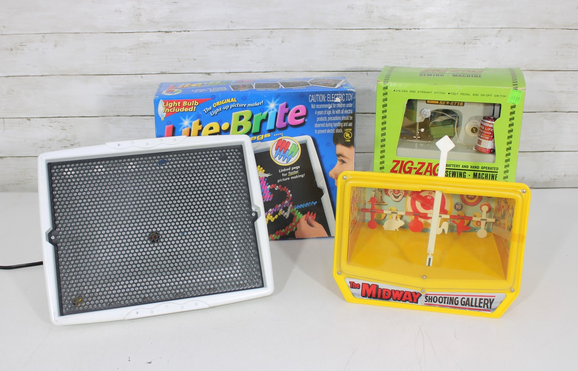 Fun mixed vintage toy and game lot featuring a variety of nostalgic items, including a Lite-Brite light box with pegs, Midway Shooting Gallery tabletop game, and a Zig-Zag battery-operated sewing machine with original box and accessories. A unique assortment perfect for collectors, resellers, or retro toy enthusiasts.
