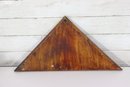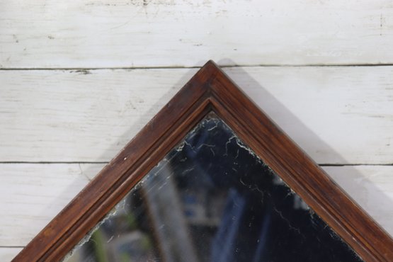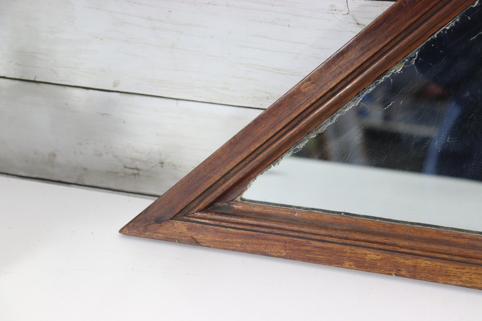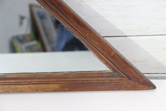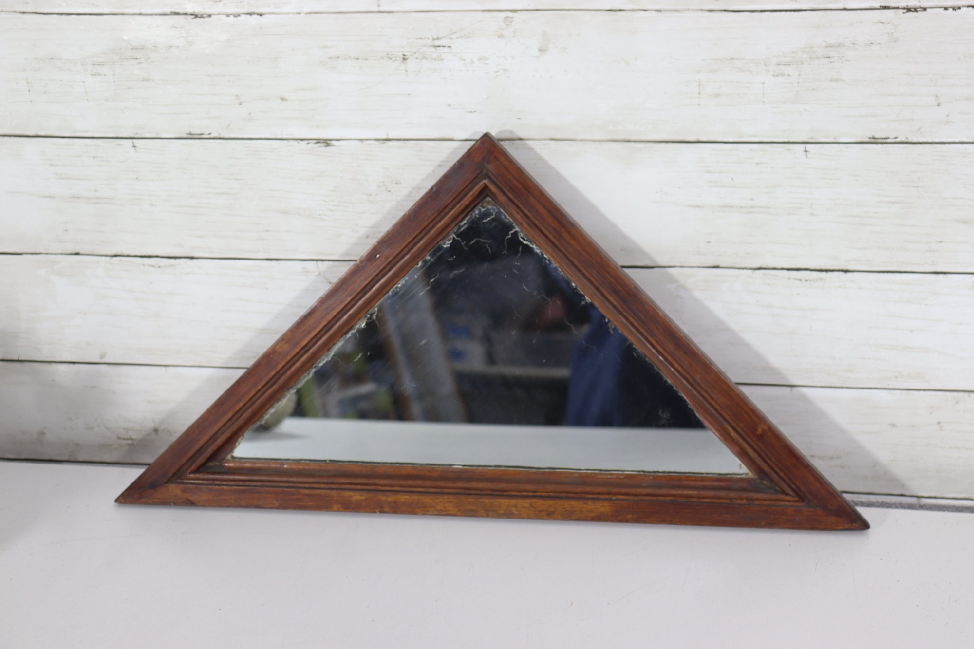 Unique vintage triangular wall mirror featuring a solid wooden frame with warm, naturally aged patina. The triangular shape makes this an eye-catching accent piece, perfect for adding visual interest to a gallery wall, entryway, hallway, or rustic interior décor.
