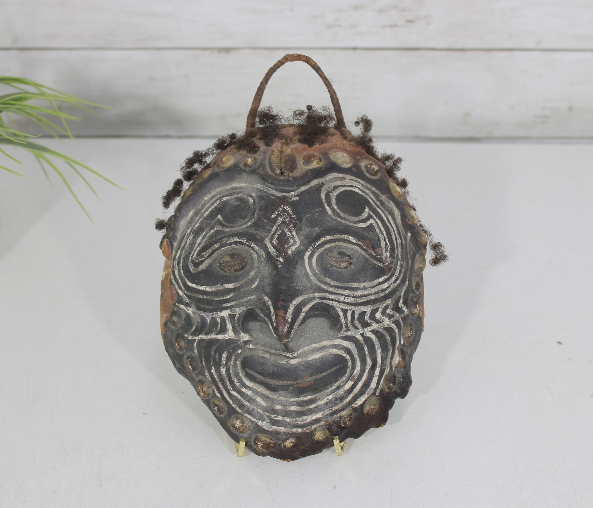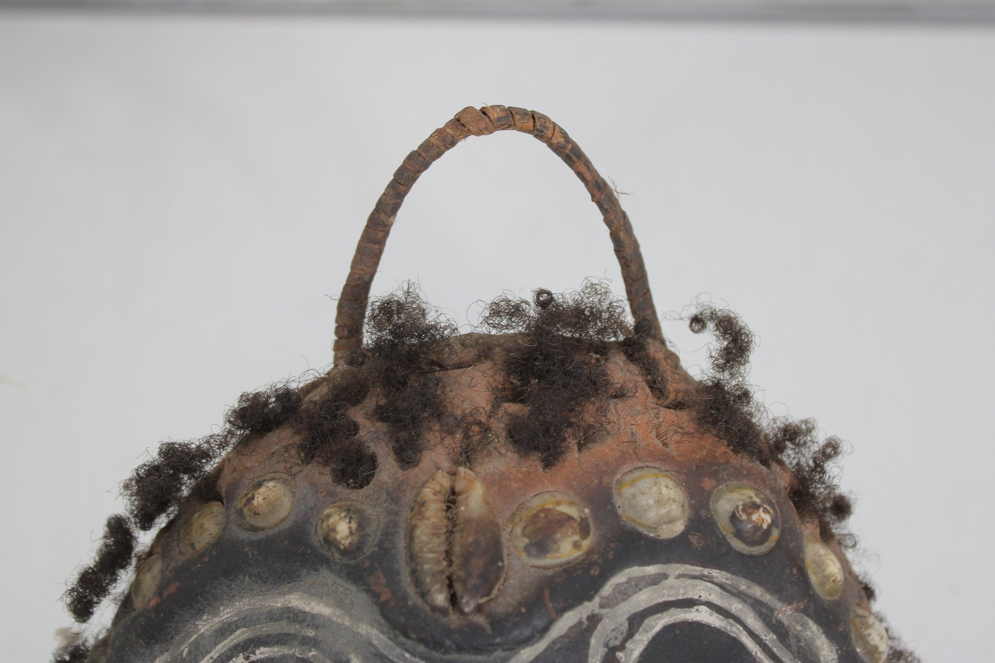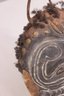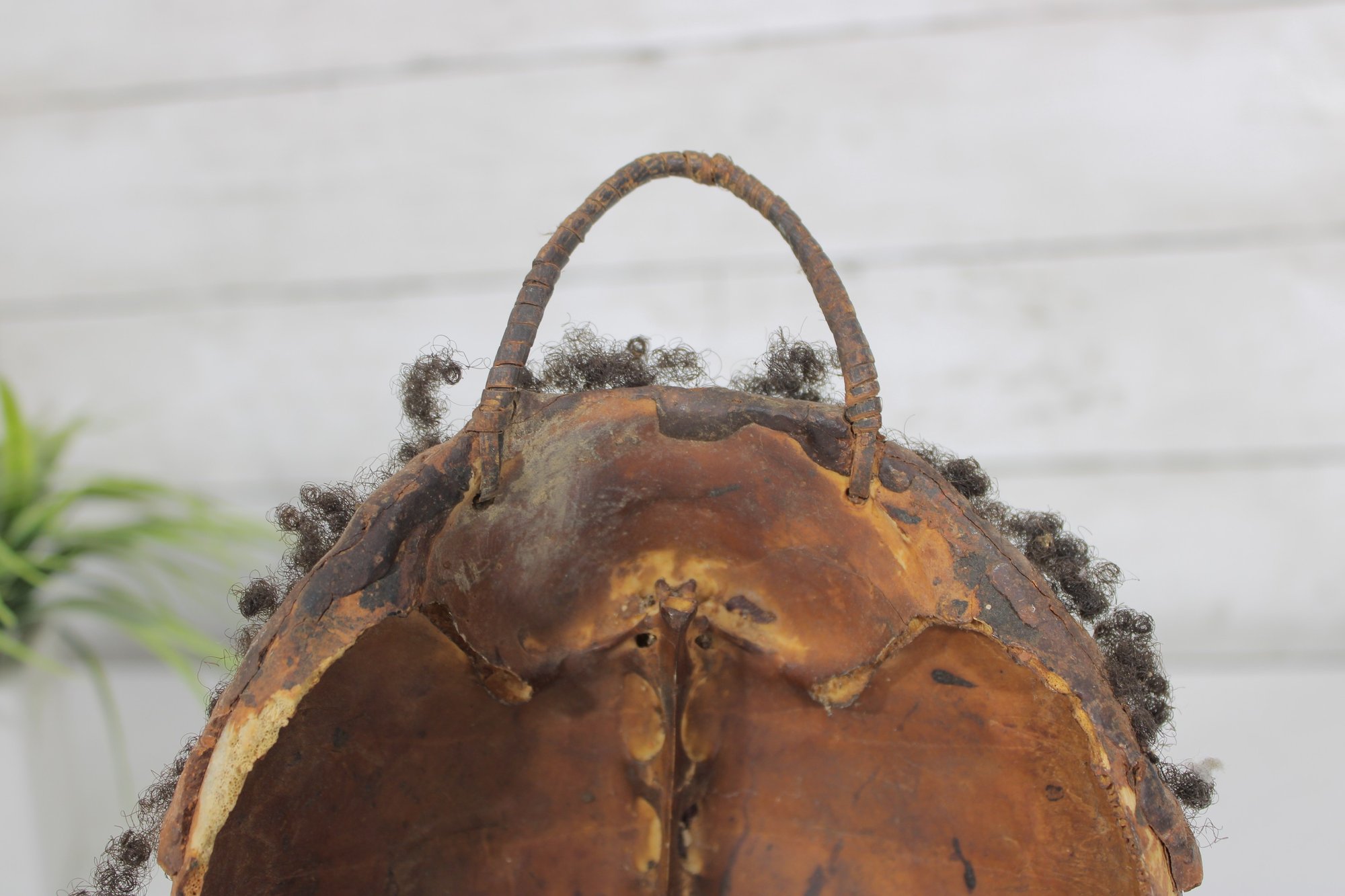 The perimeter features applied natural fiber/hair accents, and a looped handle at the top allows for wall hanging display.