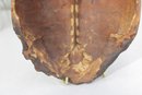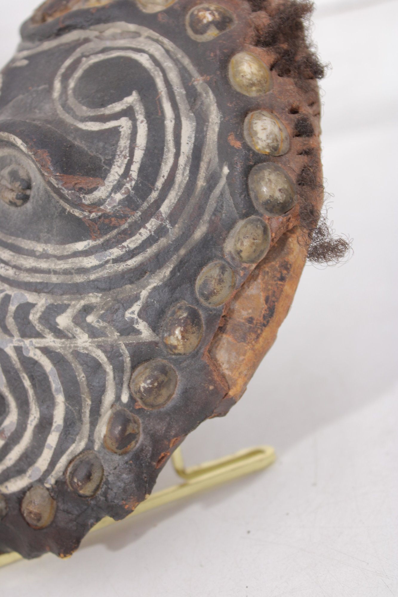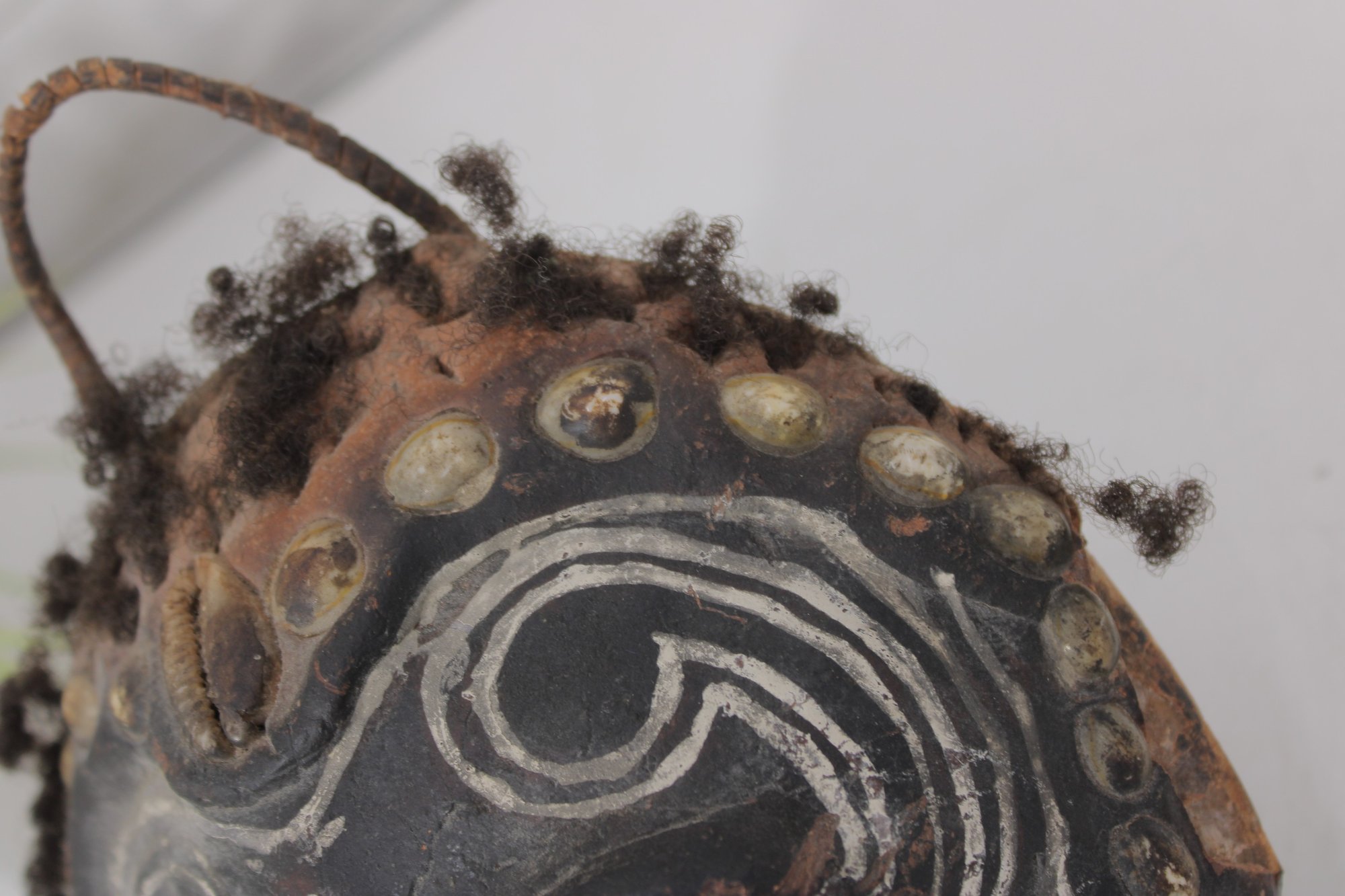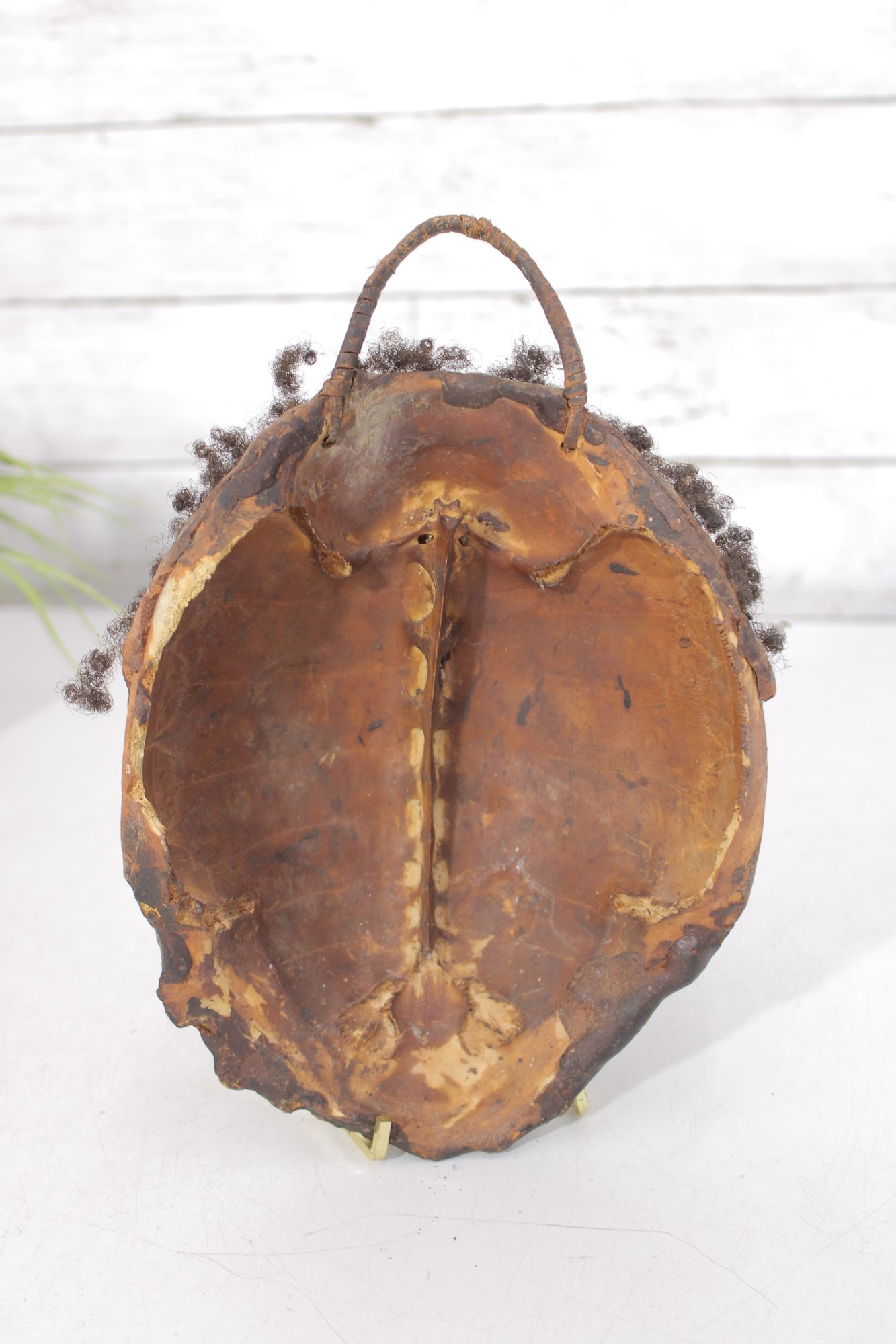The perimeter features applied natural fiber/hair accents, and a looped handle at the top allows for wall hanging display.