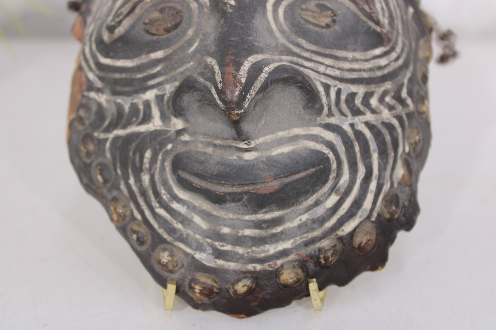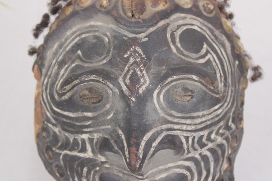 Striking vintage tribal-style mask featuring bold carved facial details with contrasting painted decoration. The mask has a textured dark surface with white accent lines highlighting the eyes, nose, and mouth, along with decorative elements across the forehead.