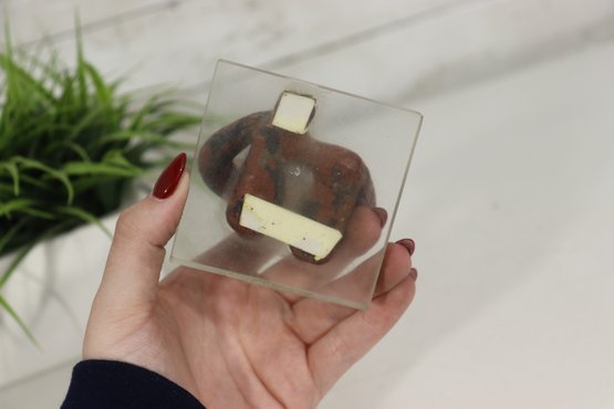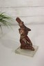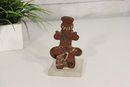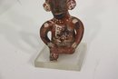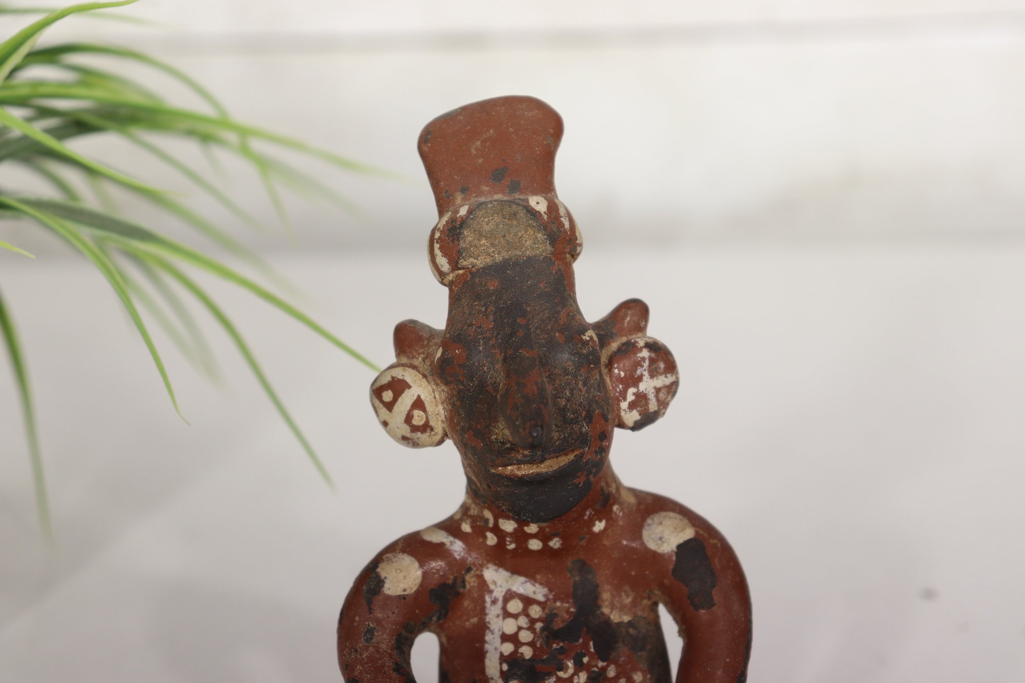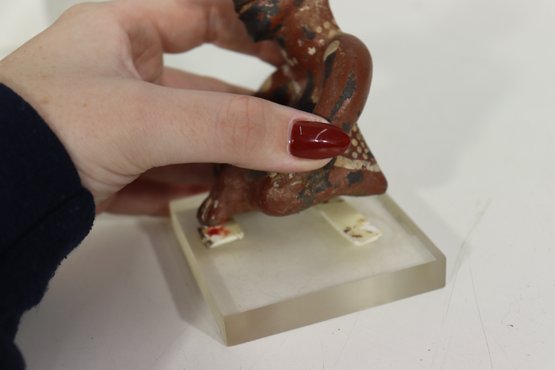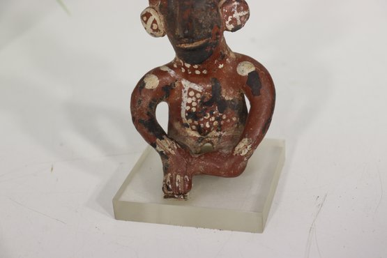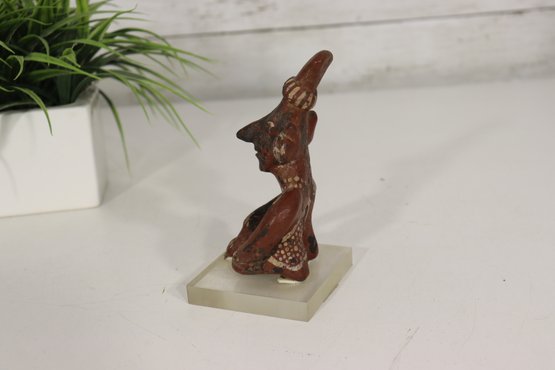 Unique vintage hand crafted and hand painted clay tribal style figurine mounted on a clear lucite display base. This seated figure features bold form, dotted painted detailing, ear ornaments and a stylized headdress. Wonderful primitive folk art aesthetic with great character and patina throughout.