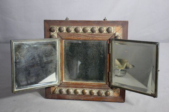 this vintage three-part mirror features a central art display frame that invites personalization with your cherished artwork. The piece exudes a timeless charm with its weathered wooden frame and classic beaded detailing, offering an antique aesthetic that complements any decor style.