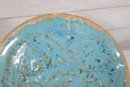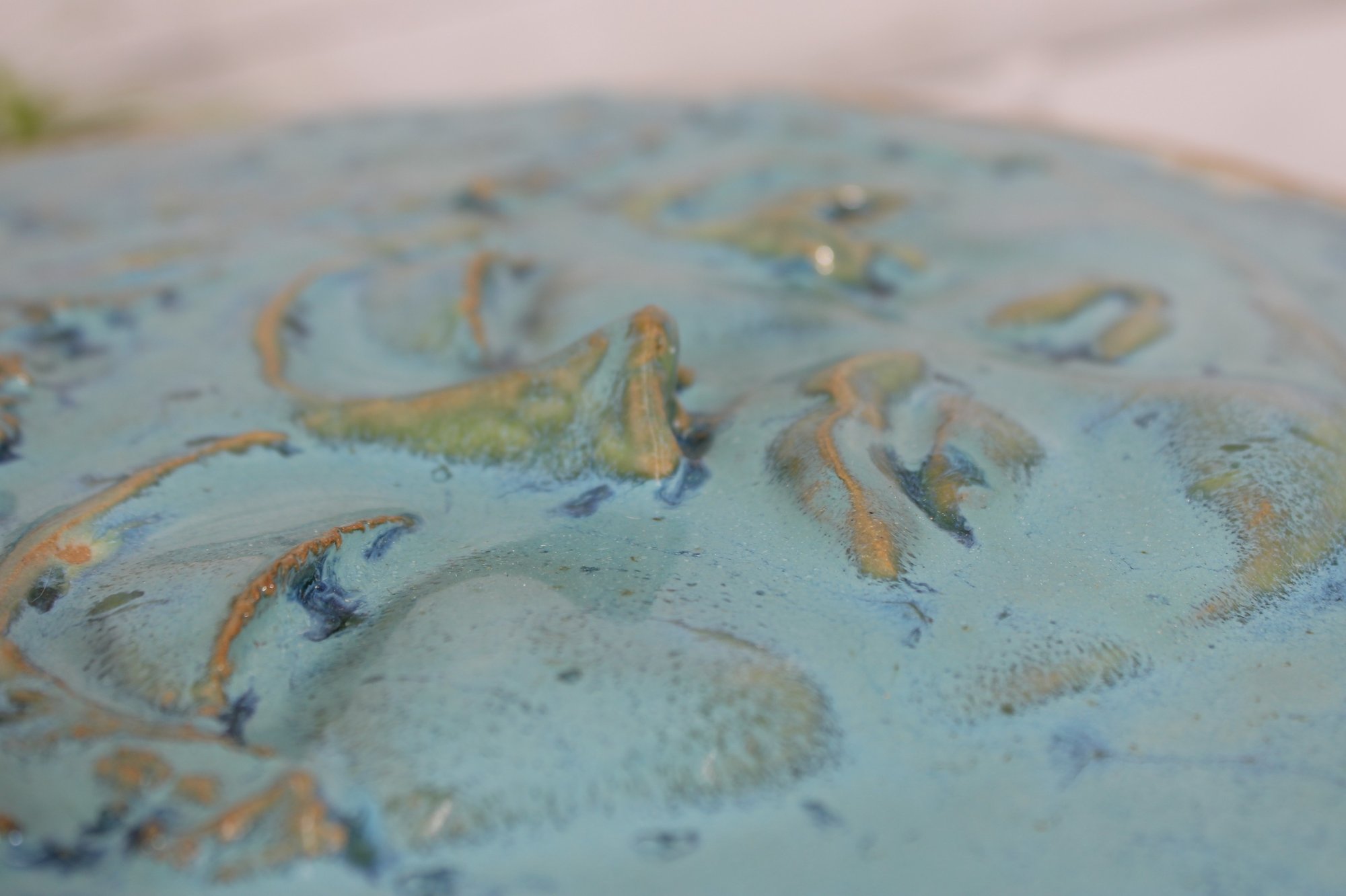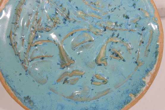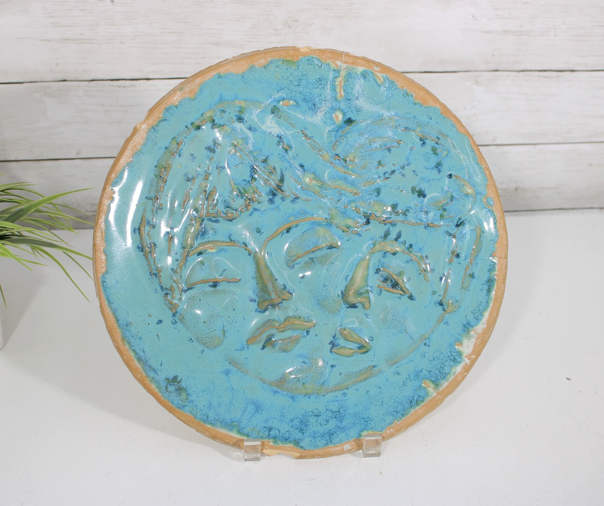 Striking vintage art pottery plate featuring a beautifully sculpted human face in relief, finished in a vibrant turquoise glaze with earthy undertones. The expressive facial details are subtly raised, giving the piece depth and character, while the glossy glaze highlights the contours and textures throughout.