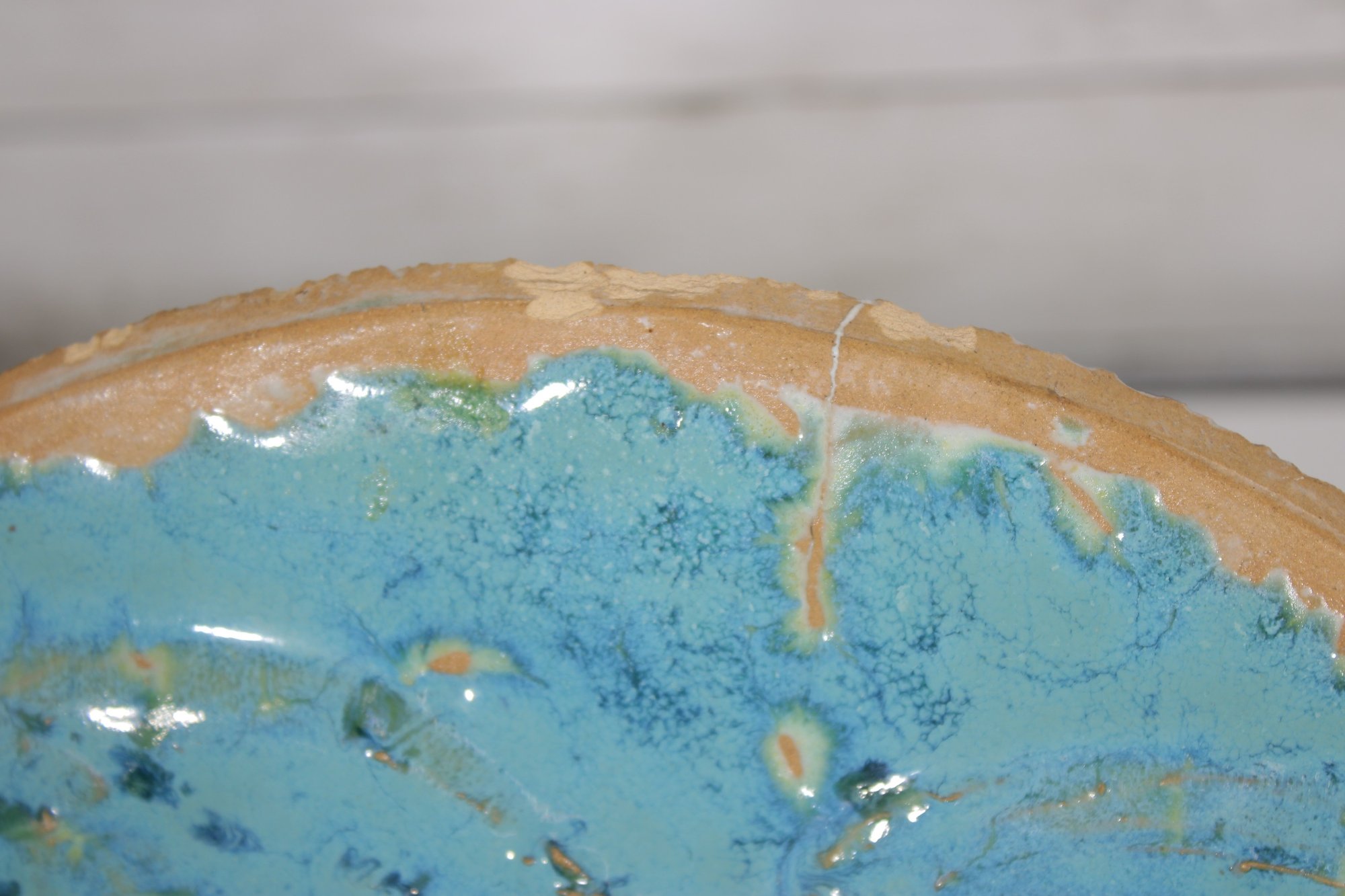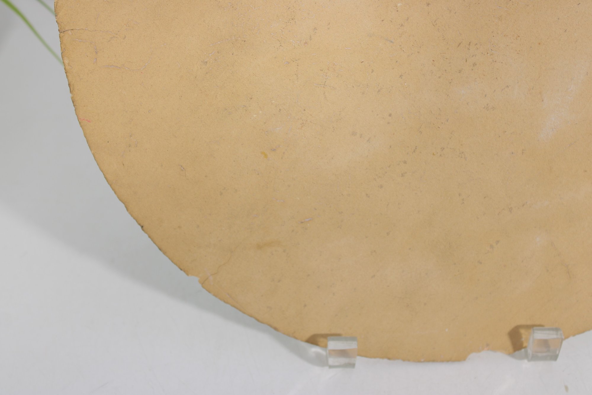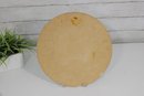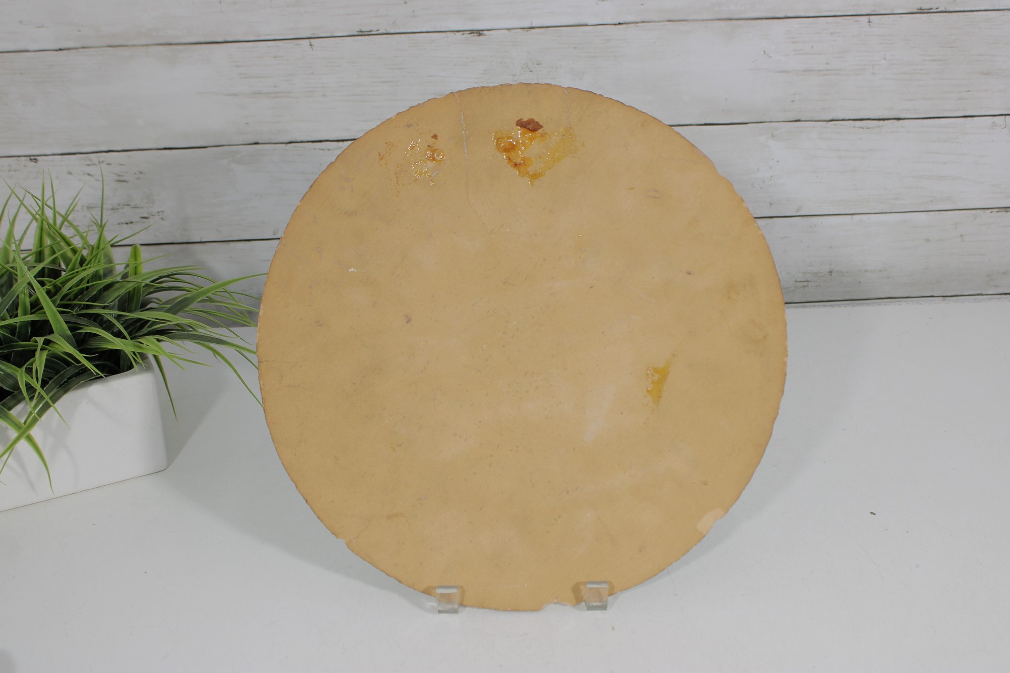 Measuring approximately 12.5 inches in diameter, this round plate functions wonderfully as a decorative wall plaque or display piece. The back is unglazed, showing natural clay with minor marks consistent with age and handling.