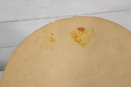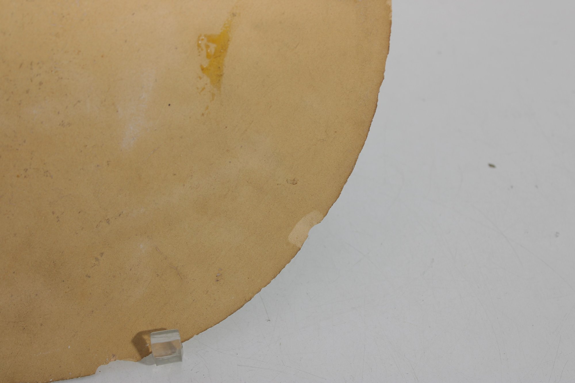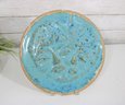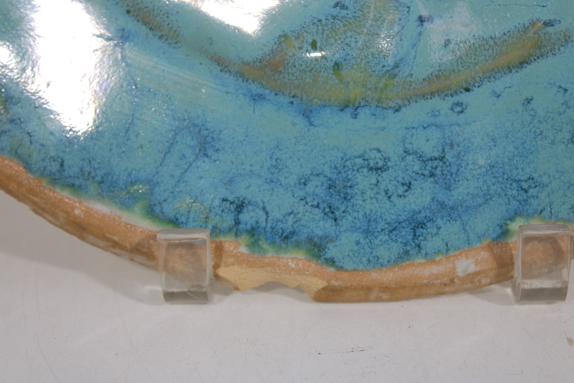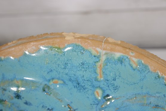 Measuring approximately 12.5 inches in diameter, this round plate functions wonderfully as a decorative wall plaque or display piece. The back is unglazed, showing natural clay with minor marks consistent with age and handling.