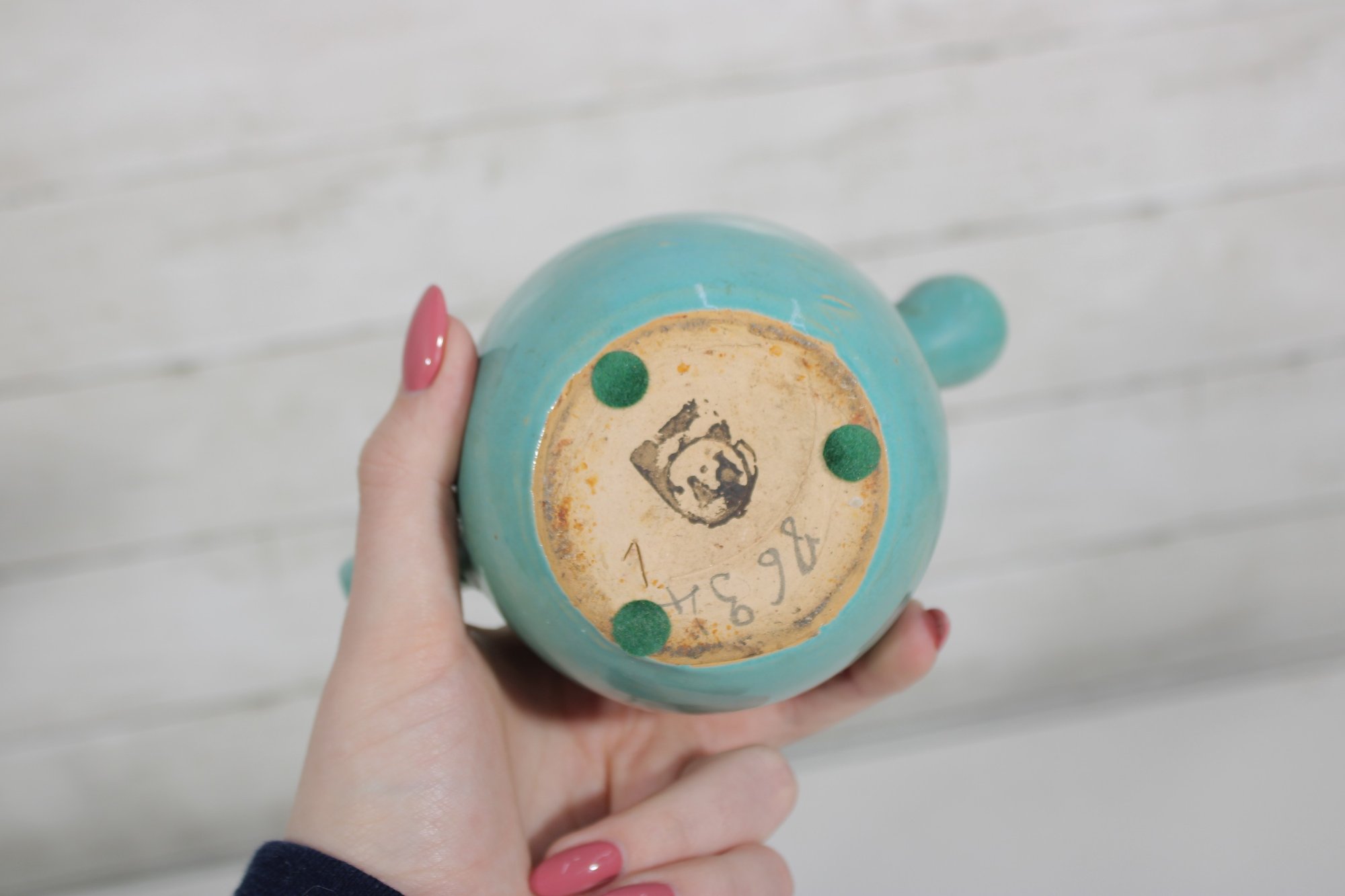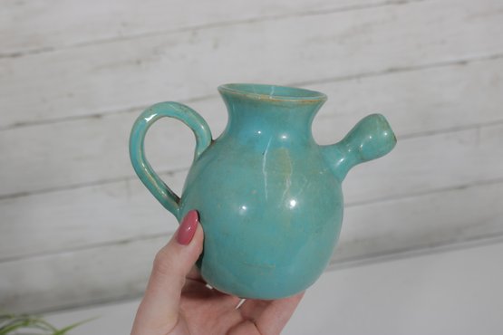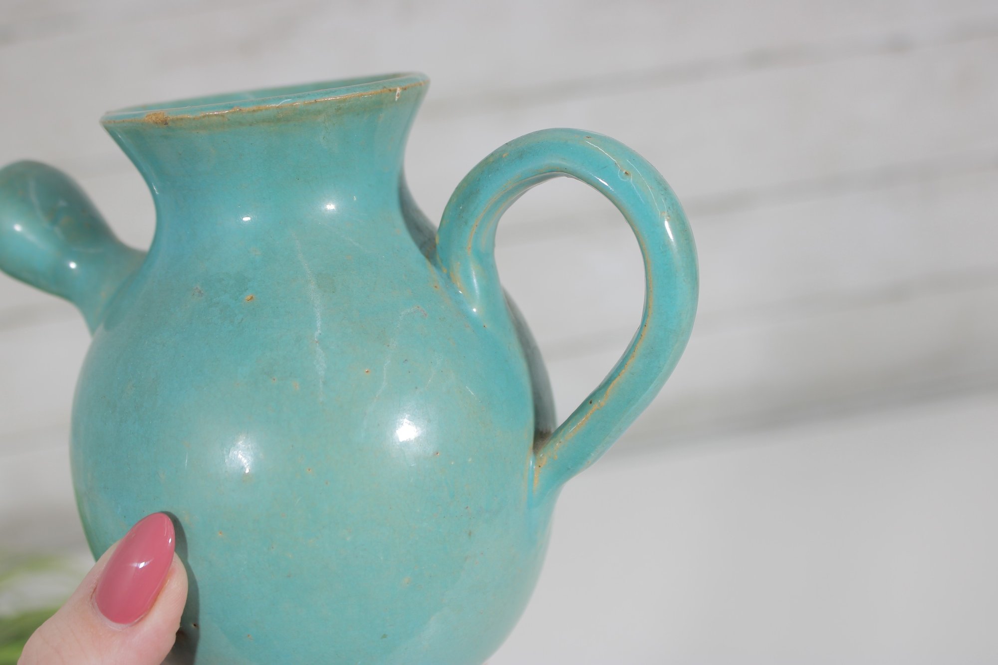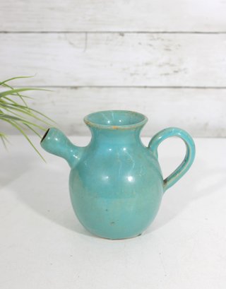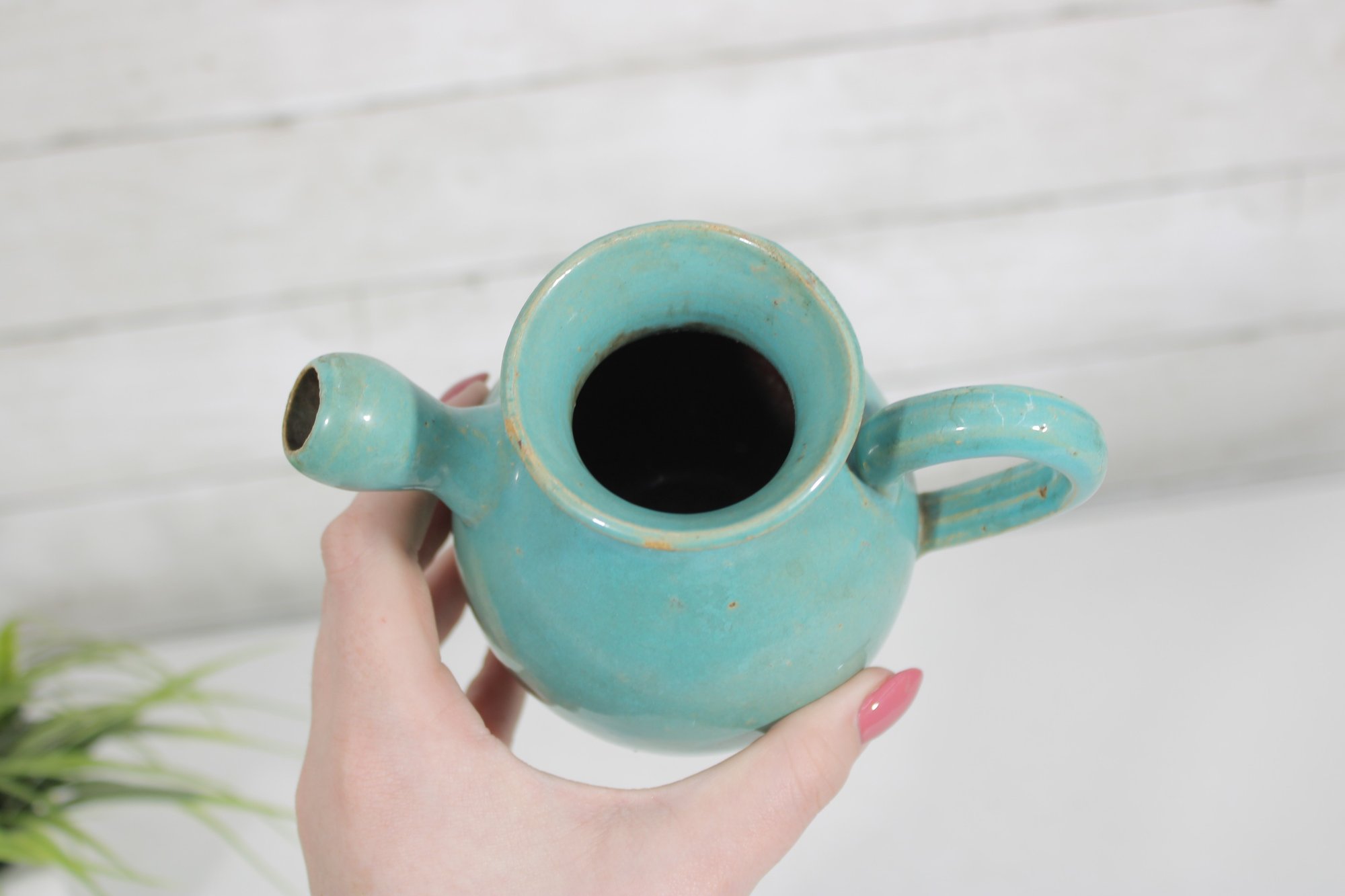 Charming vintage ceramic teapot or small pitcher featuring a beautiful glossy turquoise glaze. This unique piece has a rounded body with a short spout, curved handle, and flared neck, giving it a classic mid-century studio pottery look.