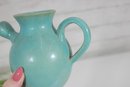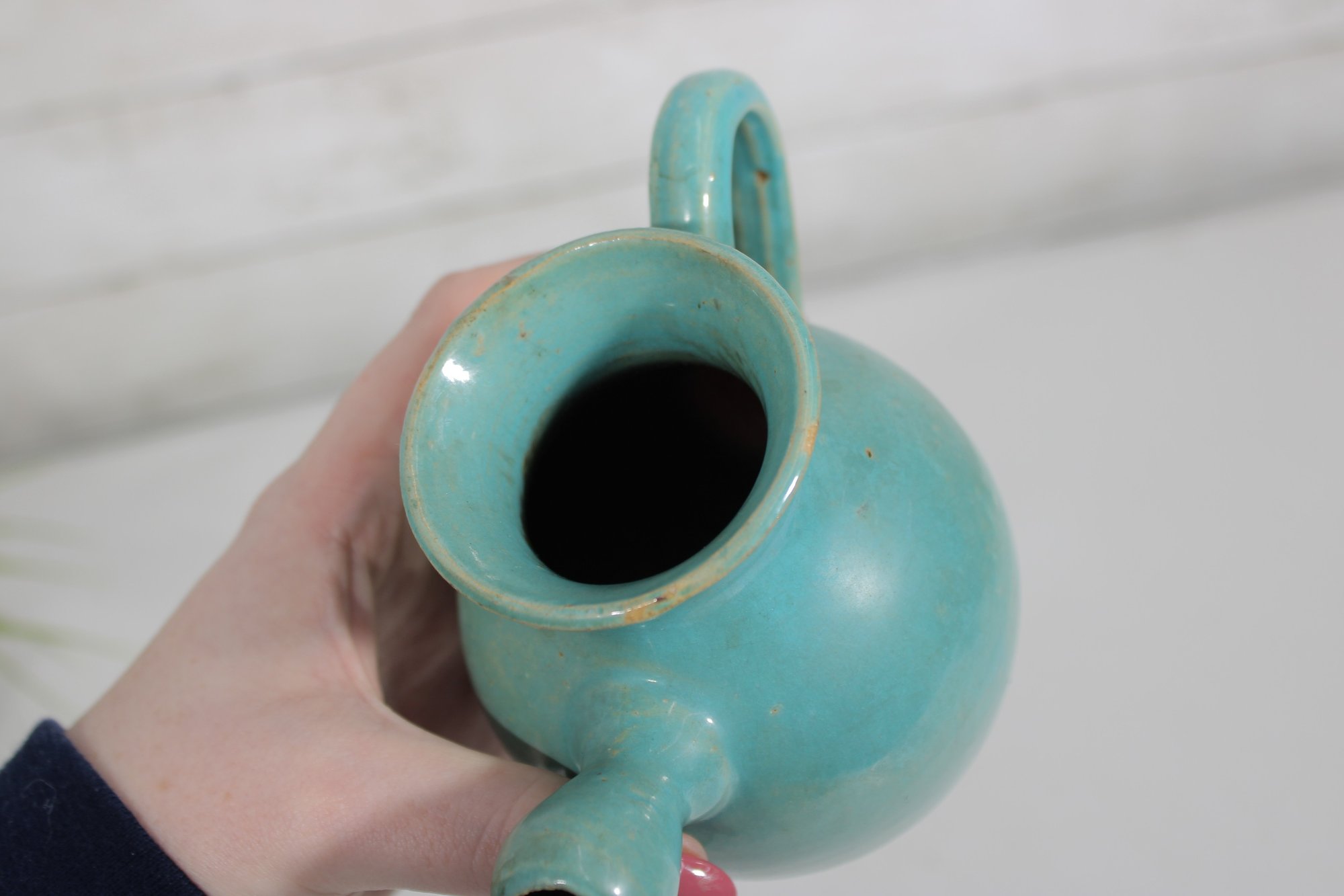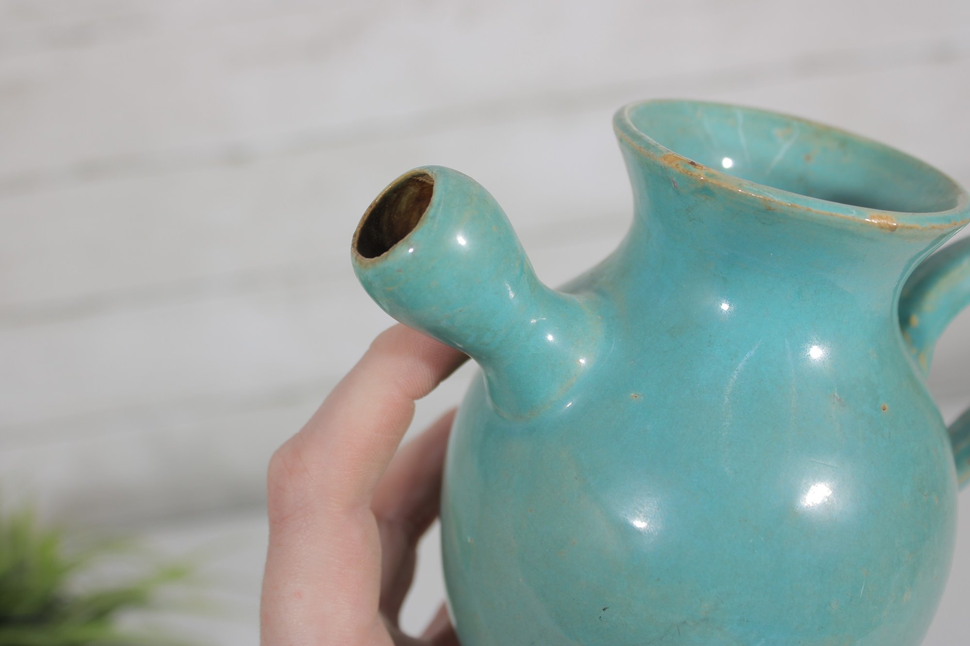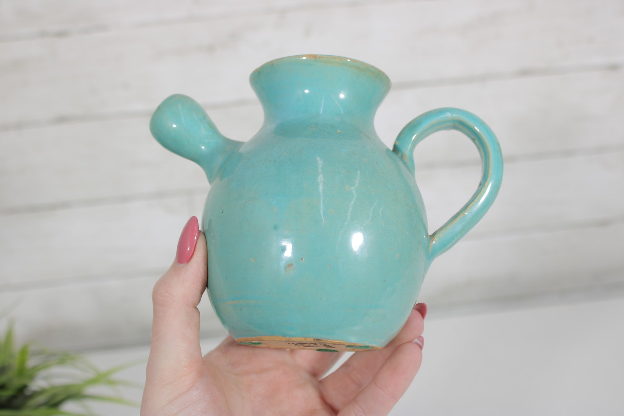 Charming vintage ceramic teapot or small pitcher featuring a beautiful glossy turquoise glaze. This unique piece has a rounded body with a short spout, curved handle, and flared neck, giving it a classic mid-century studio pottery look.