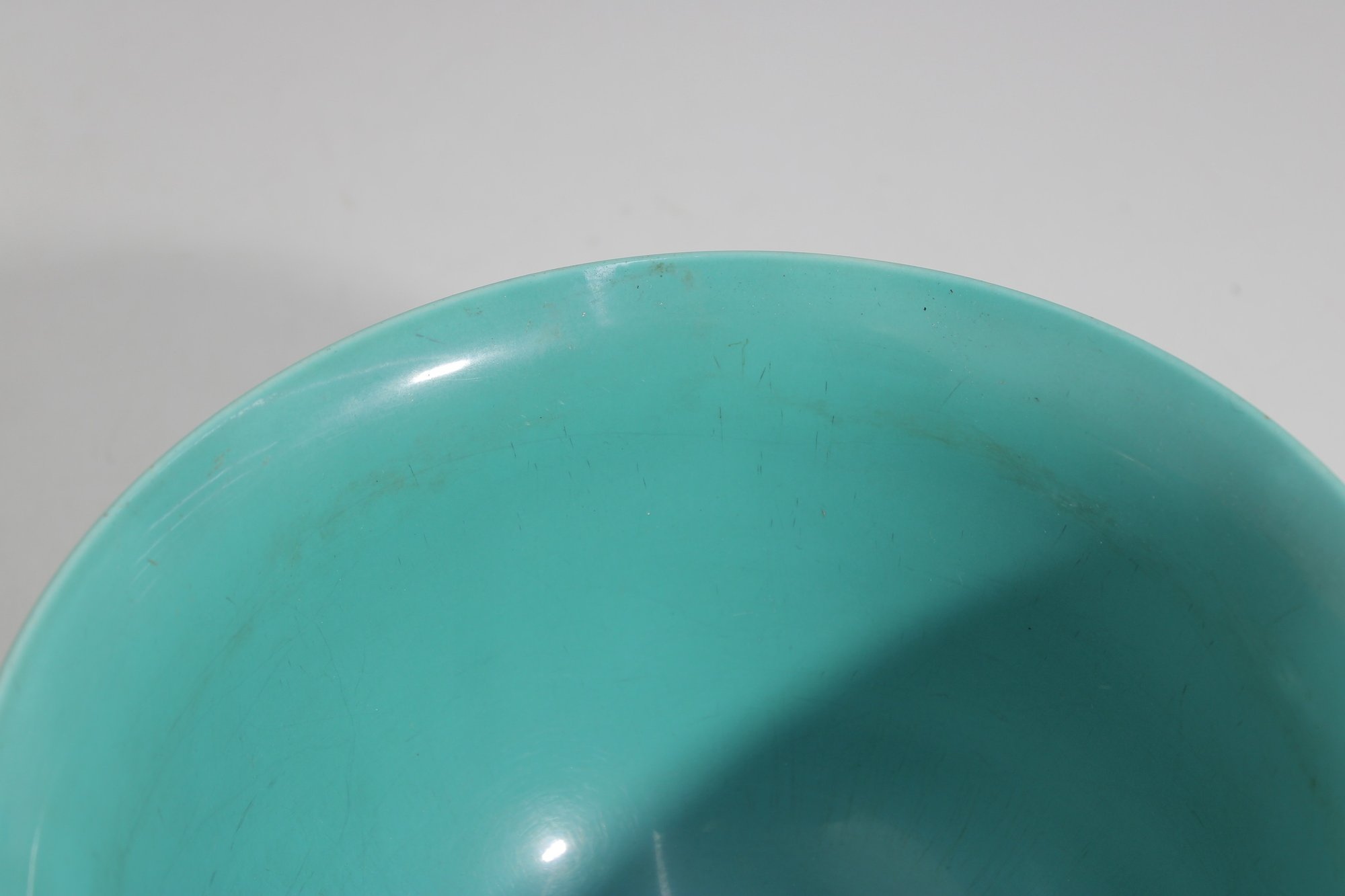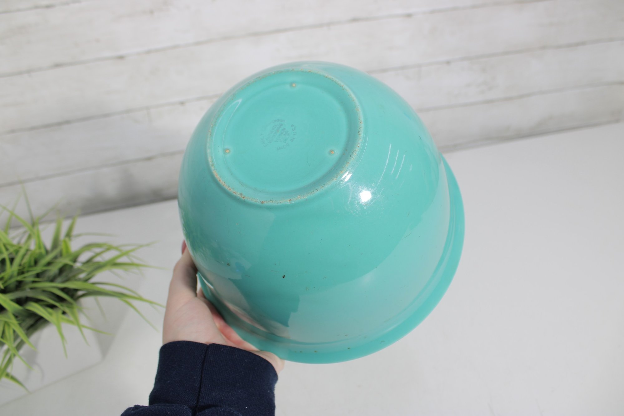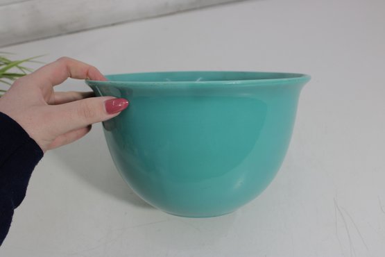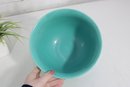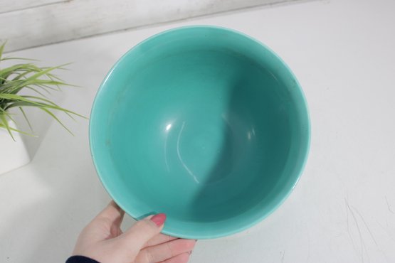 mixing bowl in a beautiful turquoise/aqua color, perfect for adding a pop of retro style to your kitchen or display. Measuring approximately 6 inches high and 9 inches in diameter, this bowl has a classic rounded form with a slightly flared rim.