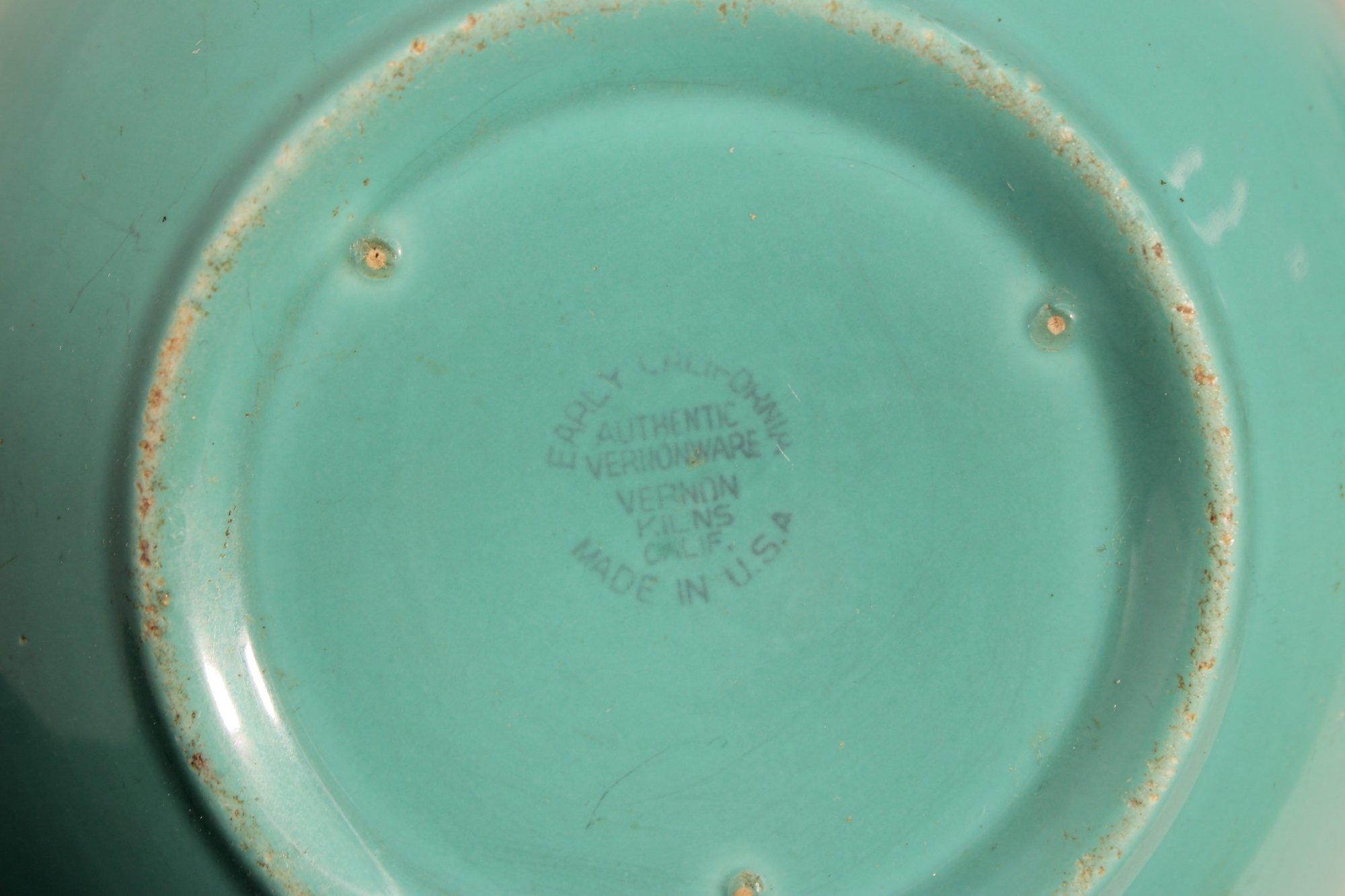 The interior and exterior feature a smooth, glossy finish, while the base shows light, age-appropriate wear consistent with use. The underside retains its original maker’s mark, indicating authentic vintage production.
