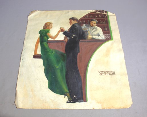"Evening at the Bar" captures a lively interaction at a bustling bar scene, highlighted by the elegant stance of a woman in a vibrant green gown. Painted by PWM Brewer Fattengill, this piece reflects the social dynamics and style of early 20th-century European art. The artist’s skill in depicting fabric texture and human expression shines through, making this painting a fascinating glimpse into a bygone era of elegance and social engagement.