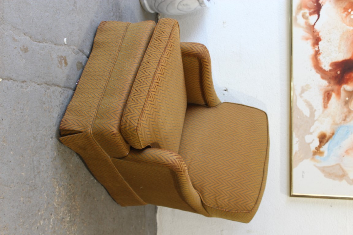 Comfortable upholstered armchair with a classic design. The chair features a patterned fabric and a skirted base, adding a touch of elegance to any living space. Ideal for cozy reading nooks, living rooms