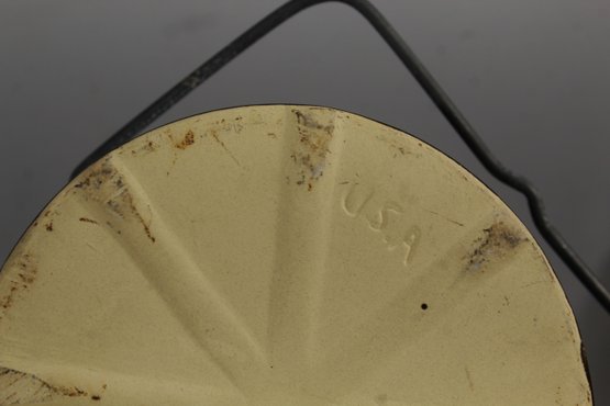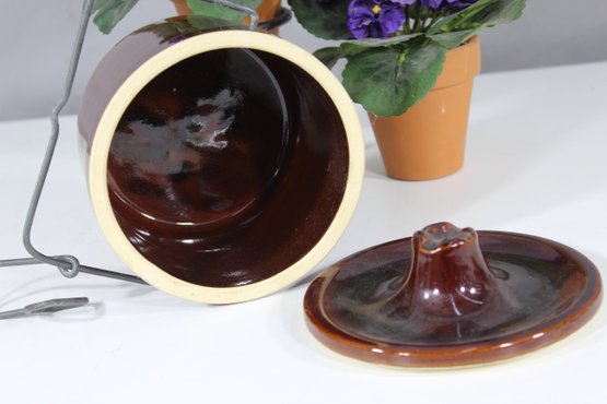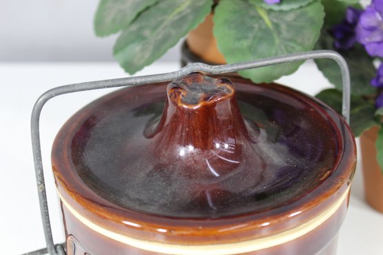 A charming vintage stoneware bean pot marked "USA" on the base, complete with its original lid and metal carrying handle. This piece features a rich brown glaze and sturdy craftsmanship, perfect for rustic kitchen décor or functional use. The pot and lid are in good vintage condition, showcasing classic Americana style. Ideal for collectors or enthusiasts of traditional stoneware pieces.