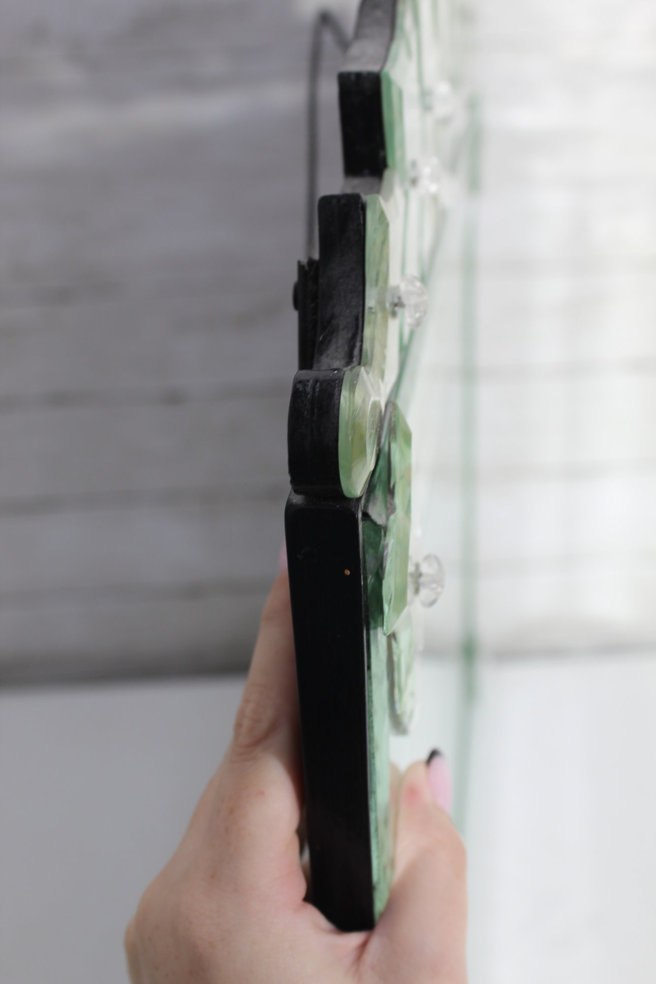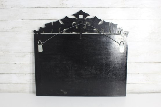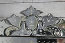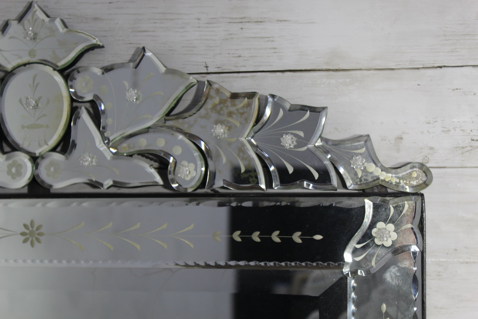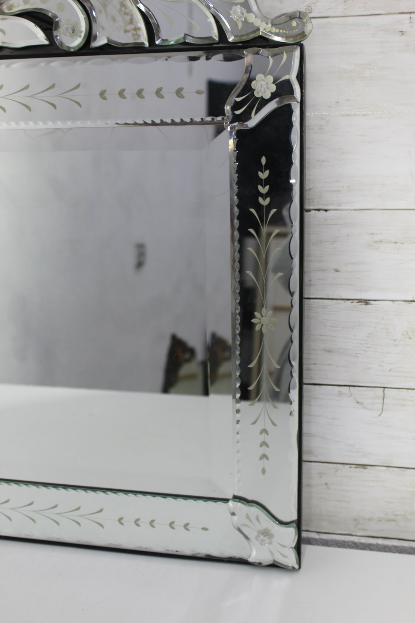 The intricate hand-etched floral and leaf motifs throughout the frame add a delicate, refined touch, while the scalloped and layered crest top creates a dramatic focal point. Each glass panel is individually beveled, reflecting light beautifully and enhancing the mirror’s depth and brilliance.