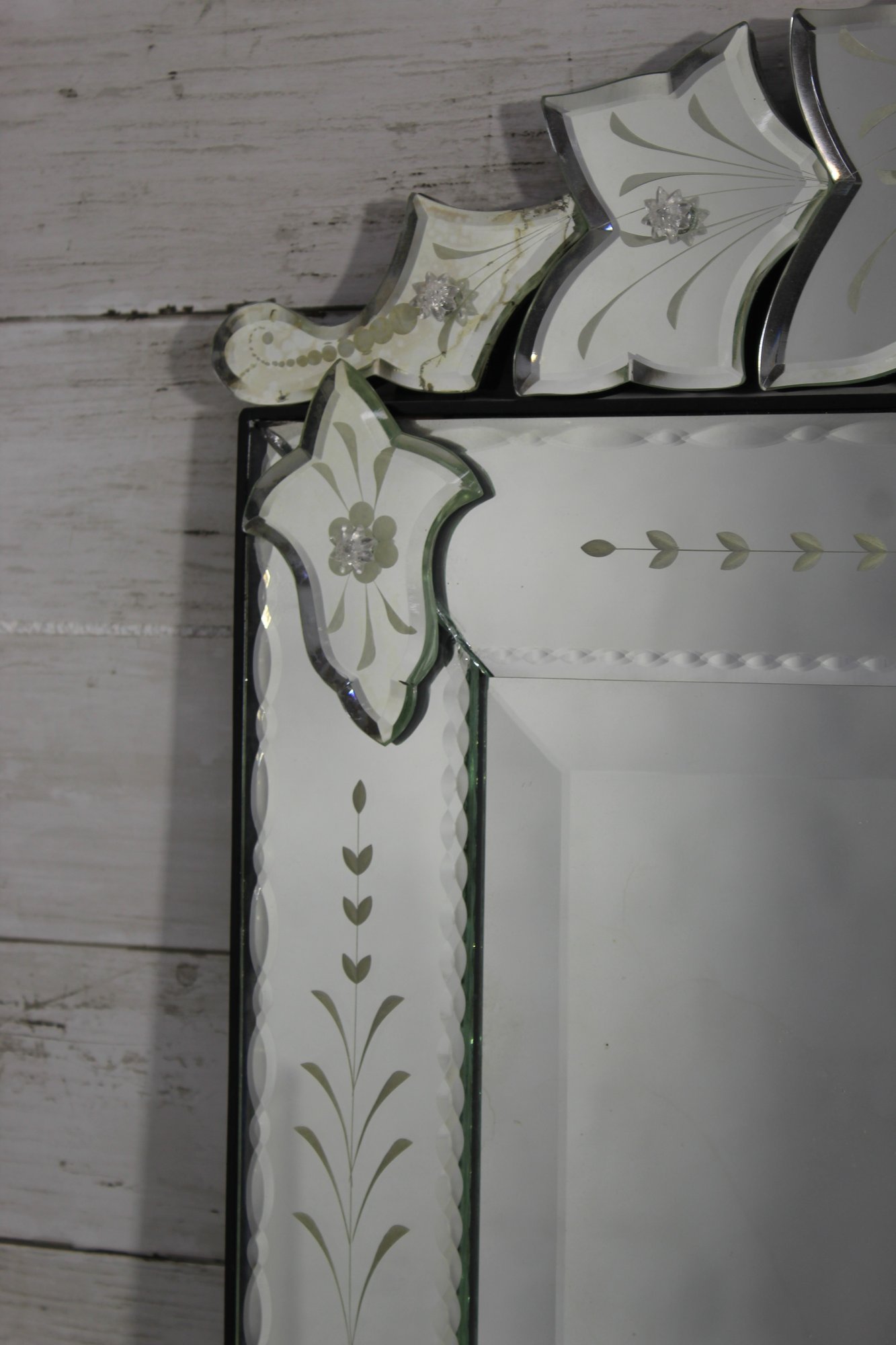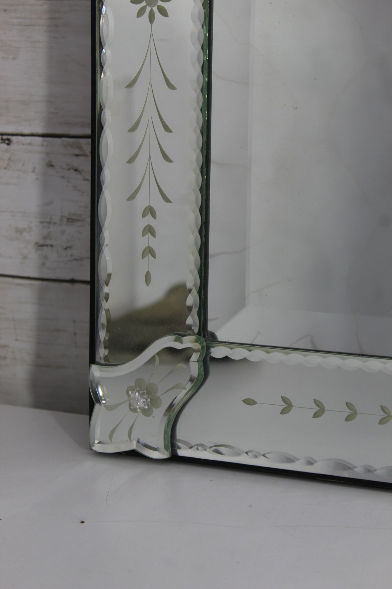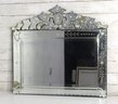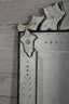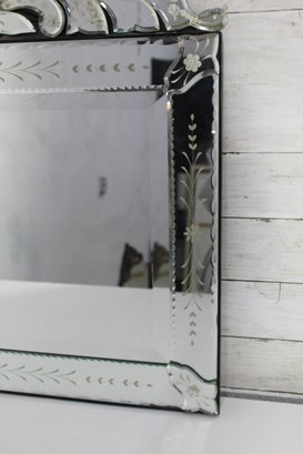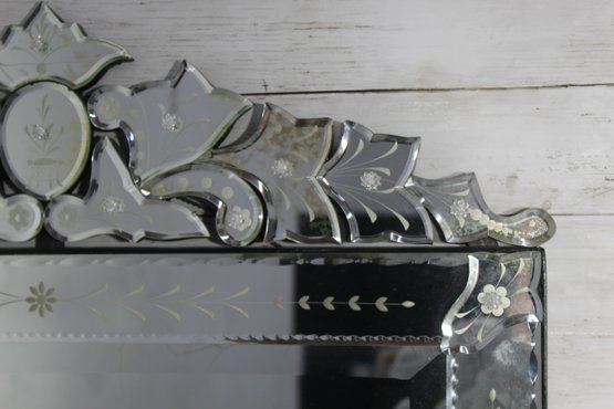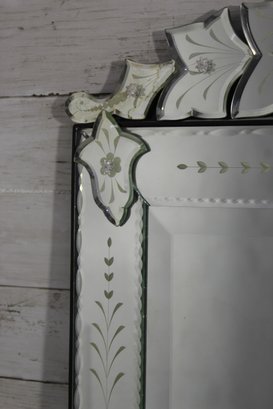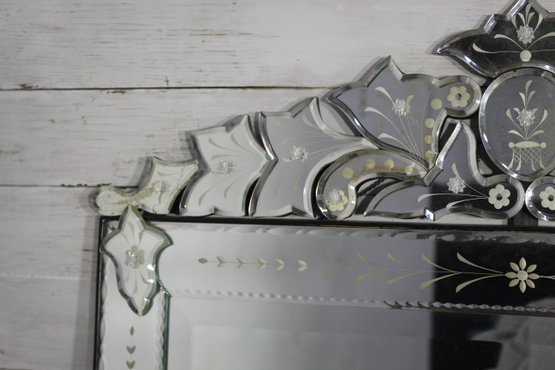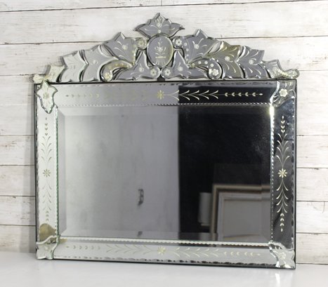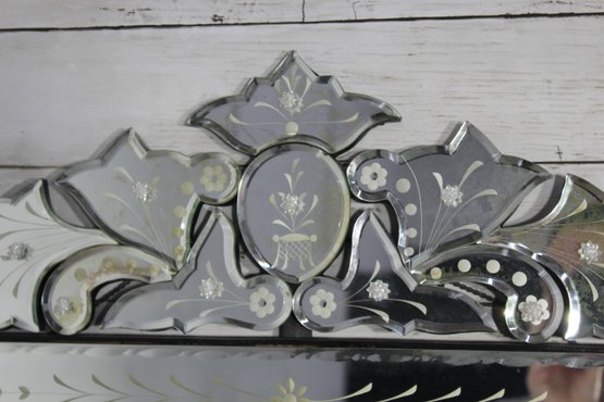 this stunning vintage Venetian-style wall mirror, beautifully crafted with ornate etched and beveled glass details. Measuring 27" x 28.5", this mirror is a striking statement piece that blends classic European charm with sophisticated artistry.