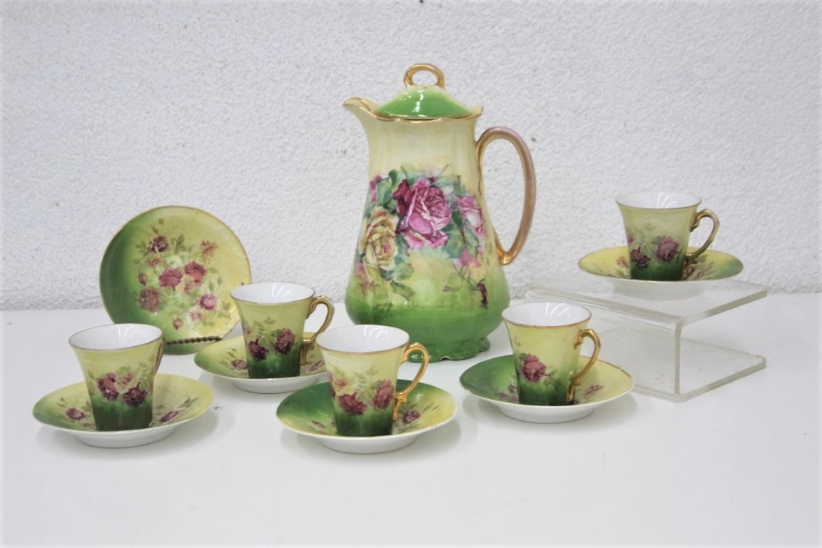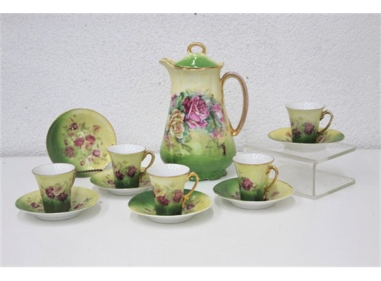 Vintage Victoria Austria Climbing Roses Green/Yellow Teapot With 5 Teacups