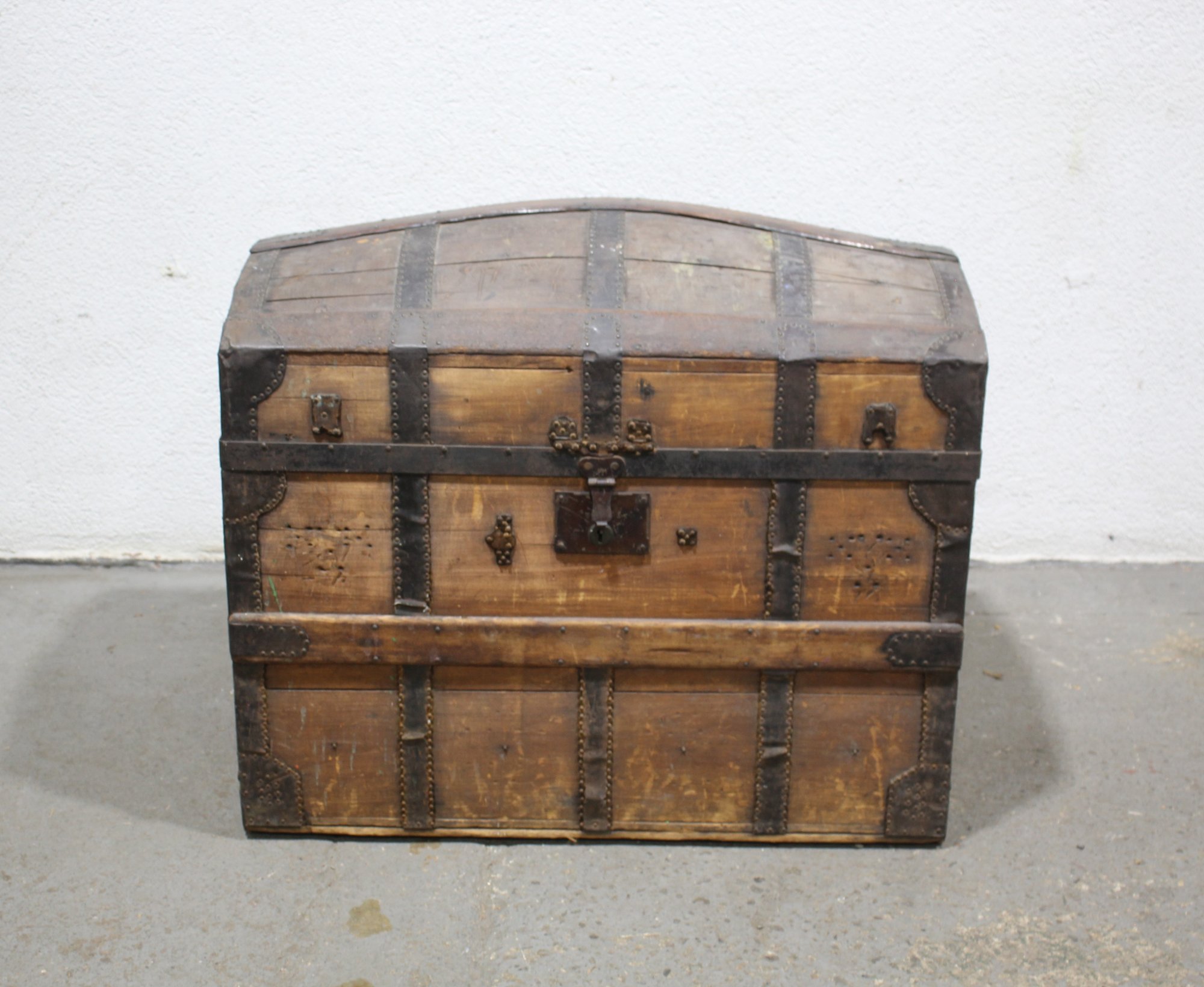 The domed top not only adds to its visual charm but also provided extra space for belongings, making it a preferred choice for long sea voyages and cross-country trips. The metal hardware, including latches and rivets, are original to the piece