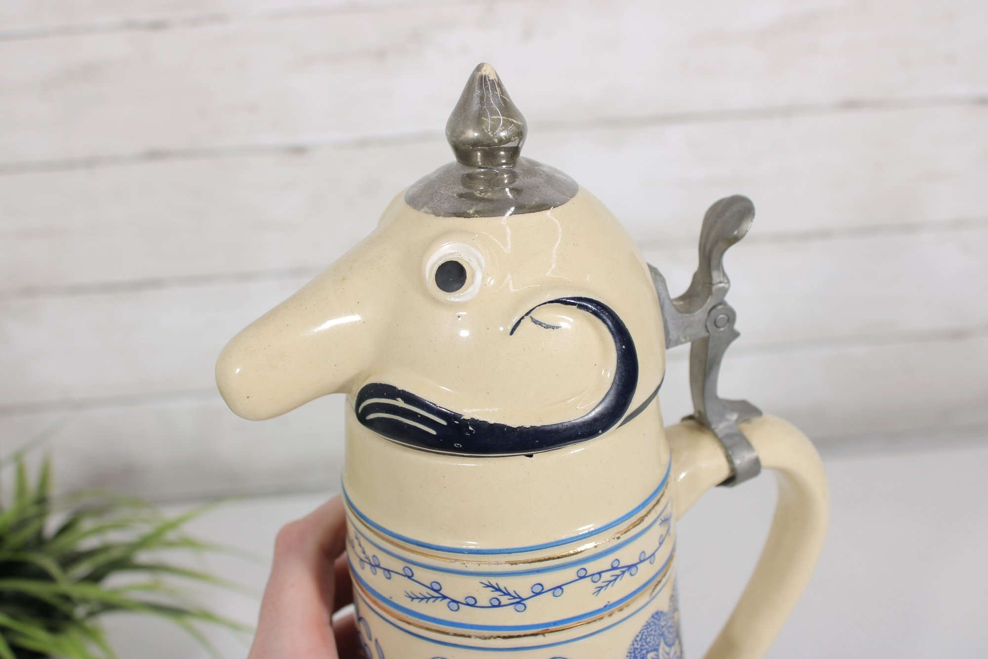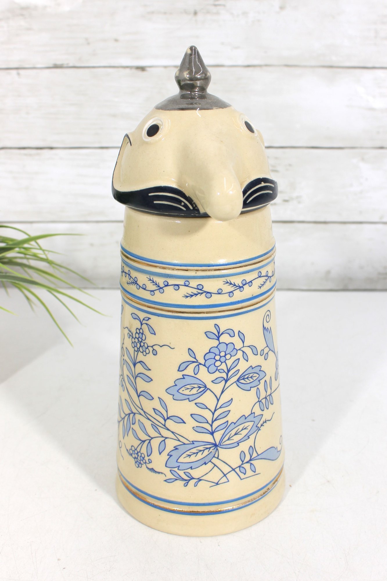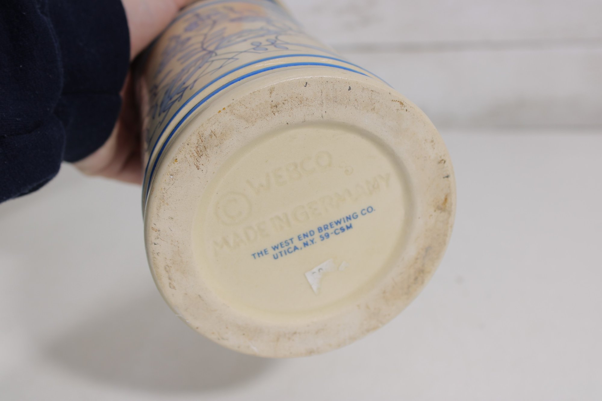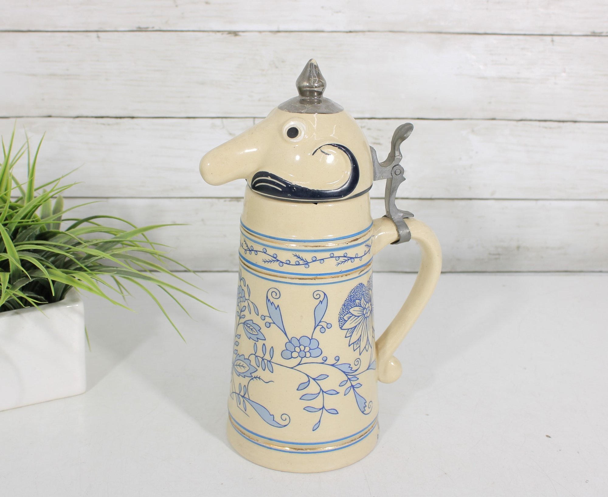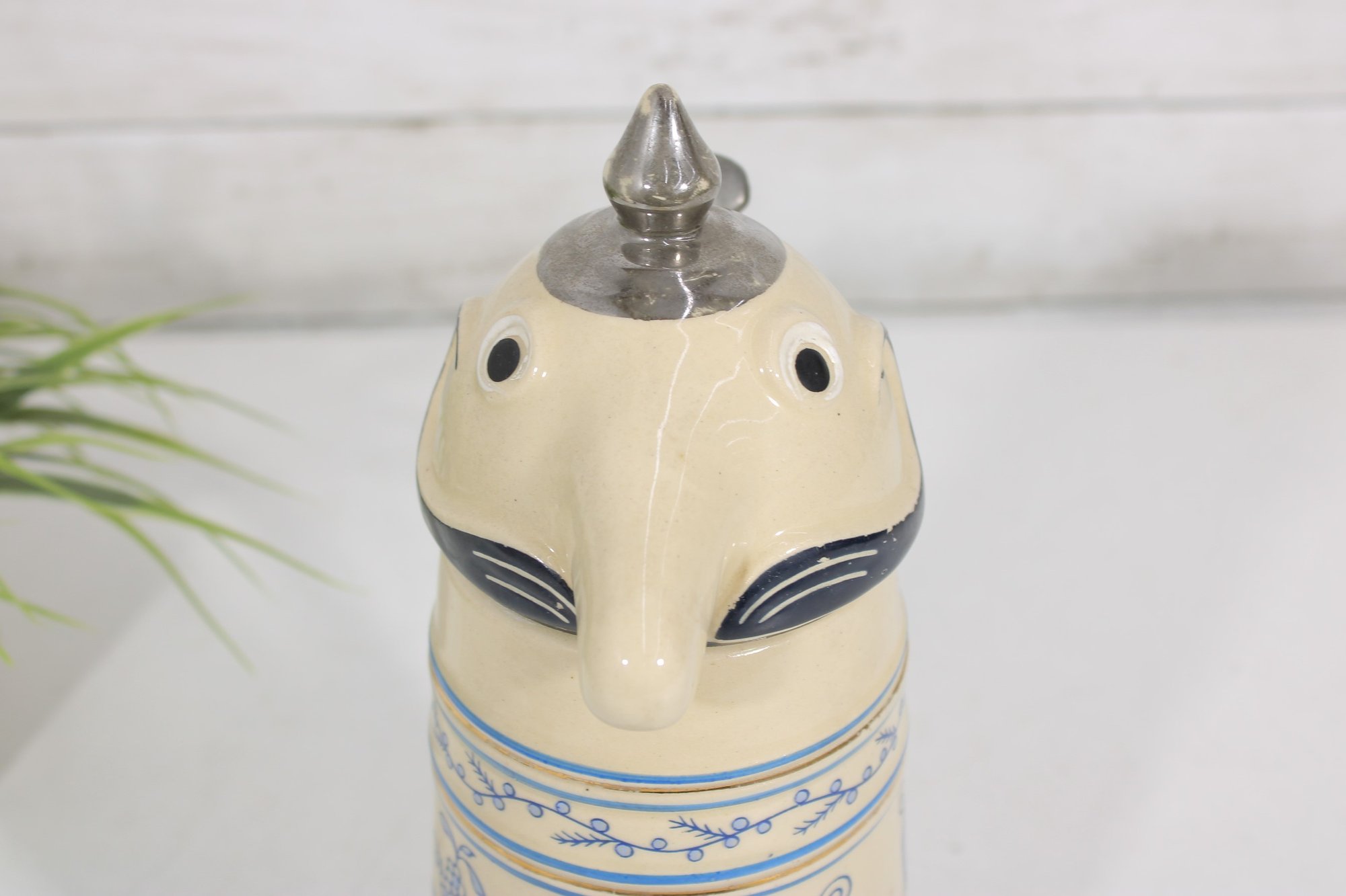 vintage WEBCO figural beer stein/pitcher produced for The West End Brewing Co., Utica, New York. This unique ceramic piece features a whimsical character-shaped design, with a long-nosed face forming the top of the stein and a decorative metal (pewter-style) hinged lid. The body is decorated in a classic cream glaze with blue folk-style motifs, giving it a traditional European beer stein look.