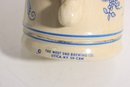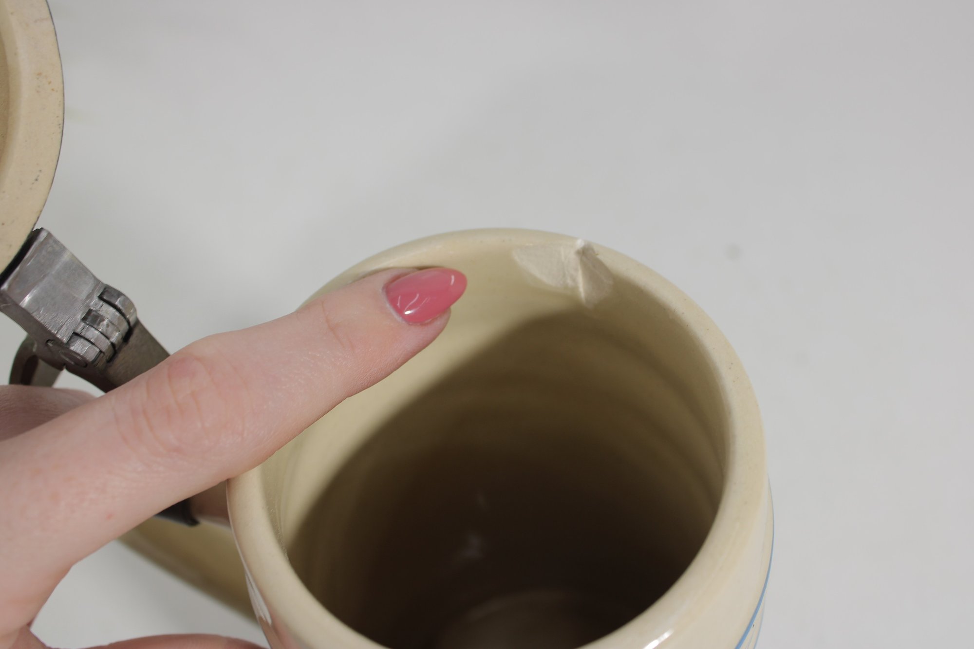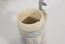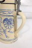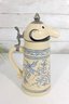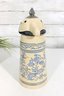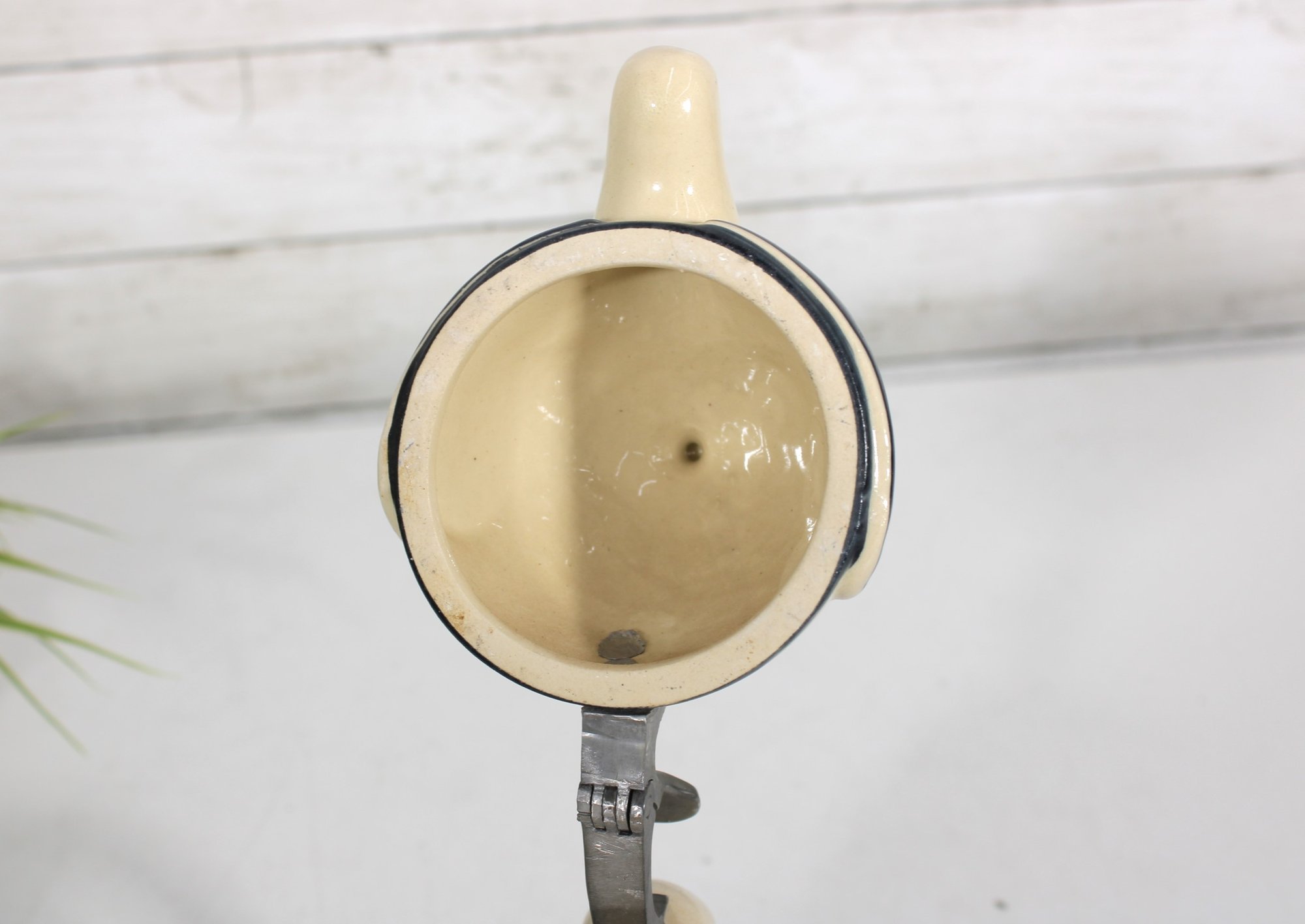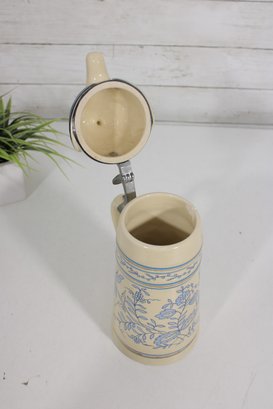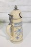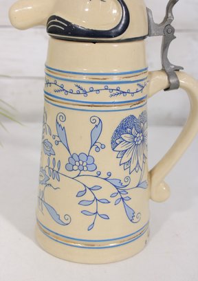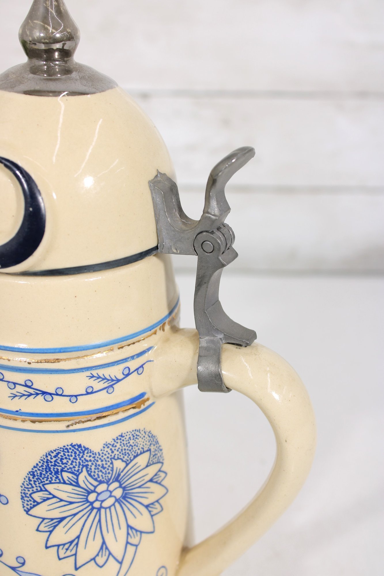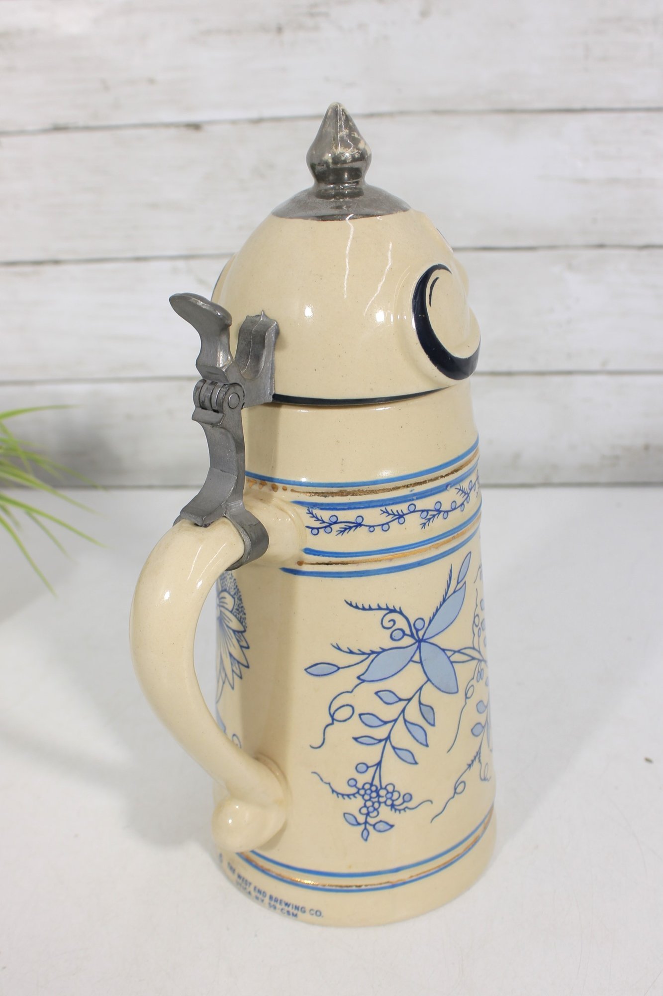 vintage WEBCO figural beer stein/pitcher produced for The West End Brewing Co., Utica, New York. This unique ceramic piece features a whimsical character-shaped design, with a long-nosed face forming the top of the stein and a decorative metal (pewter-style) hinged lid. The body is decorated in a classic cream glaze with blue folk-style motifs, giving it a traditional European beer stein look.