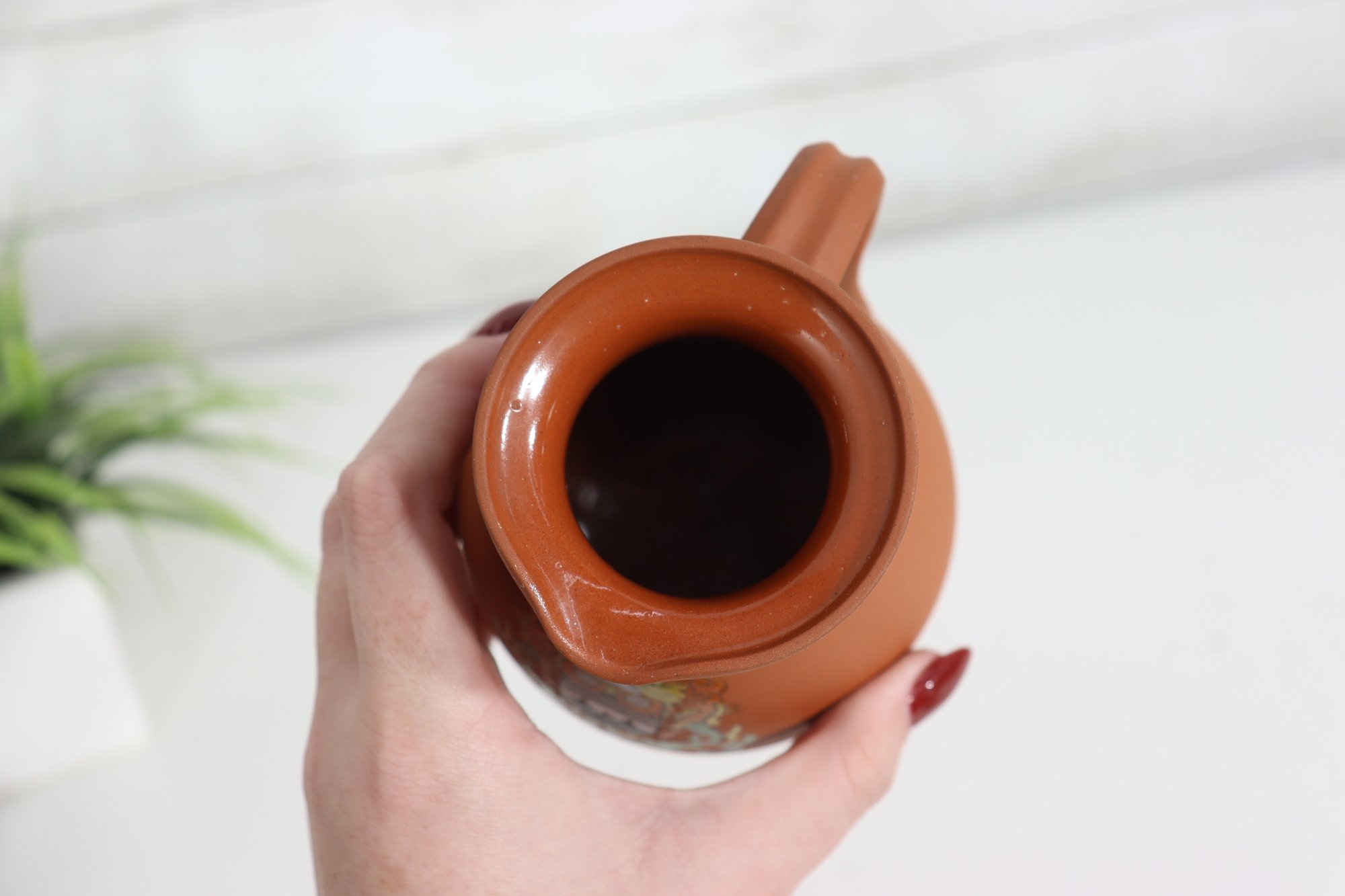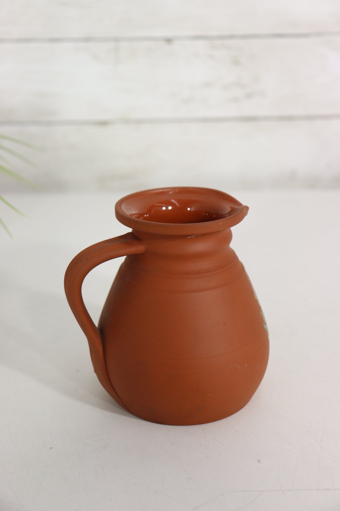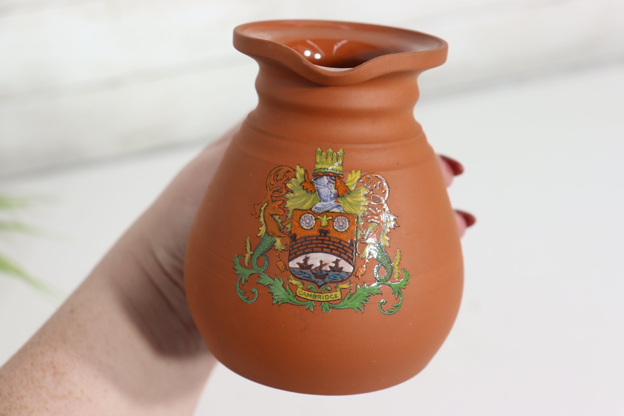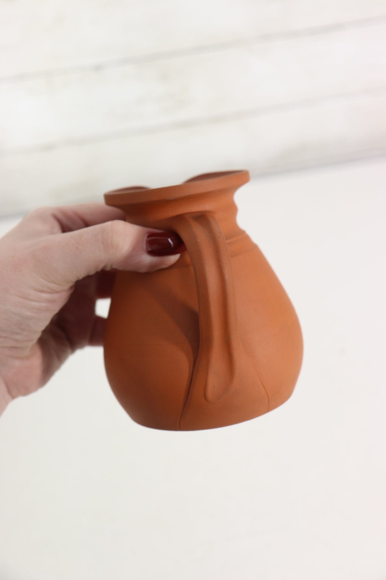 vintage ERPHILA ceramic pitcher, made in Germany. Crafted in a warm terracotta tone, the piece is accented with a colorful heraldic crest on the front, adding character and Old World appeal. The small scale and rounded form make it perfect as a creamer, miniature pitcher, or decorative accent.