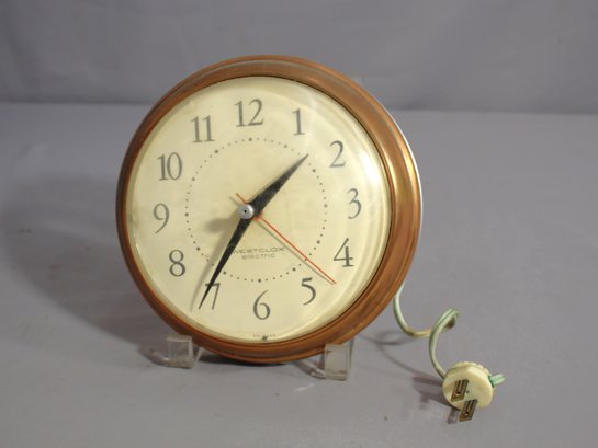 this clock is a quintessential piece from mid-century modern interiors. The cream-colored face is marked by distinct black numbers and minute markers, accented with a subtle red second hand for a pop of color. The casing's warm copper tone enhances its retro appeal, making it a standout accessory for any room.