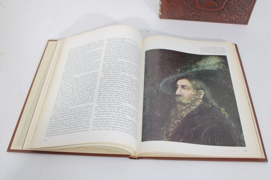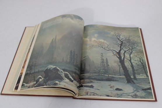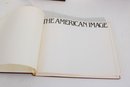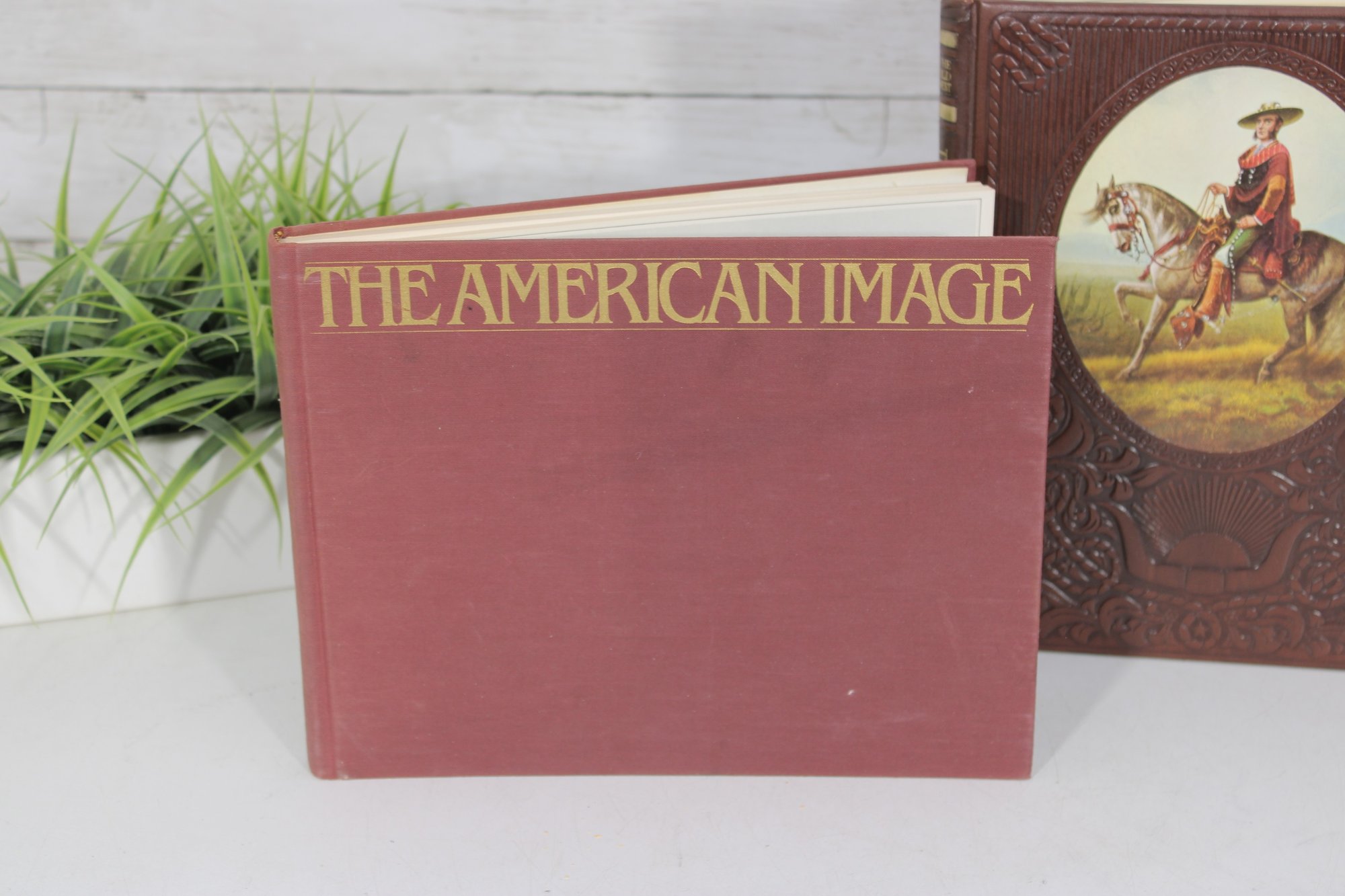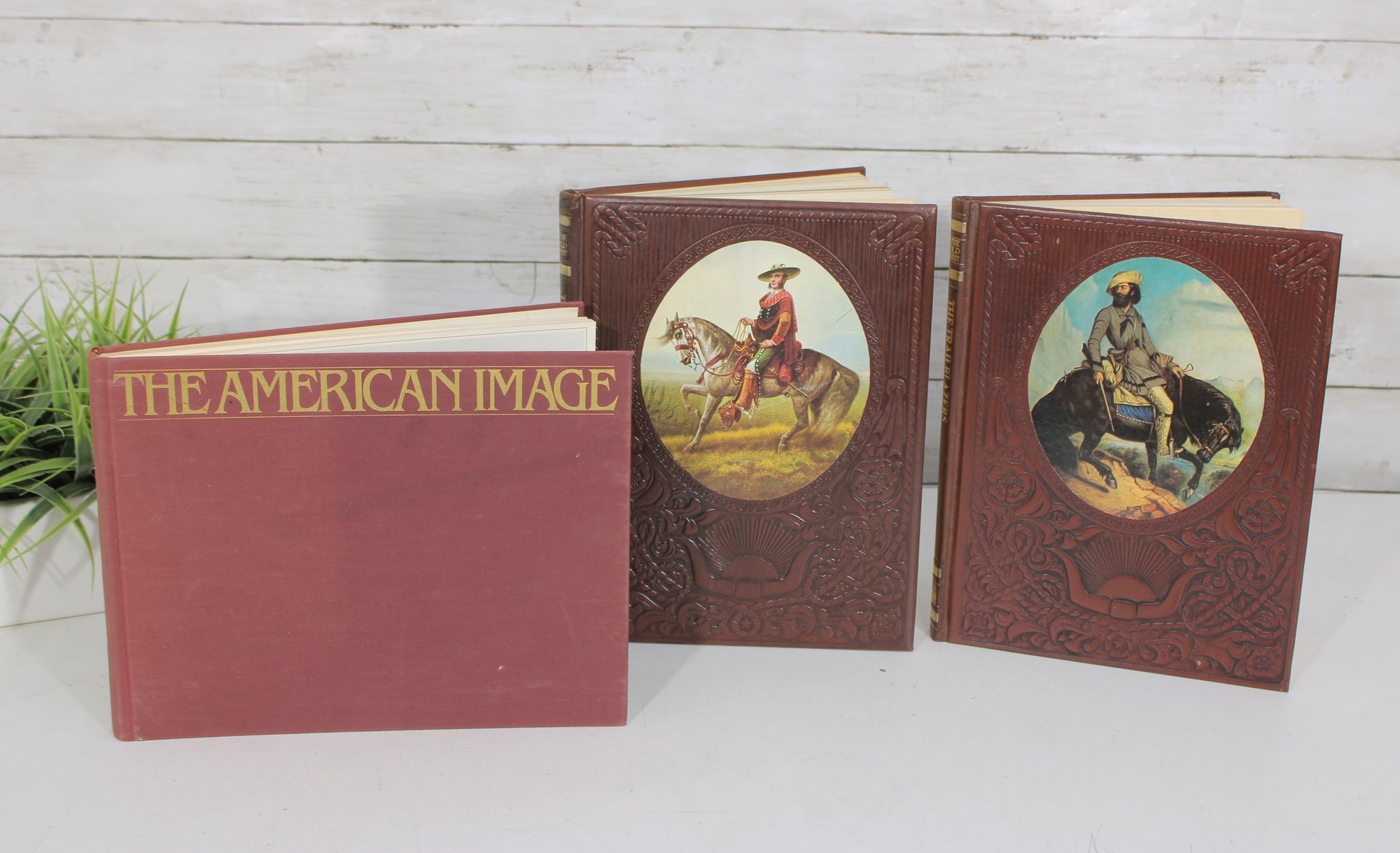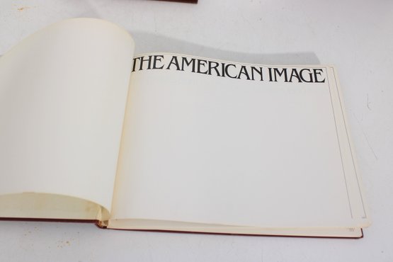 Nice lot of vintage Western Americana and historical photography coffee table books, featuring richly illustrated pages filled with classic imagery and artwork. This collection includes The American Image: Photographs from the National Archives 1860–1960 along with two embossed Western-themed art volumes showcasing cowboy scenes, historical imagery, and landscape artwork.