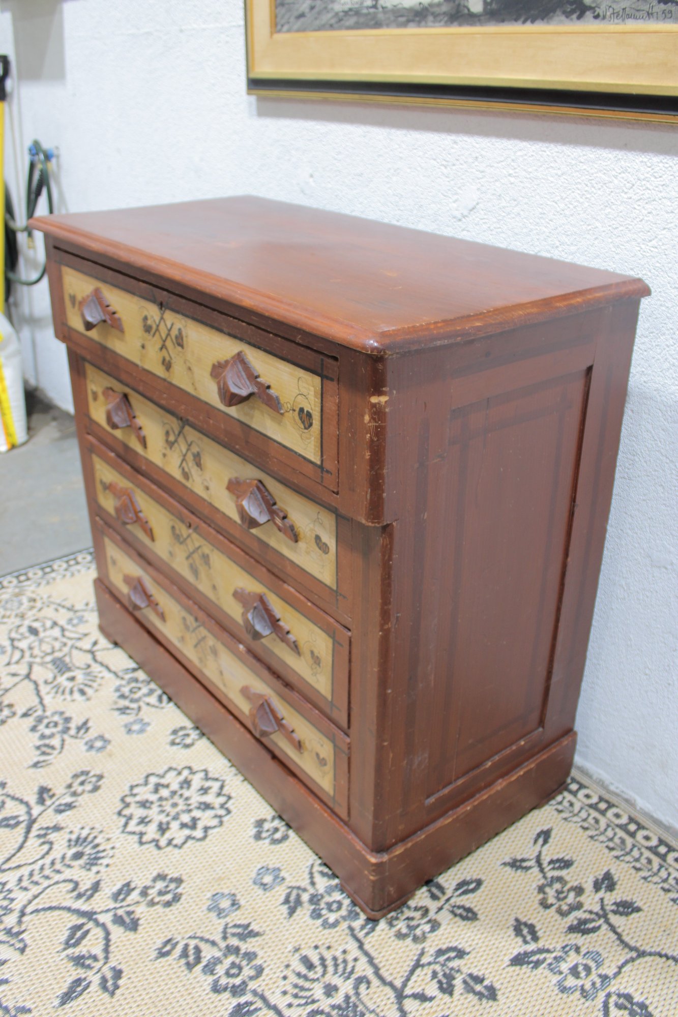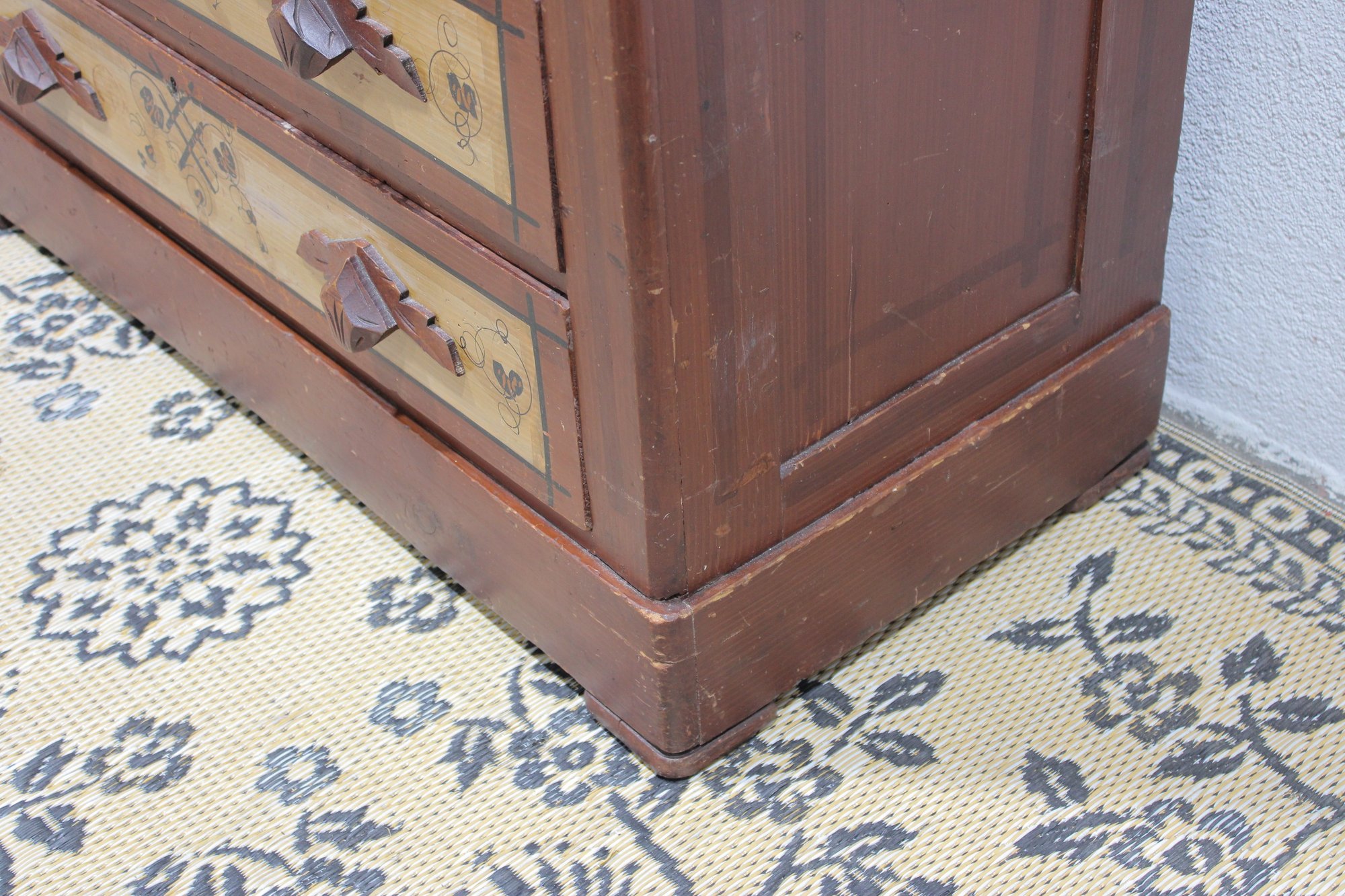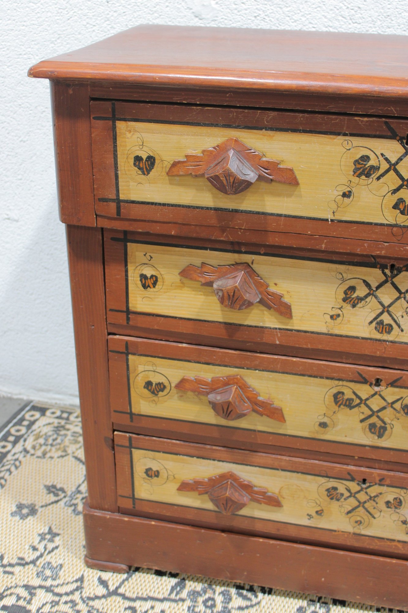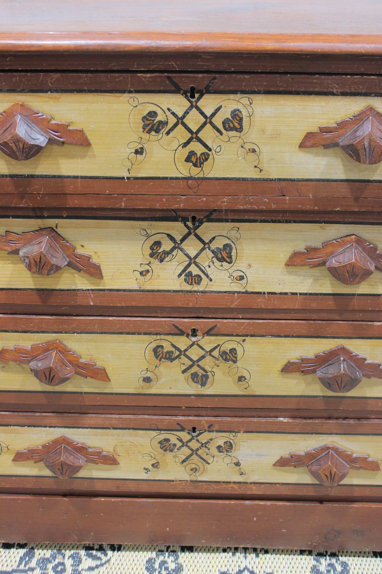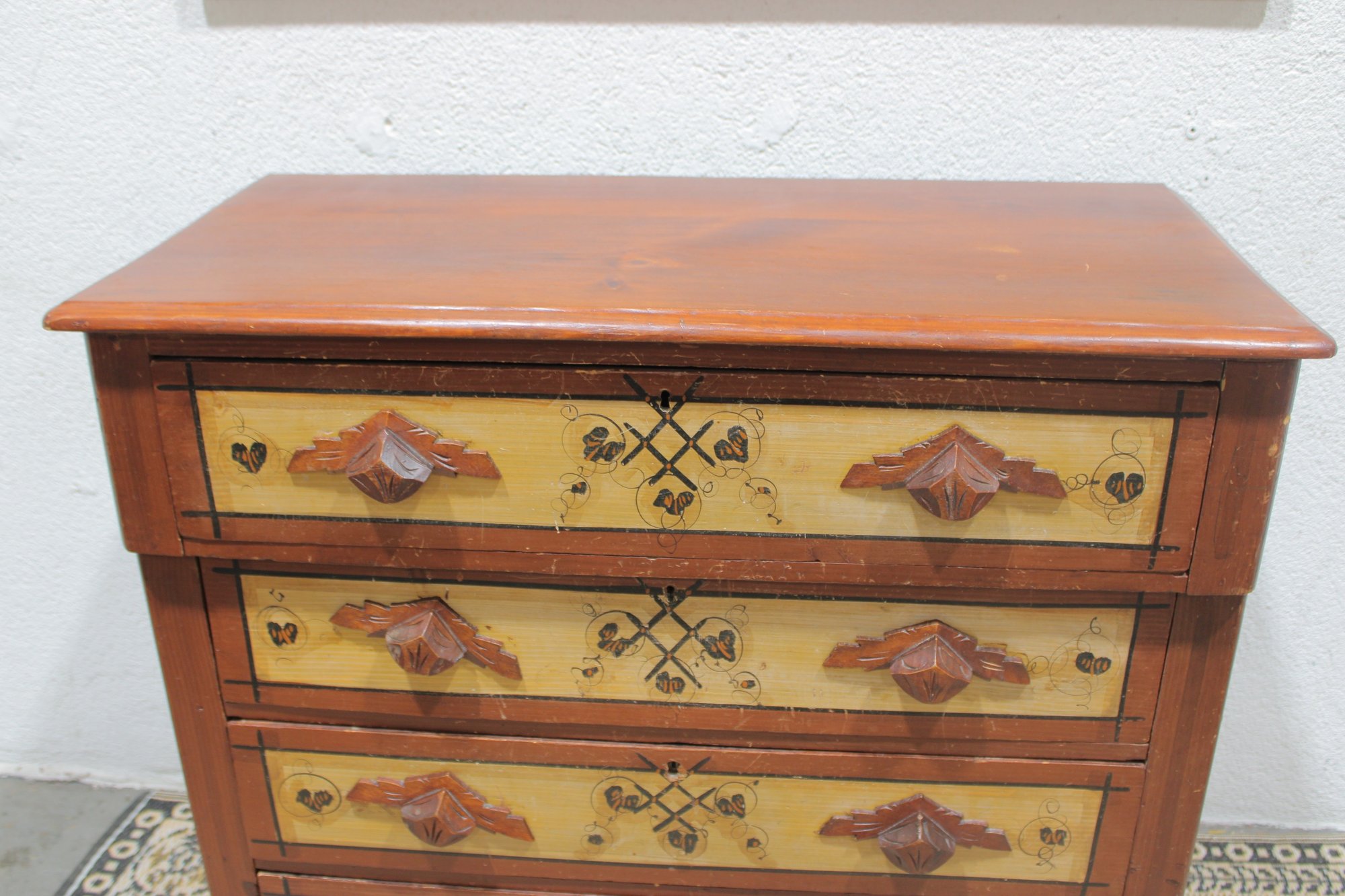Each of the four drawers features decorative carved wood handles and painted panels, creating a unique and eye-catching design. The chest offers ample storage space for clothing, linens, or household items while adding a rustic decorative element to a room.