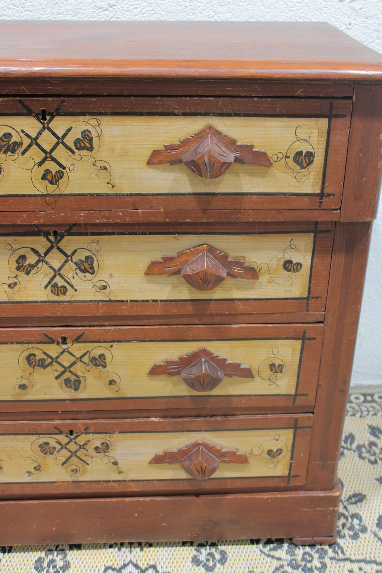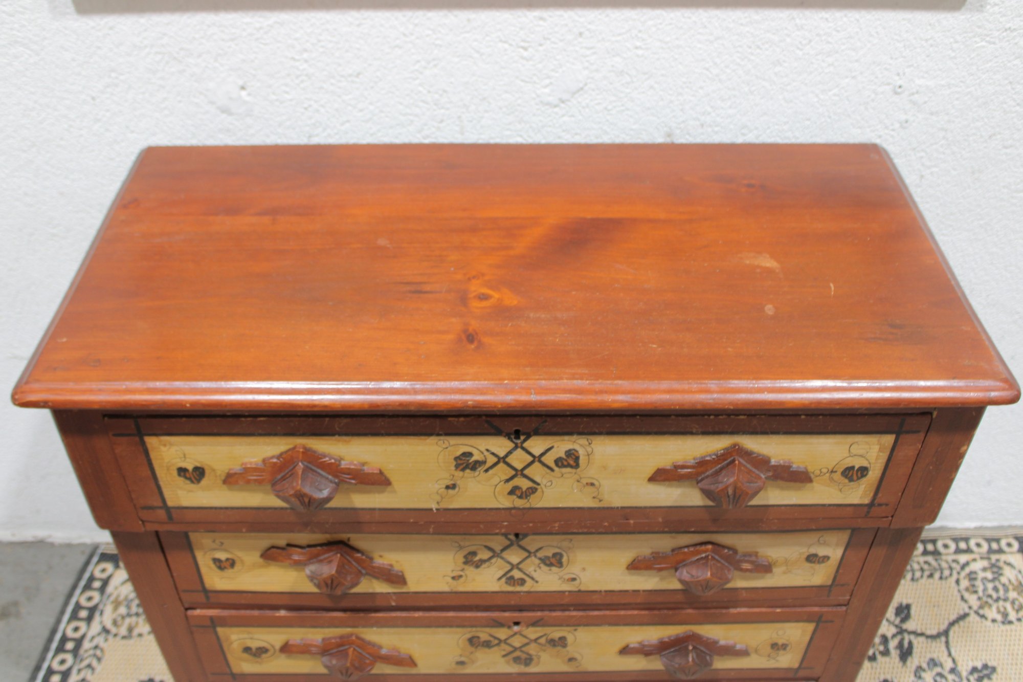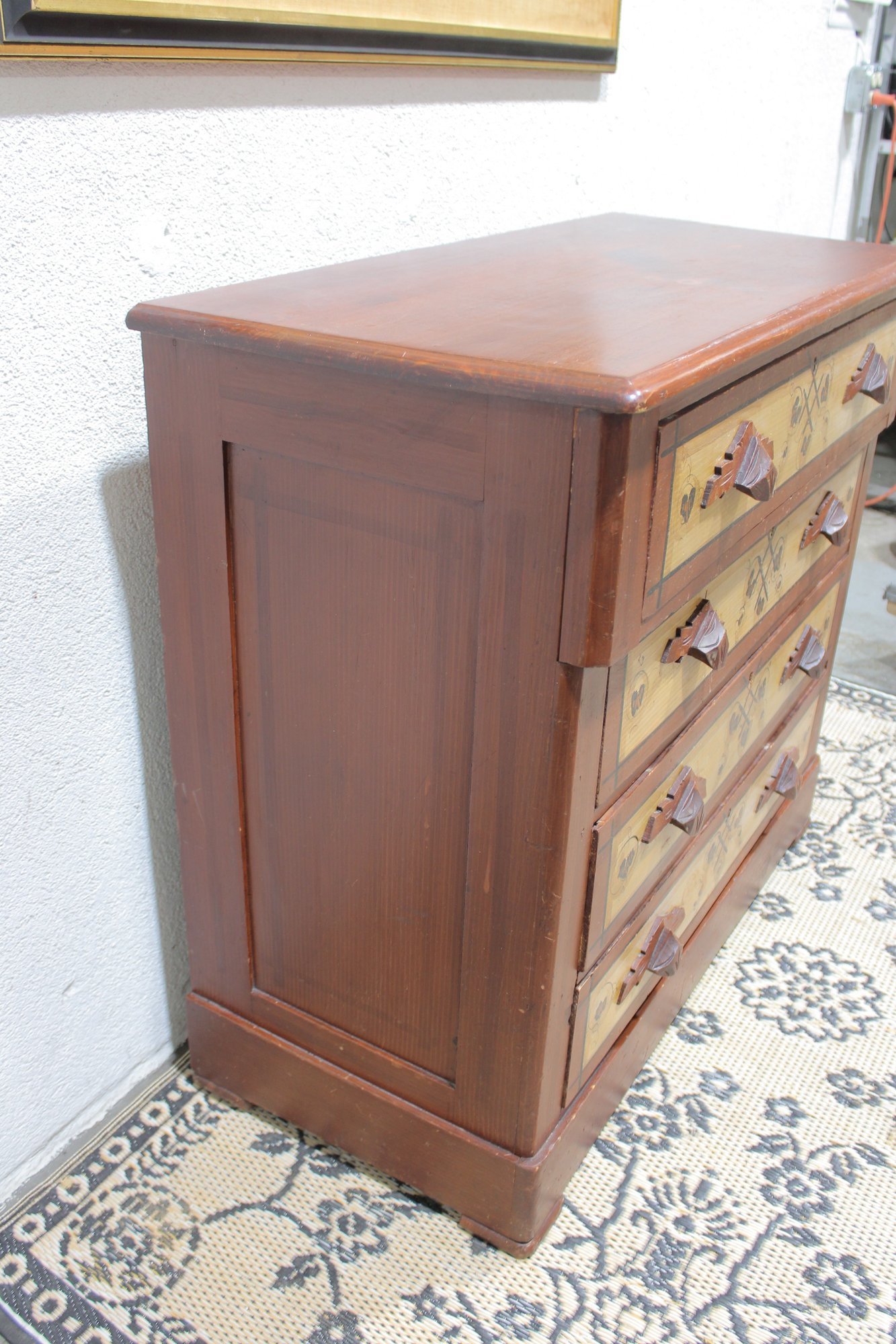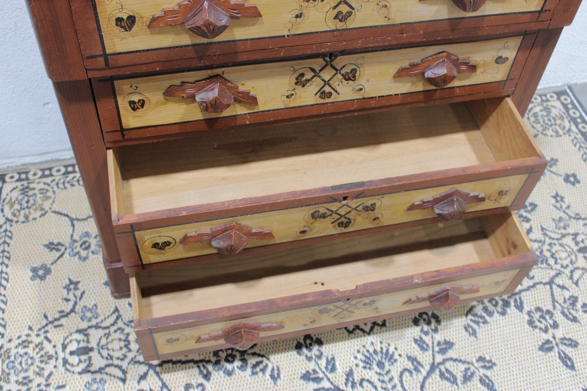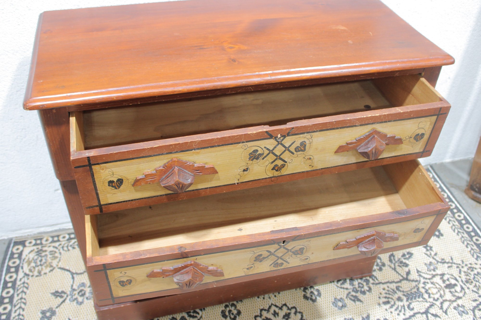 Each of the four drawers features decorative carved wood handles and painted panels, creating a unique and eye-catching design. The chest offers ample storage space for clothing, linens, or household items while adding a rustic decorative element to a room.