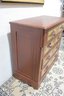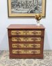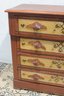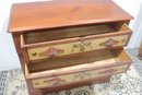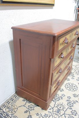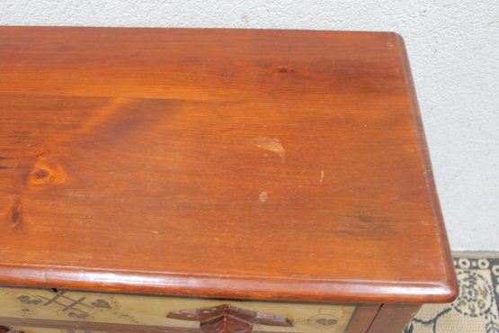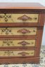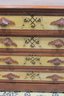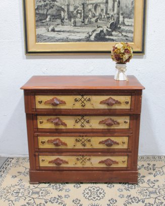 Vintage Western or rustic style four-drawer chest featuring decorative painted drawer fronts and carved wooden pulls. The piece has a warm wood finish with hand-painted panel accents in earthy tones, decorated with geometric and crossed motif designs that give it a distinctive Southwestern or ranch-style character.