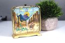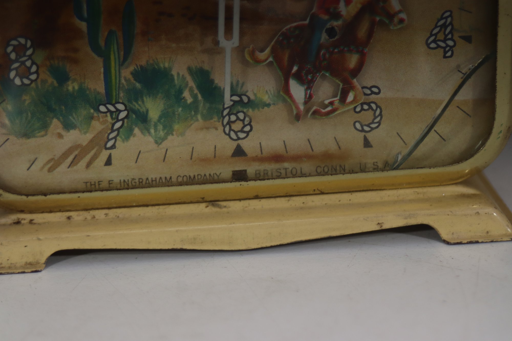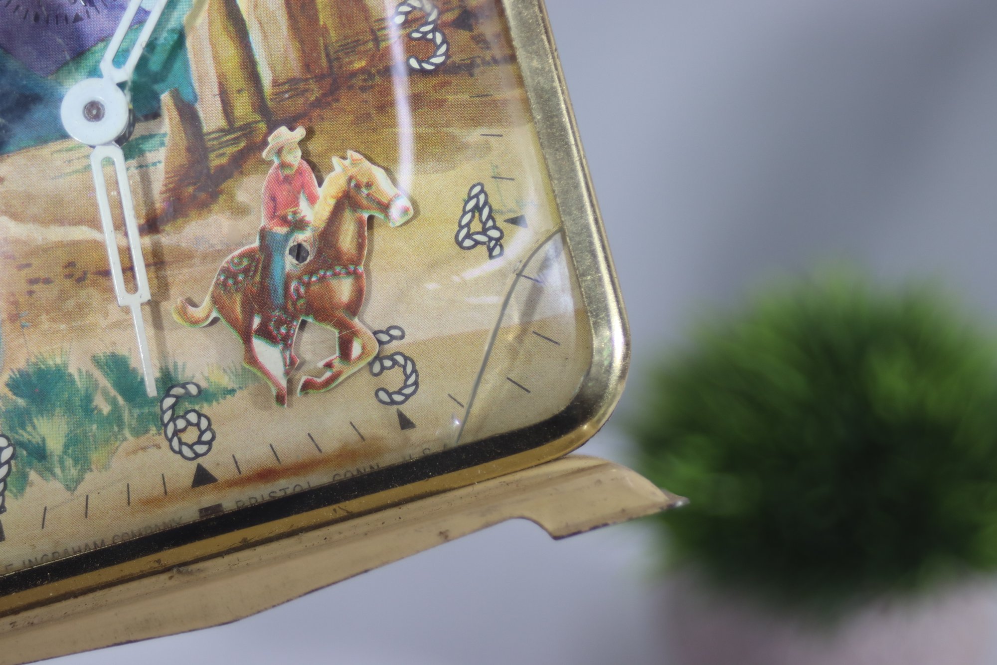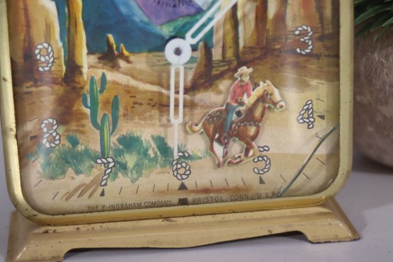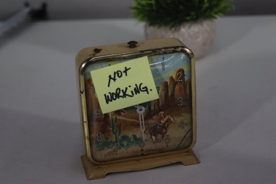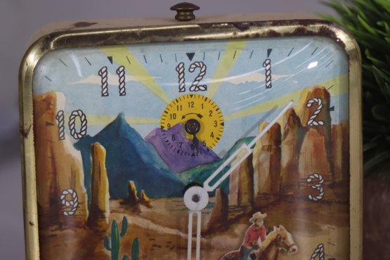 This charming vintage Western-themed alarm clock features a colorful cowboy and desert landscape scene, capturing the essence of the American West. The square metal case with a gold-tone finish gives it a classic, mid-century look, making it a great decorative collectible or restoration project.