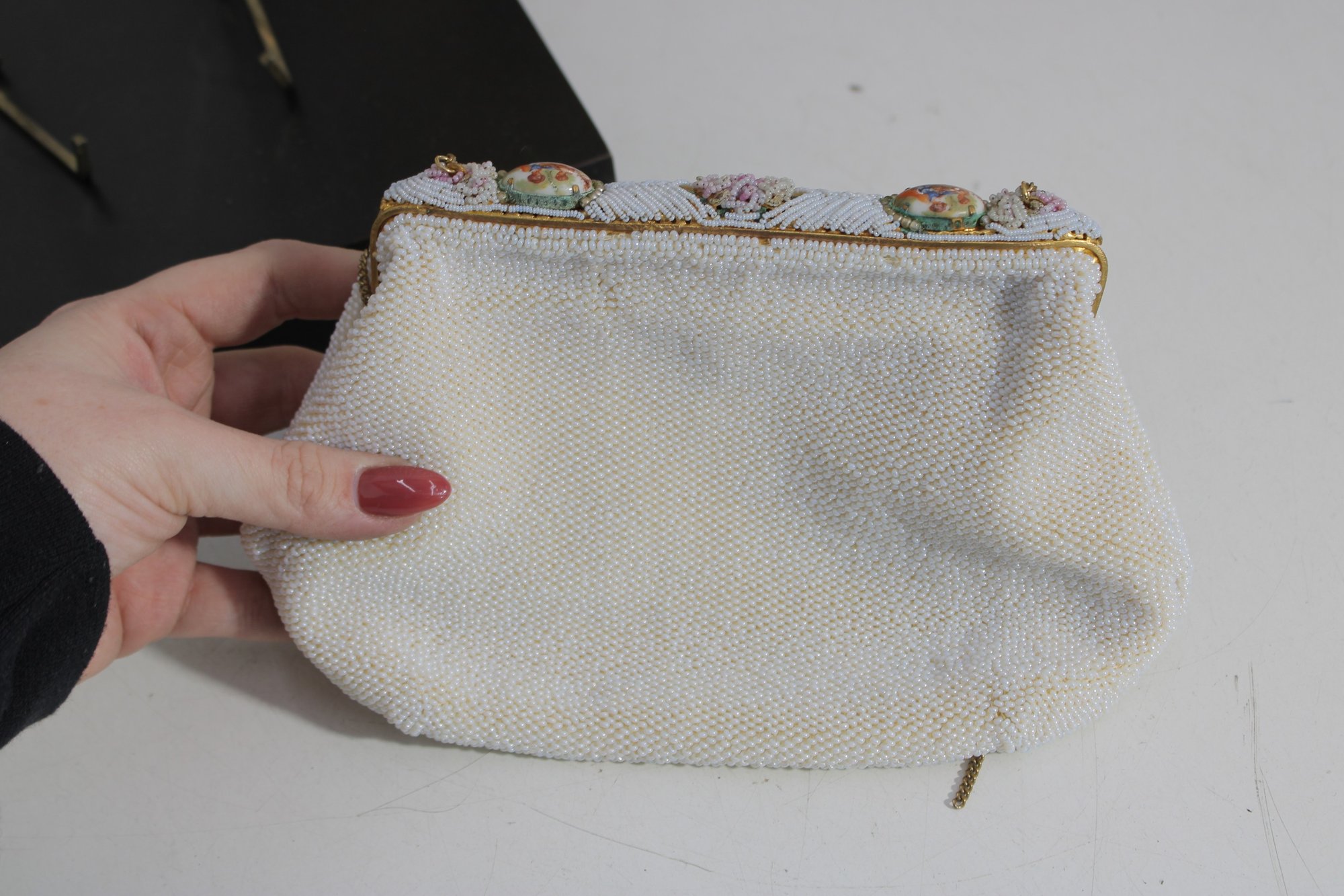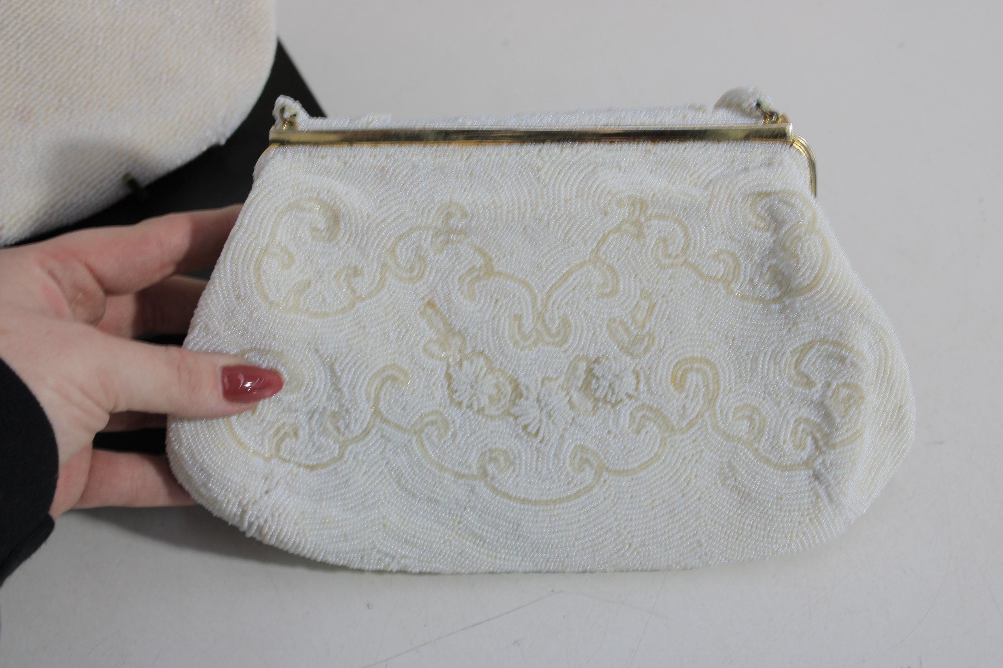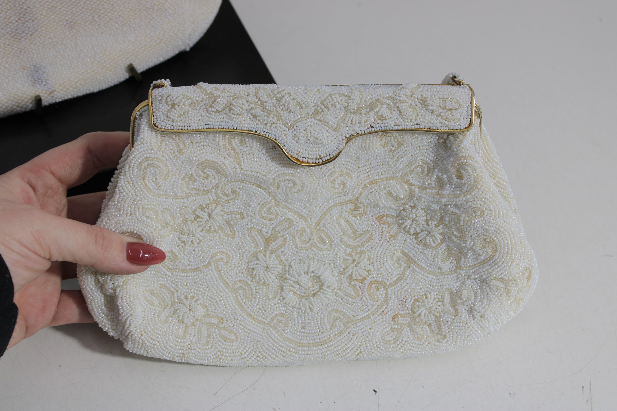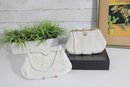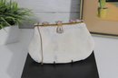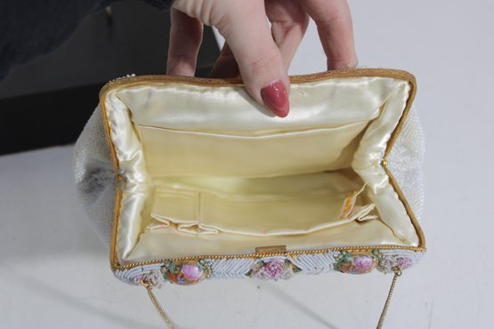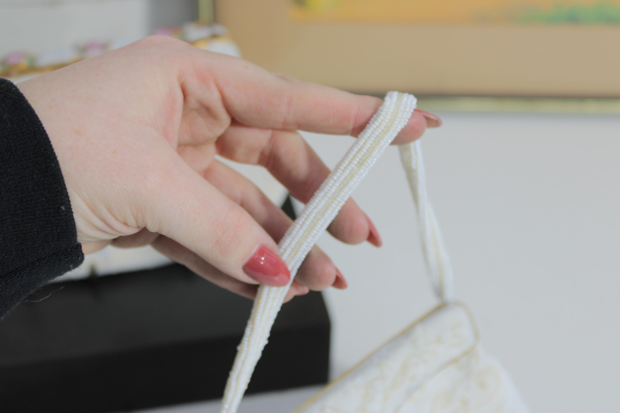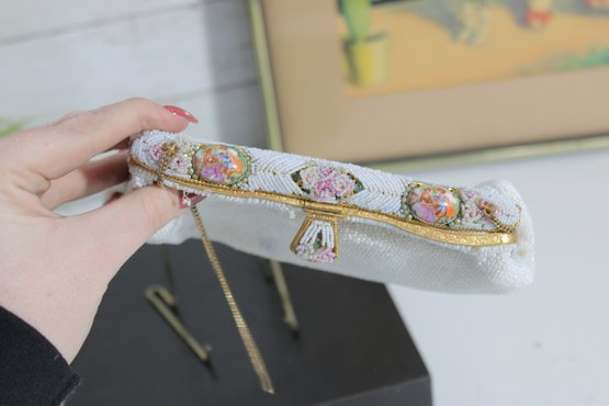 Beautiful vintage white evening purse adorned with delicate beading in an elegant floral and scroll pattern. This timeless handbag features a softly structured silhouette, gold-tone frame, and a matching beaded handle for graceful hand-carry.