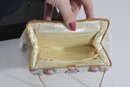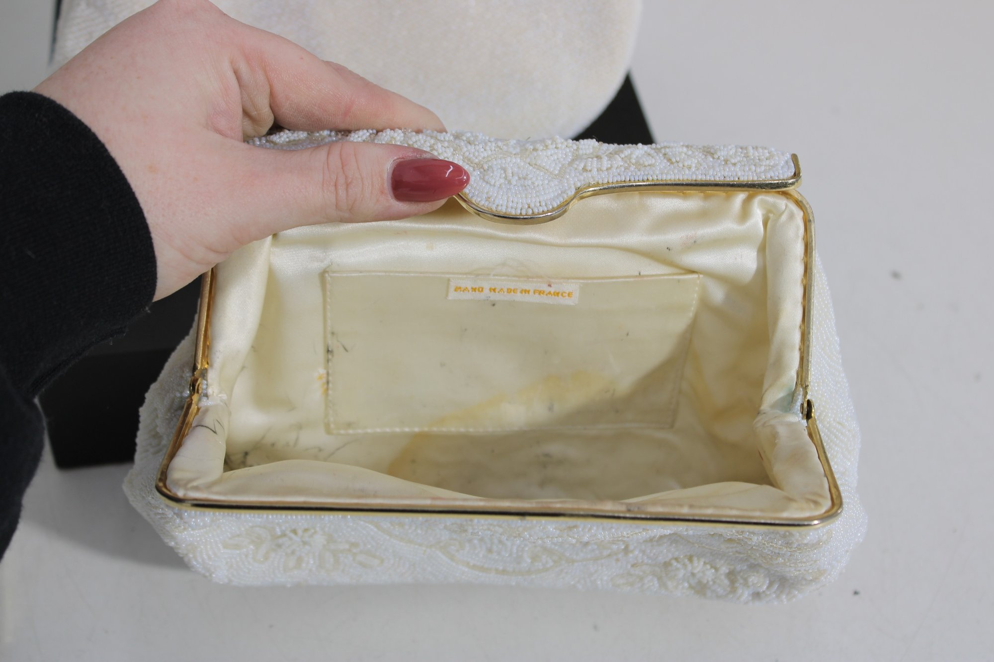 The interior is satin-lined and labeled, offering space for essentials while maintaining a refined, formal look. Perfect for weddings, bridal wear, cocktail parties, or any special occasion where classic vintage style shines.