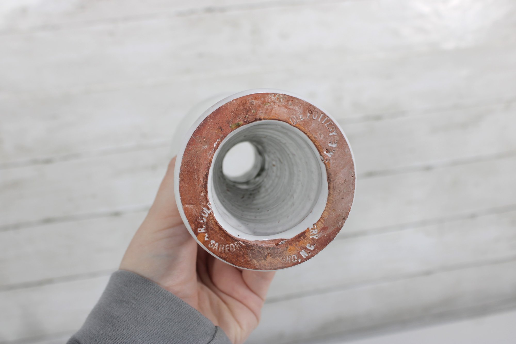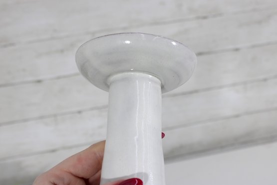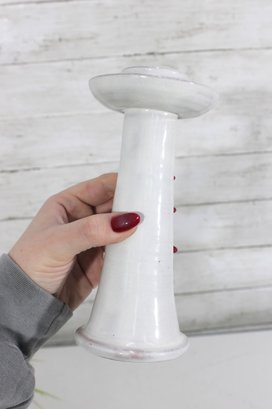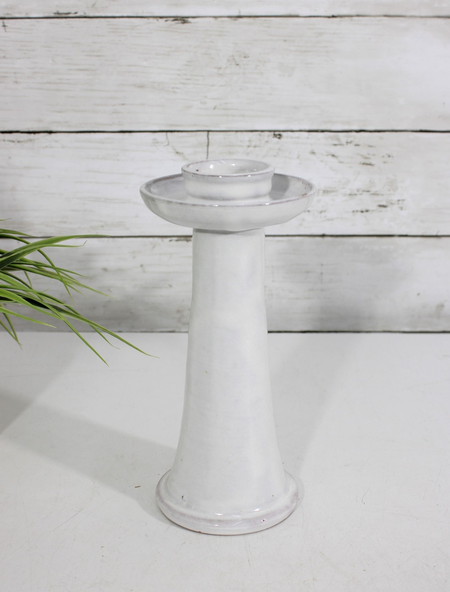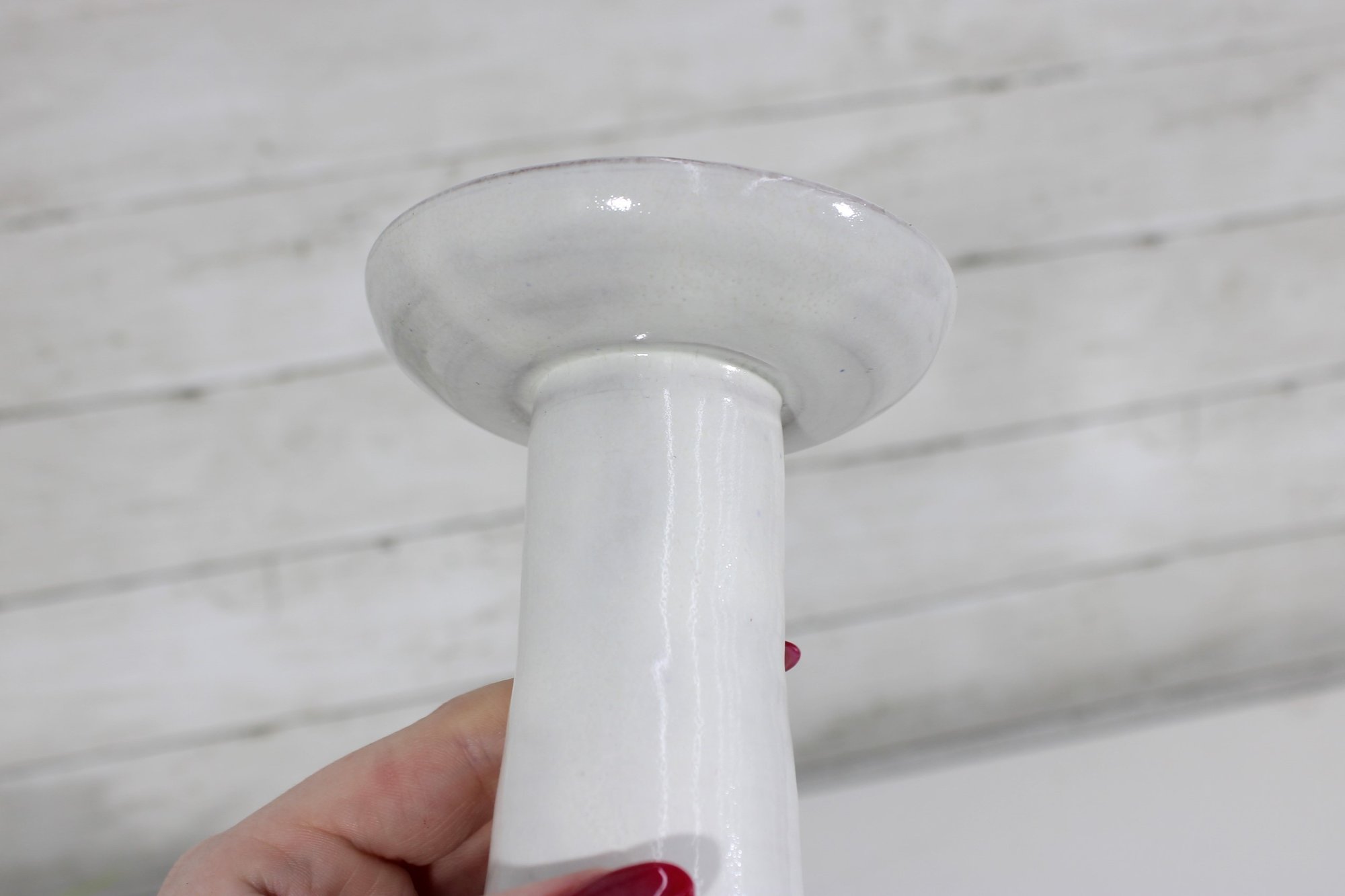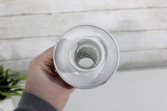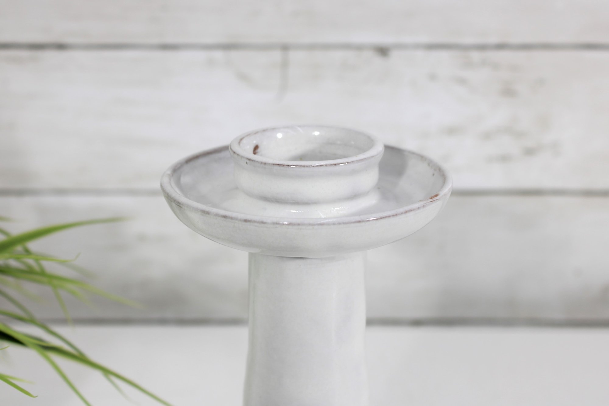 Classic vintage ceramic chamberstick-style candle holder featuring a tall pedestal form with an integrated drip tray and finger loop handle. Finished in a simple white glaze, this piece offers a timeless look that works well with farmhouse, cottage, or traditional décor.