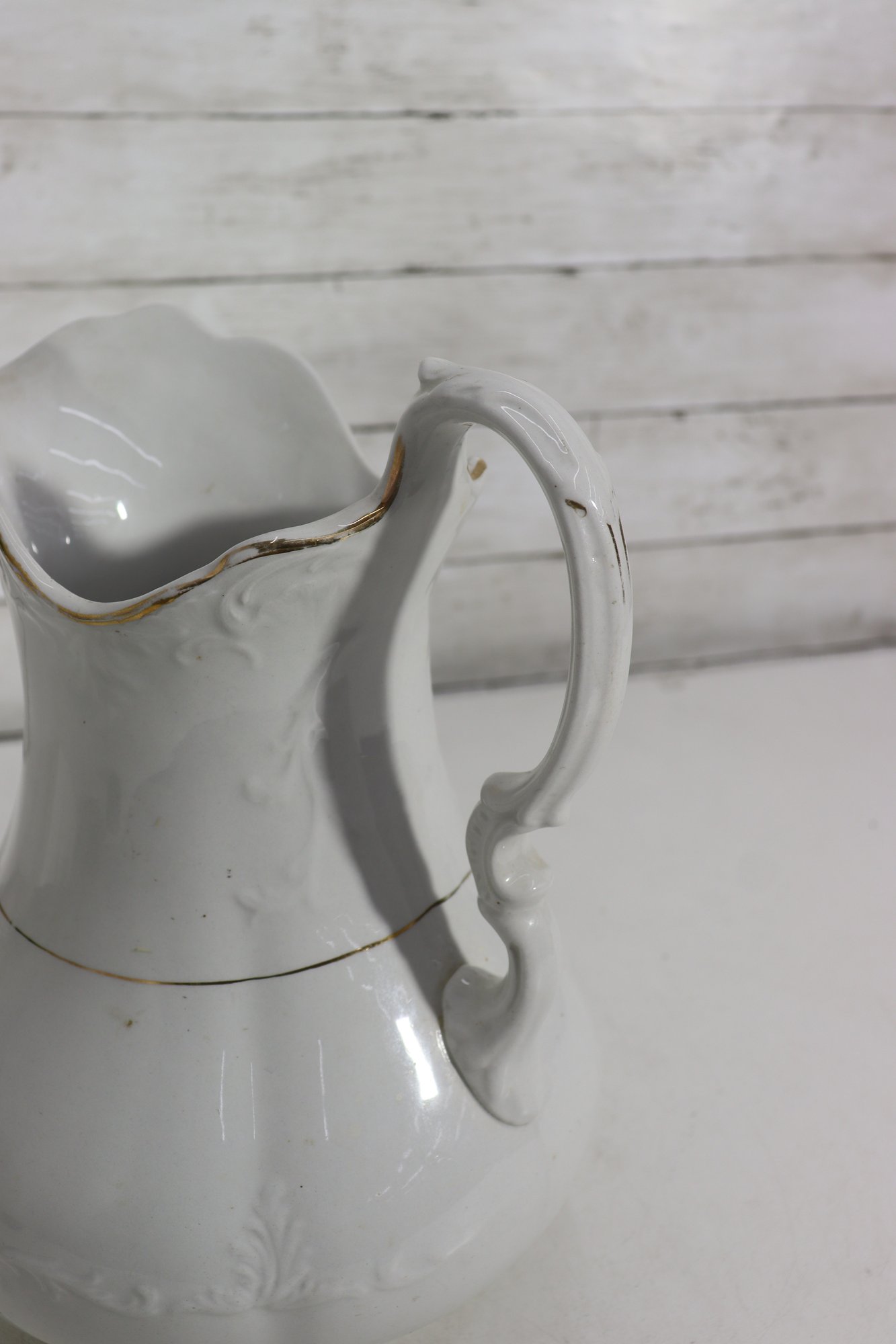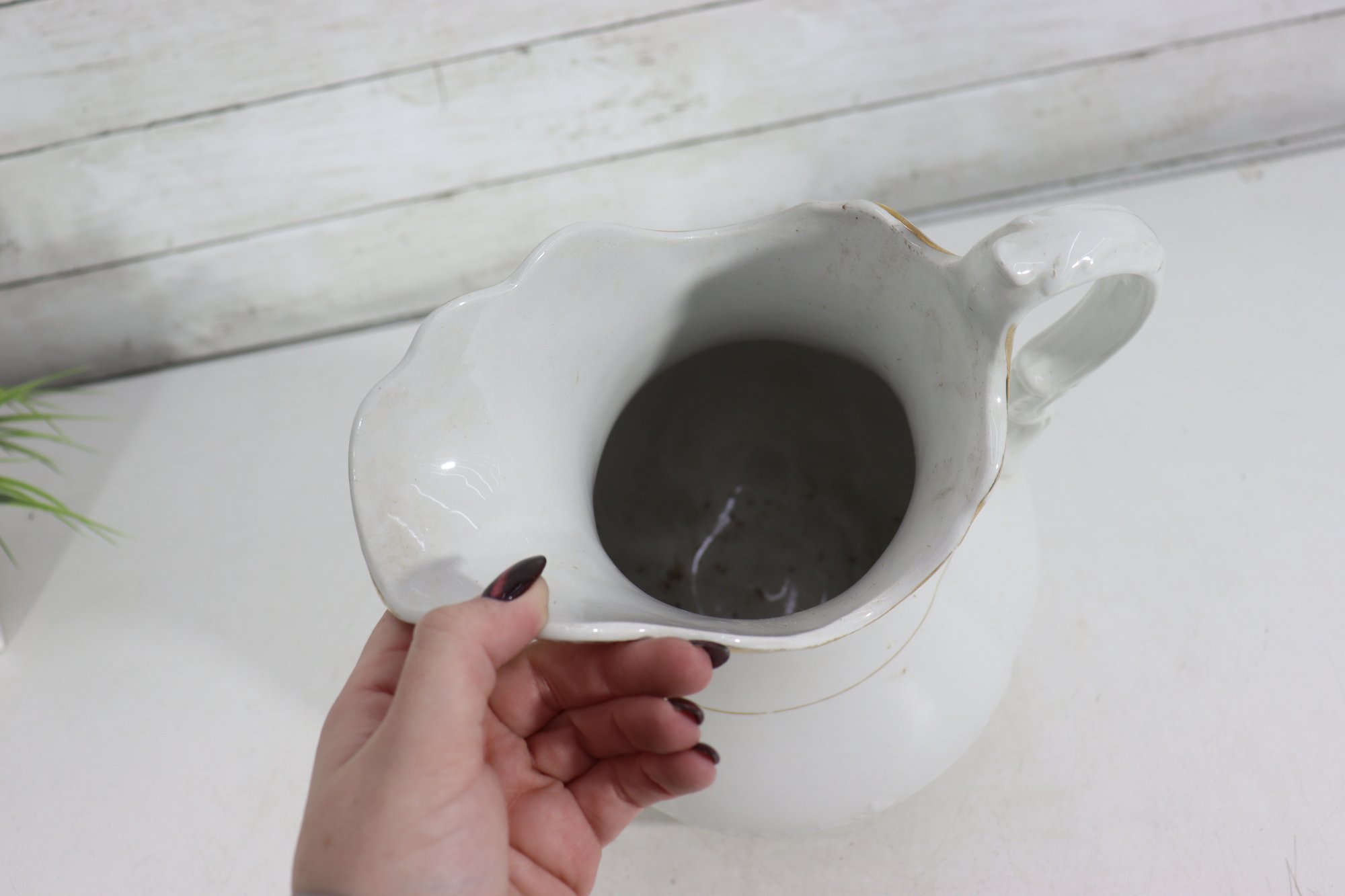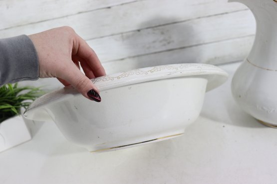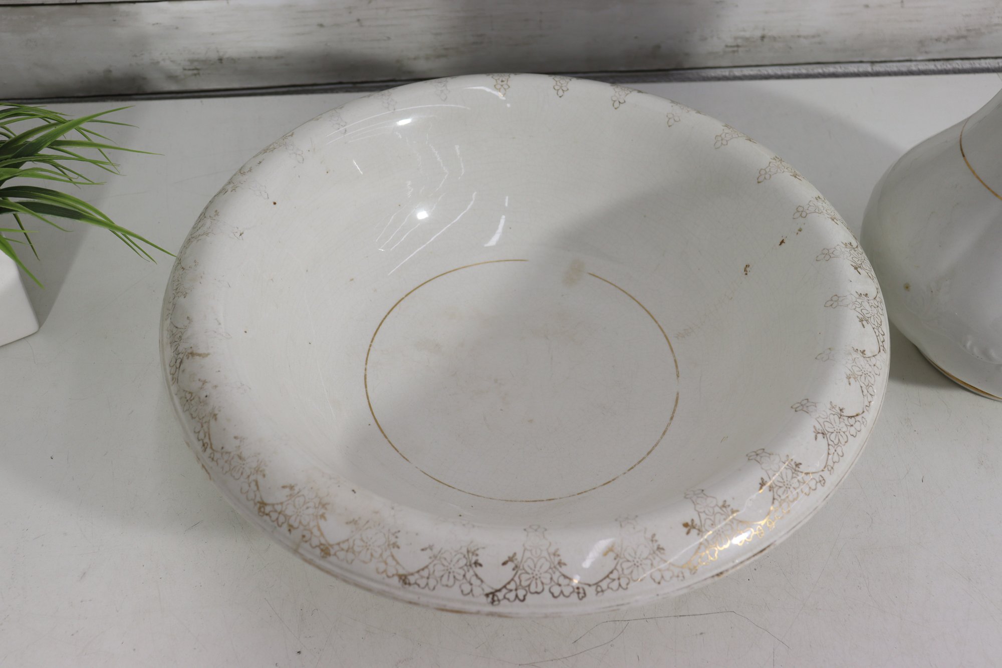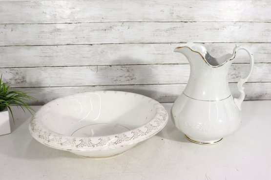 vintage white ironstone bowl and pitcher (ewer) set, featuring a delicate gold floral border around the rim of the bowl and subtle gold accents on the pitcher. This classic pairing reflects traditional English washstand style, making it both a functional decorative set and a charming display piece.