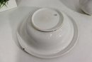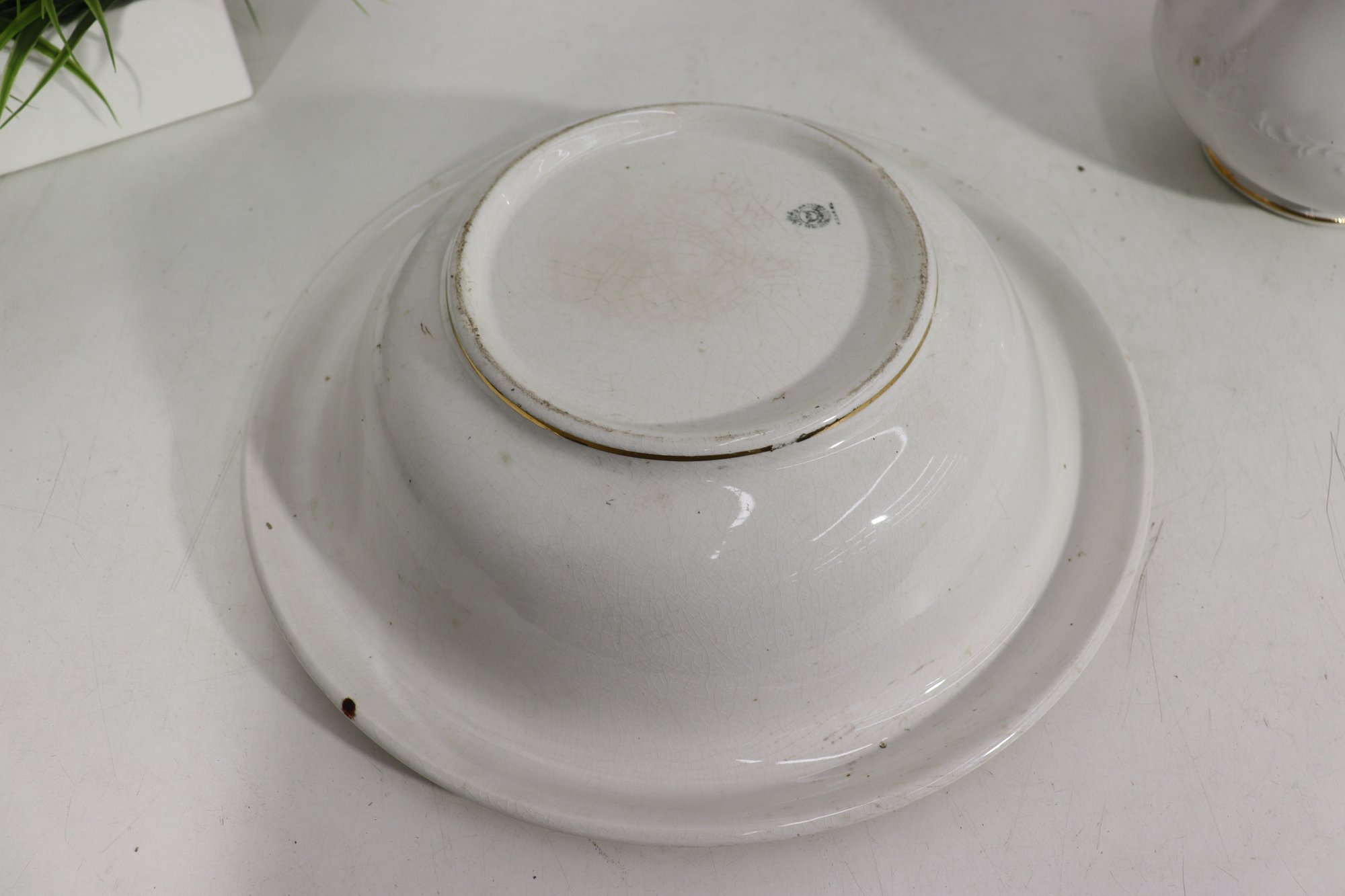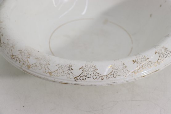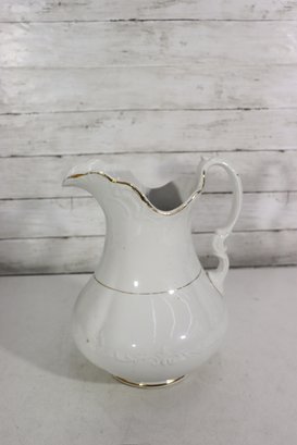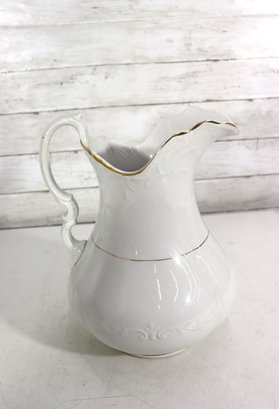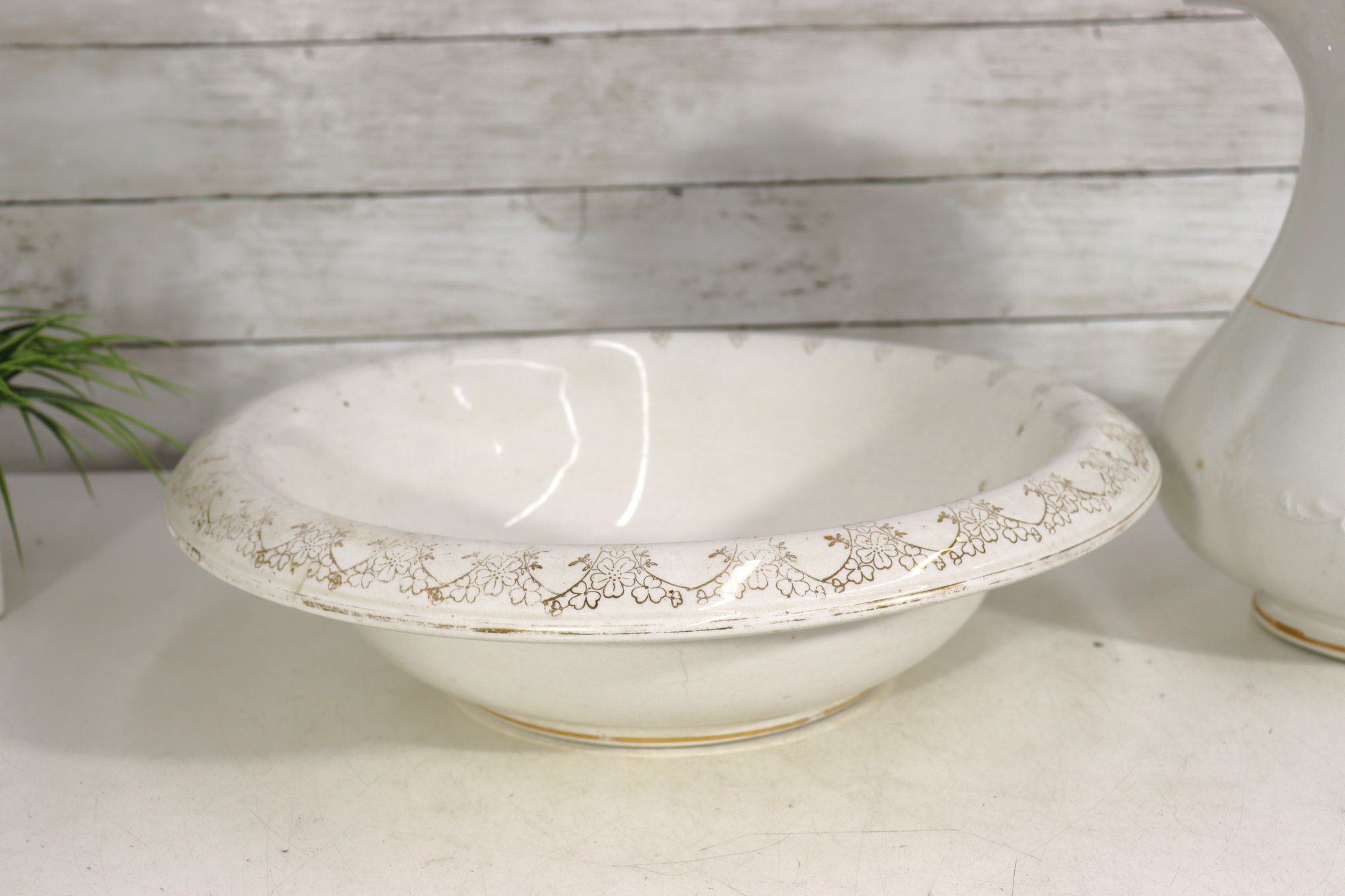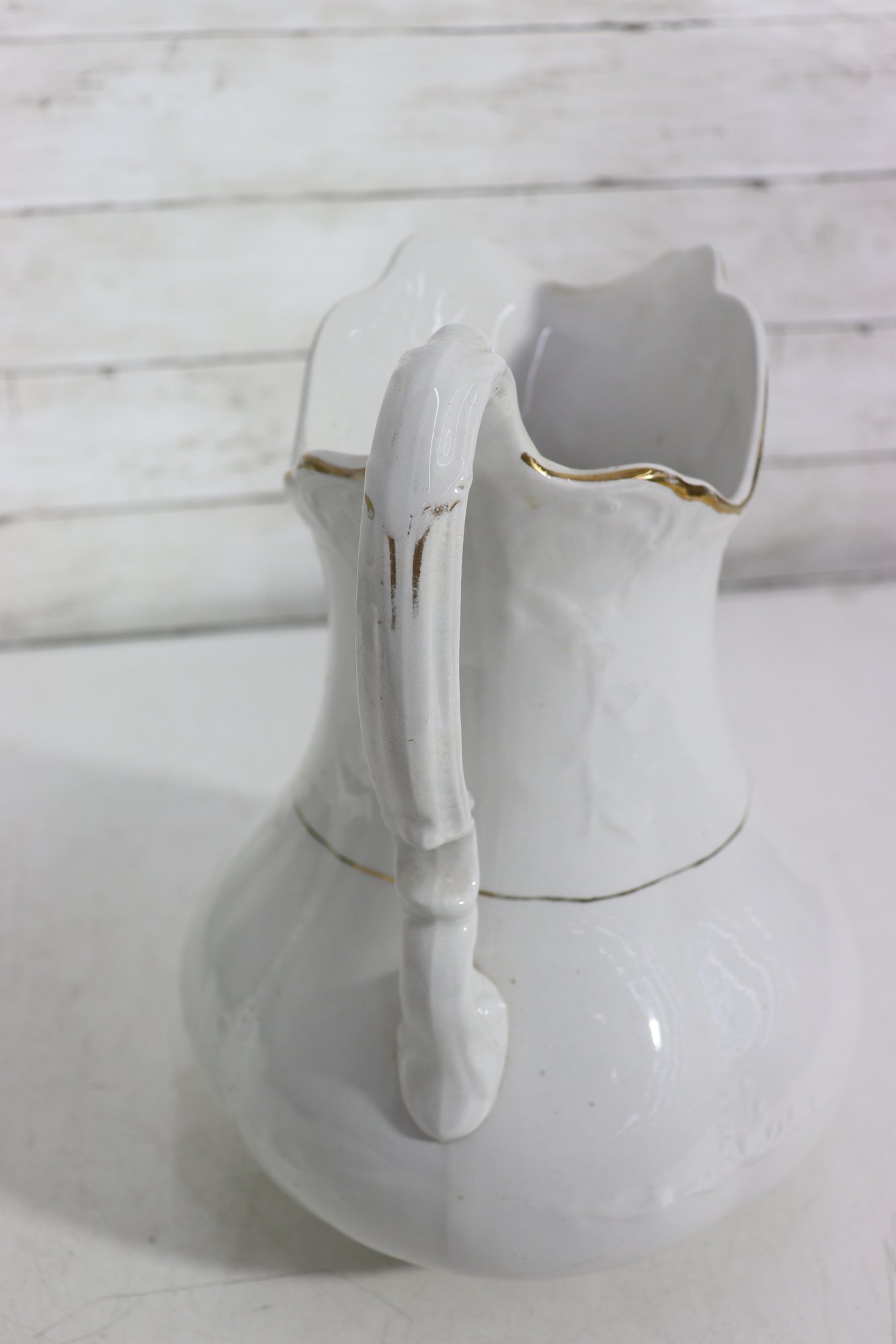 vintage white ironstone bowl and pitcher (ewer) set, featuring a delicate gold floral border around the rim of the bowl and subtle gold accents on the pitcher. This classic pairing reflects traditional English washstand style, making it both a functional decorative set and a charming display piece.