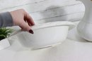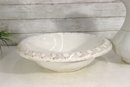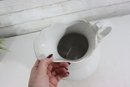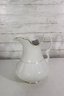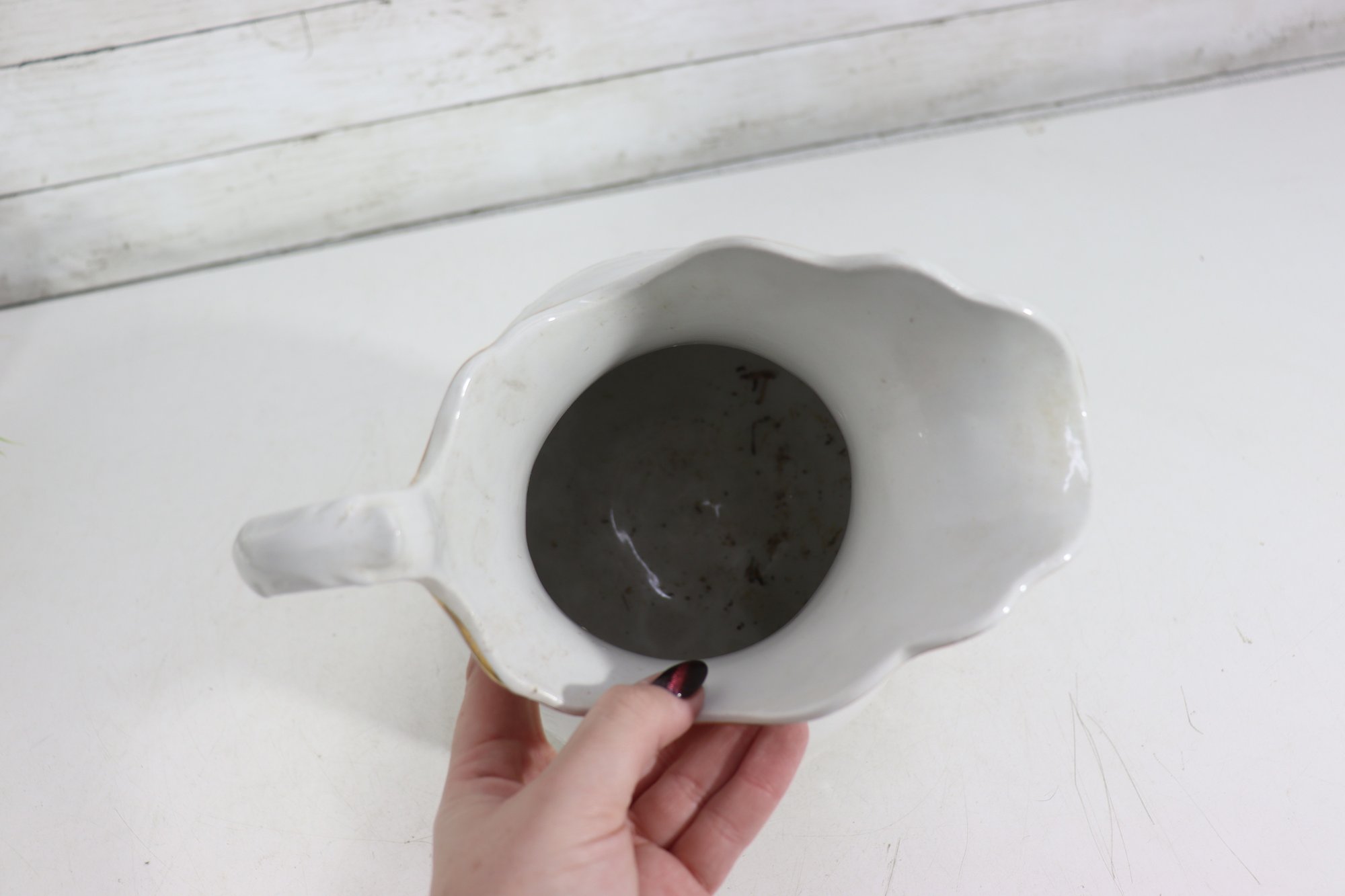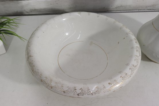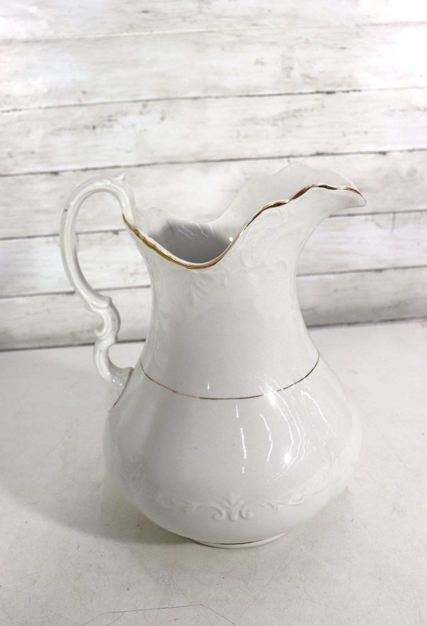 The large round bowl measures approximately 16 inches in diameter, while the matching pitcher stands about 12 inches tall with a graceful curved handle and pouring spout. Together, they create an elegant statement for a bathroom, bedroom, vanity, or antique display.
